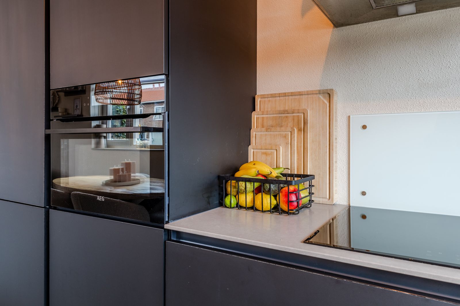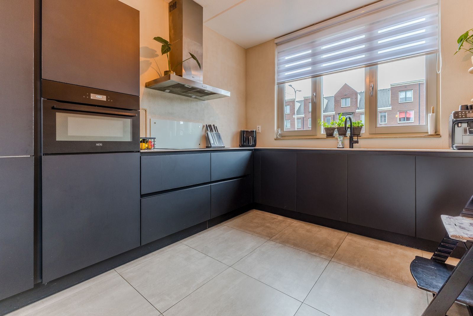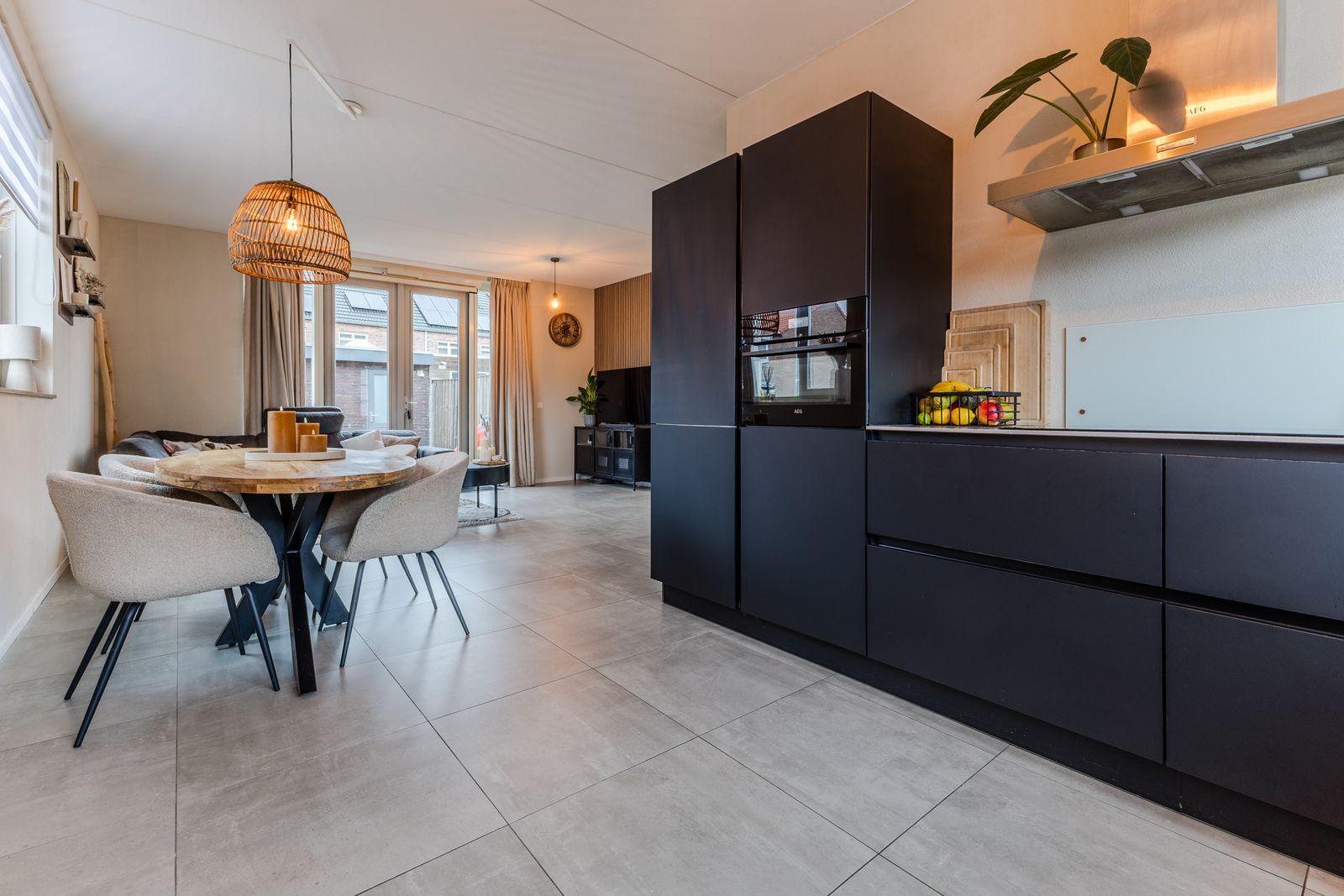 De open keuken aan de voorzijde biedt ruimte voor een grote eettafel en nodigt uit tot samen koken en eten. De keuken is compleet uitgerust met AEG-apparatuur en een Quooker.