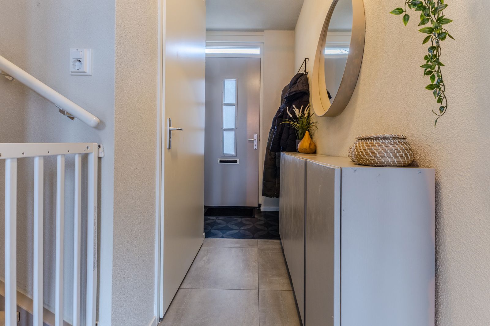 Entree in de hal met meterkast, moderne toiletruimte (voorzien van wandcloset en fonteintje) en trapopgang naar de eerste verdieping.