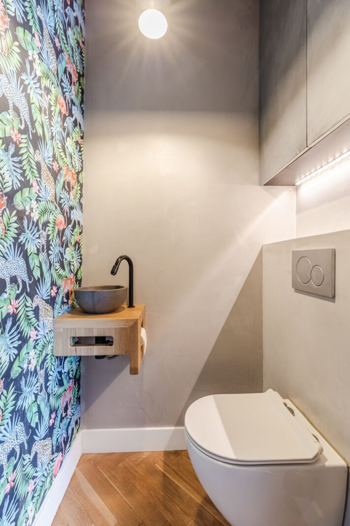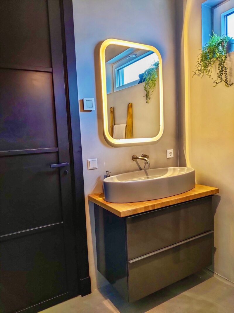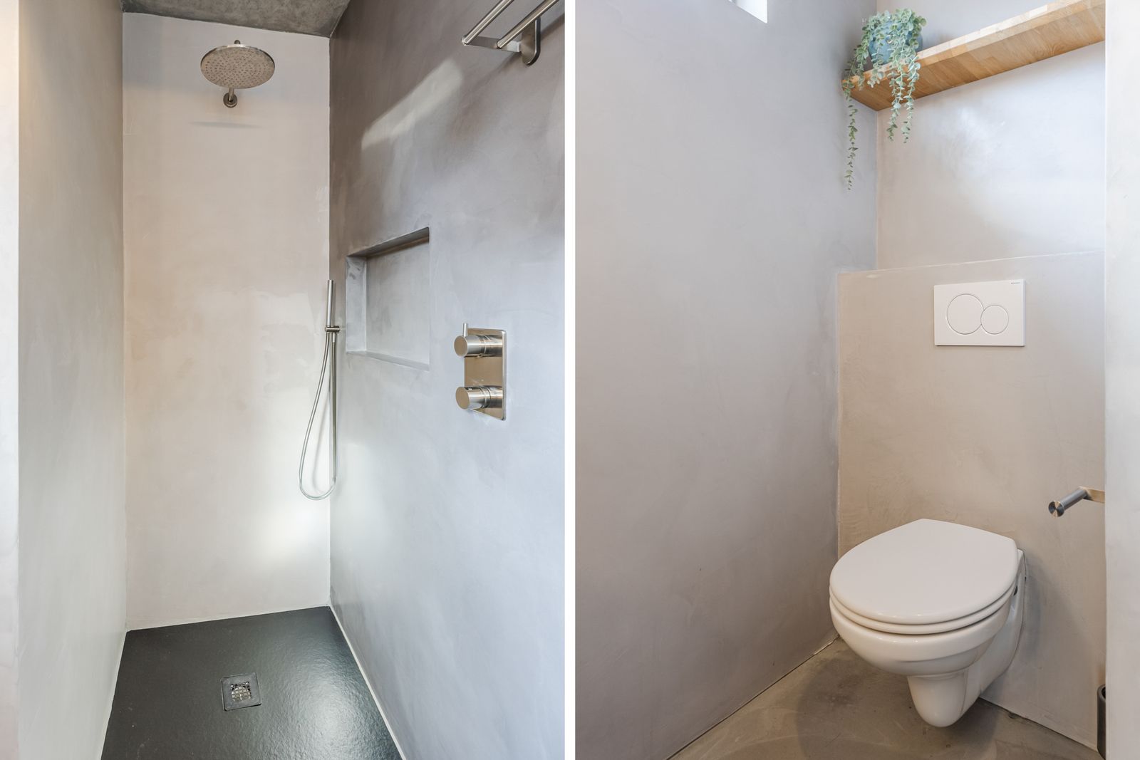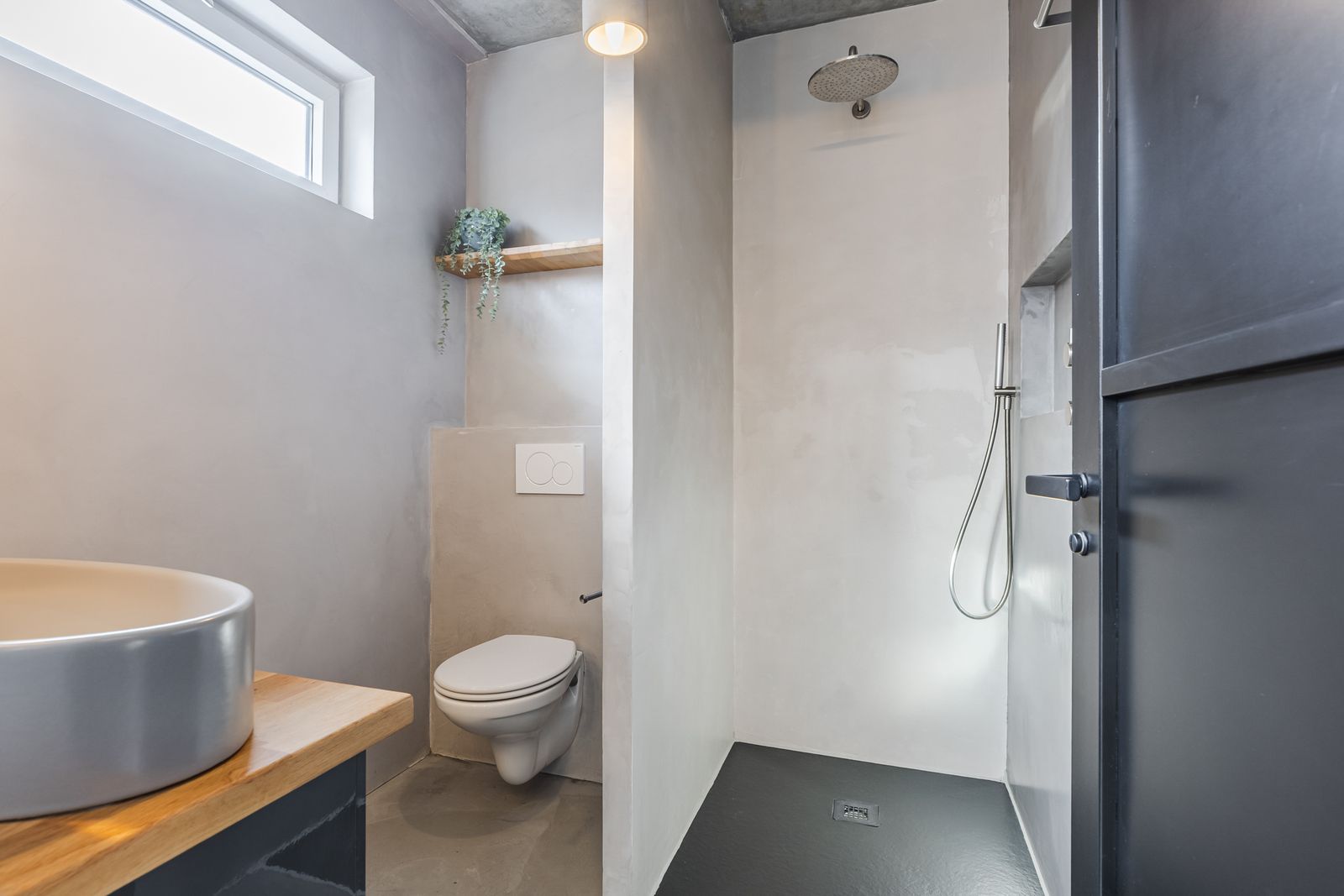 De moderne badkamer is afgewerkt met beton ciré en voorzien van een ruime inloopdouche, wastafelmeubel en toilet.