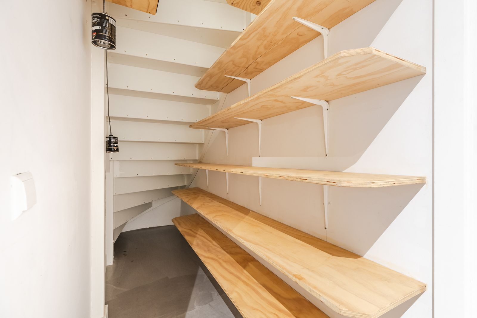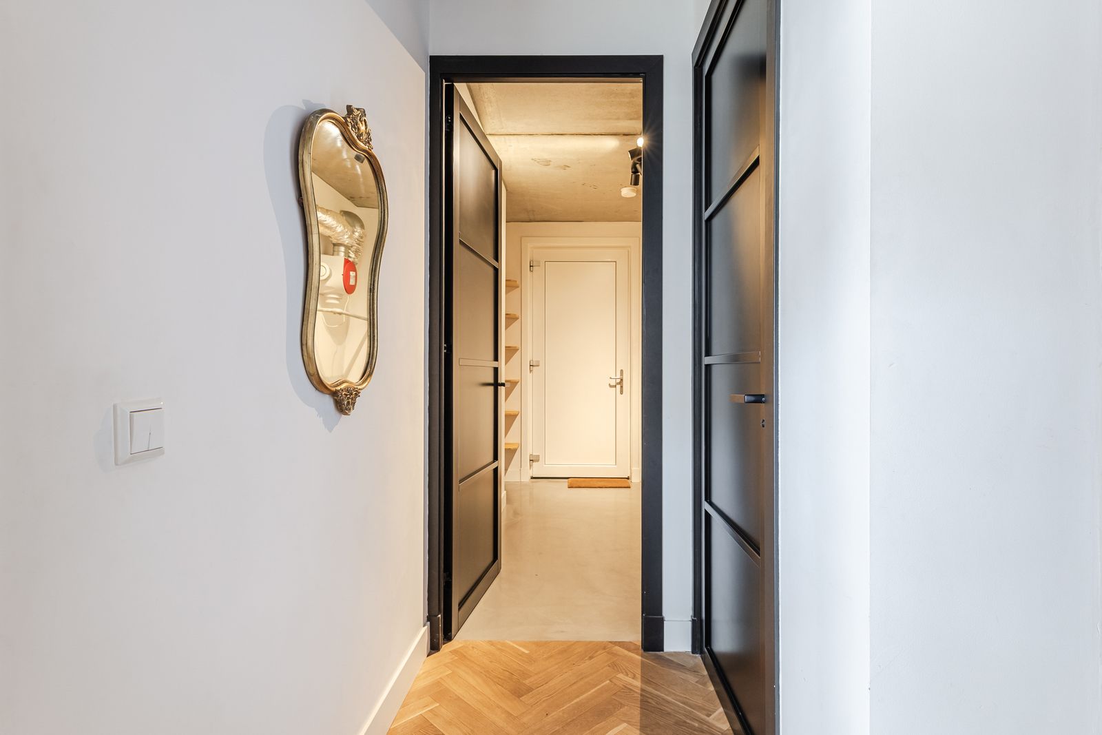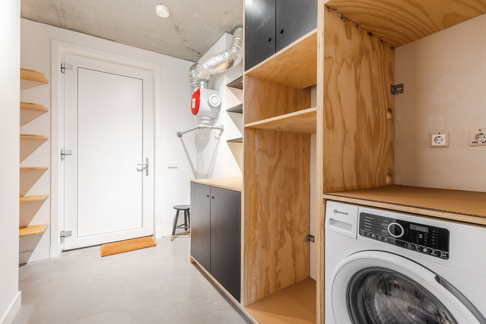 Entree, hal met toegang tot de toiletruimte (voorzien van beton ciré en hangend toilet) en een ruime berging met aansluitingen voor wasmachine en droger en extra opslagruimte. In de berging bevindt zich tevens het ventilatiesysteem en een achteruitgang naar de brandgang.