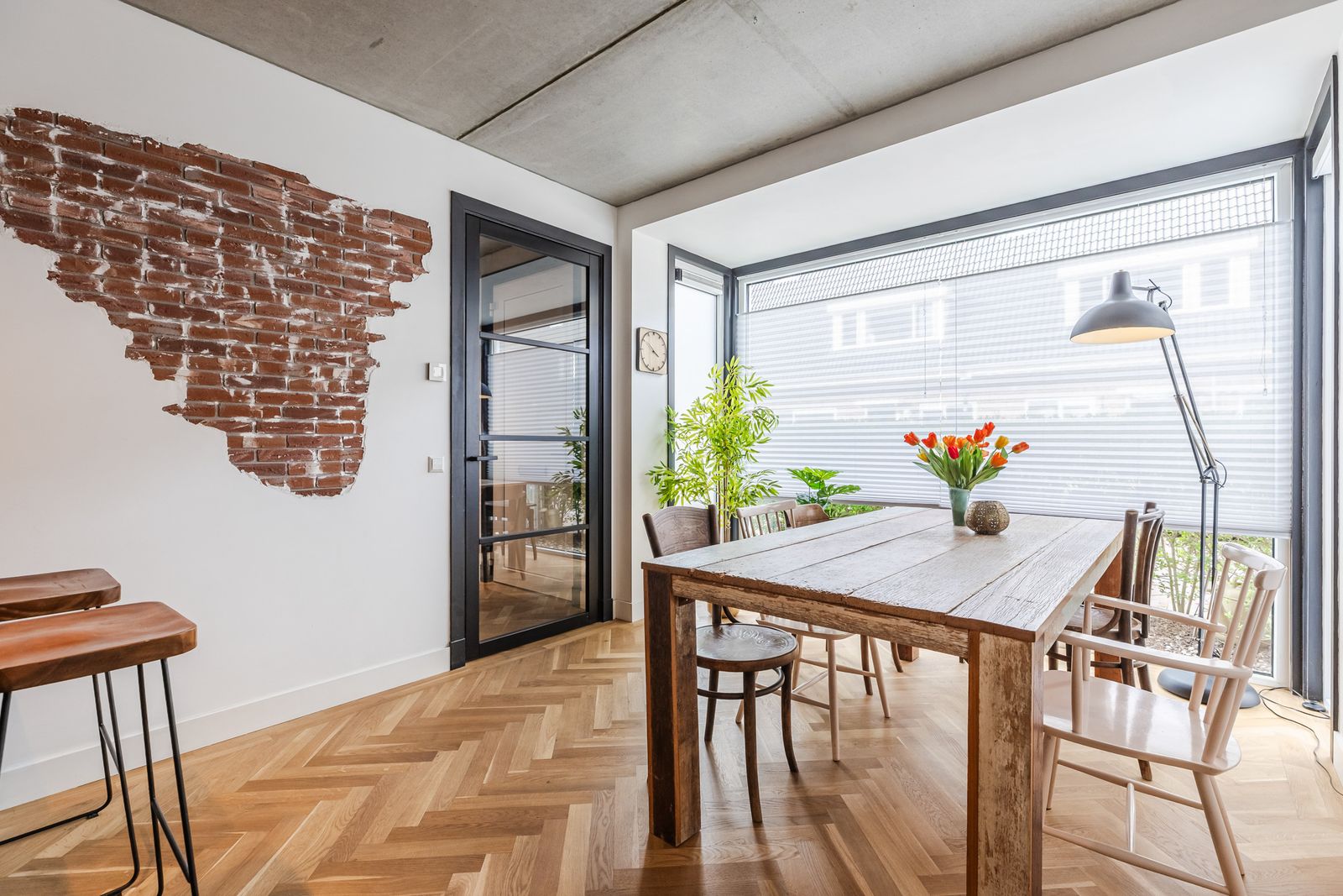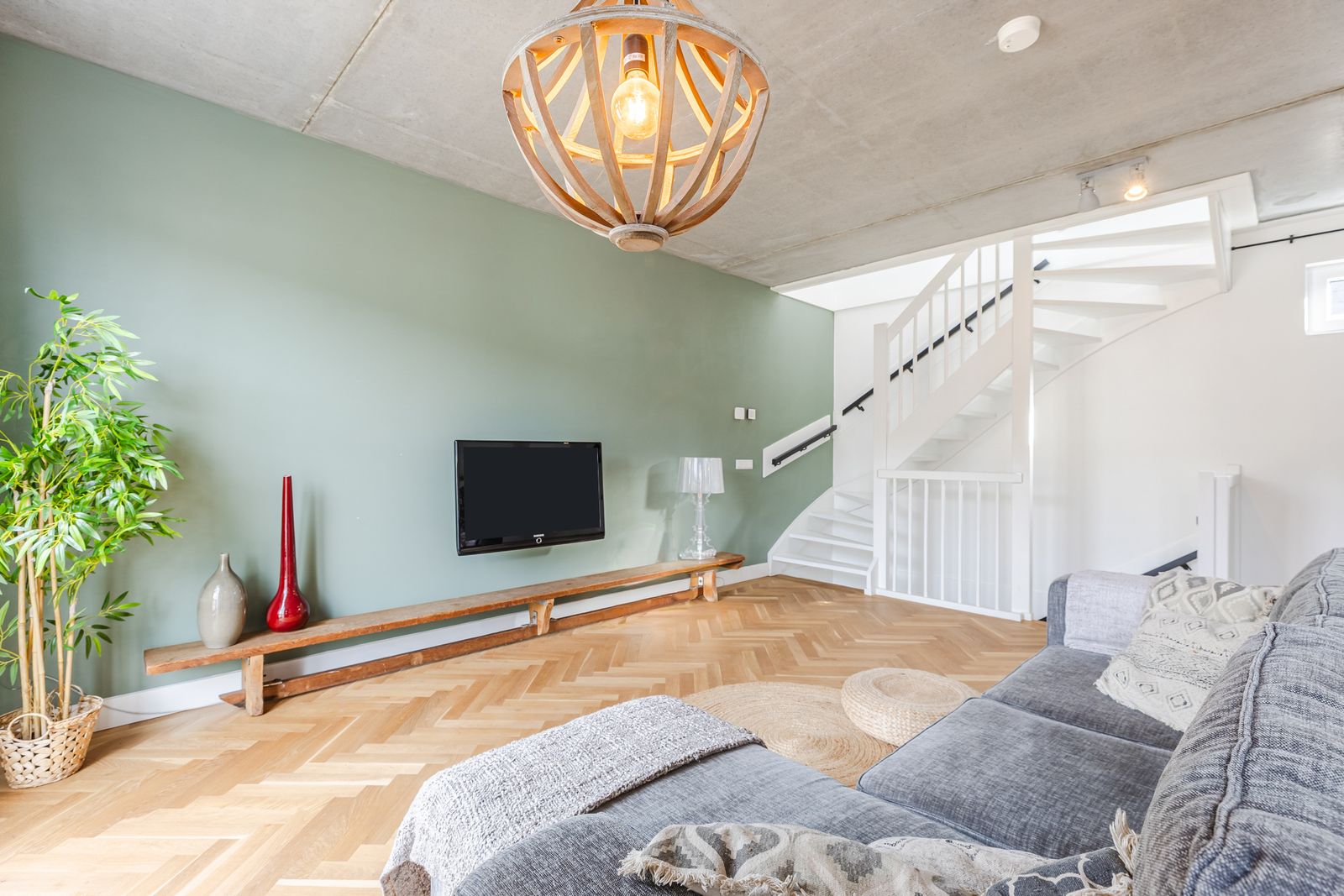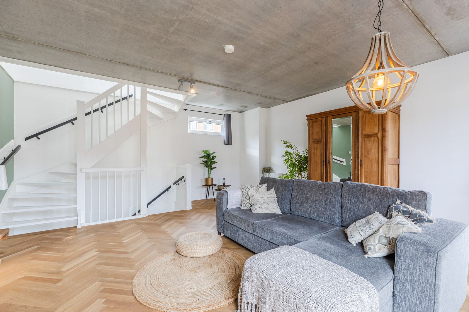 Royale woonkamer over de volledige verdieping met balkon en een fraaie visgraat eiken vloer.