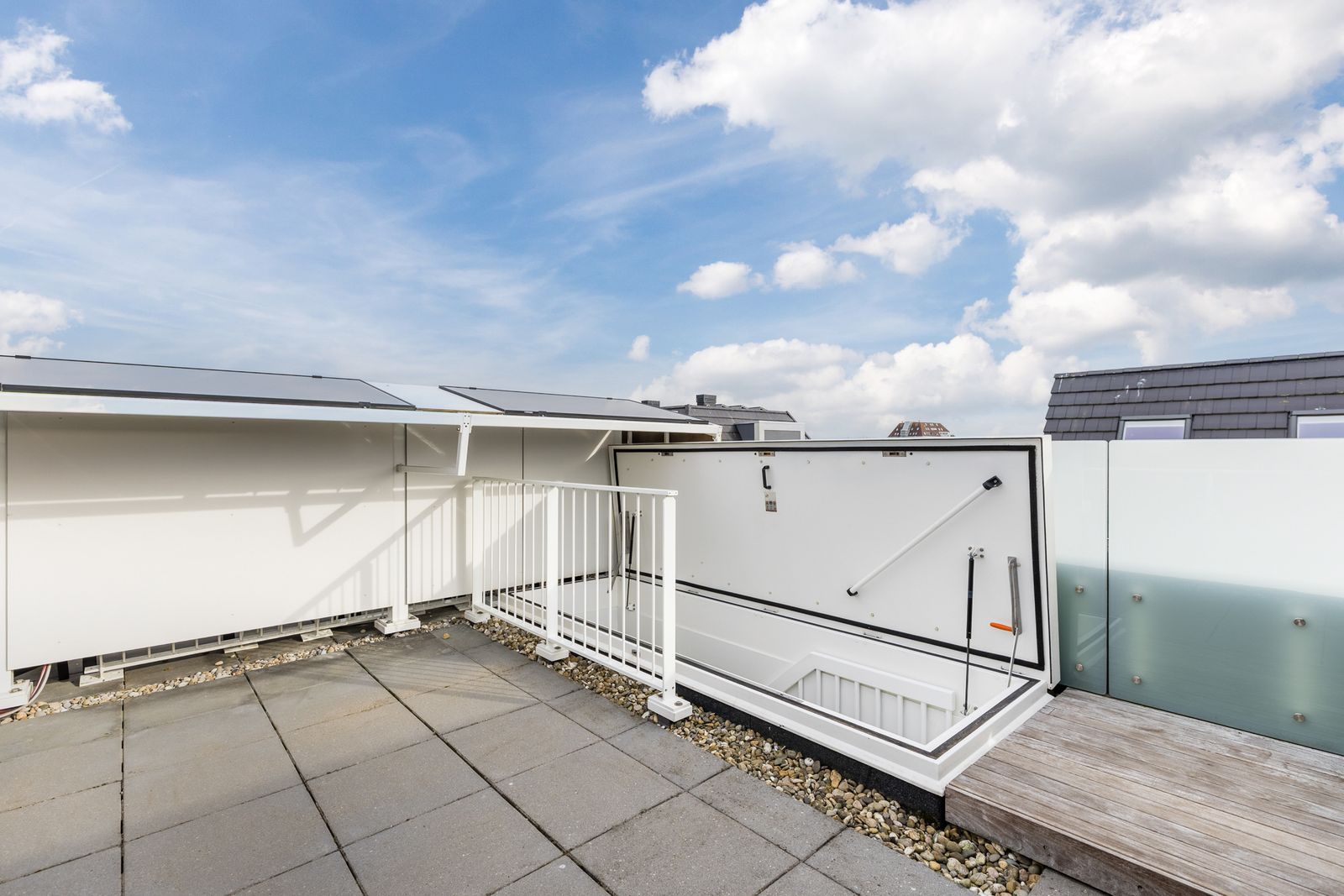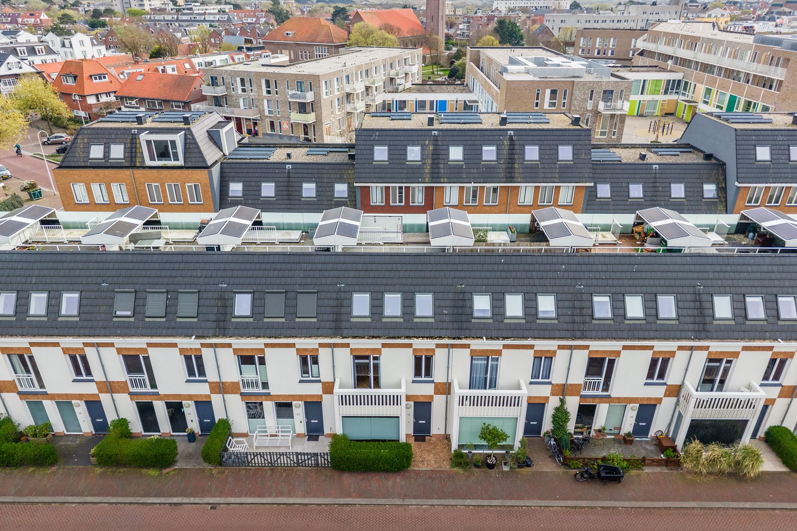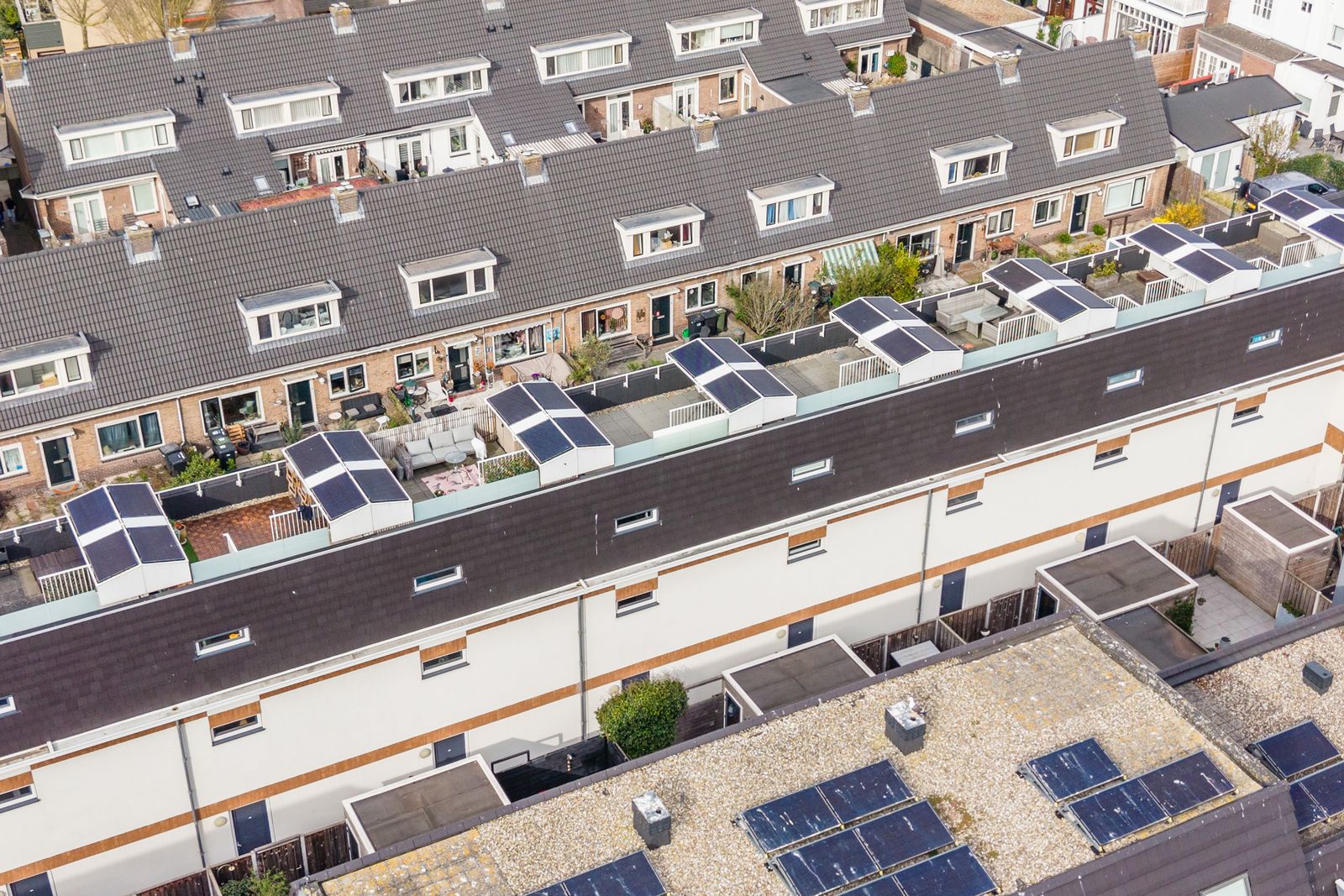 Het dakterras beslaat de volledige oppervlakte van de woning en biedt altijd een zonnige plek. Hier geniet u van een prachtig uitzicht over het centrum van Zandvoort. De zonnepanelen zijn efficiënt verwerkt in de afwerking van het terras.