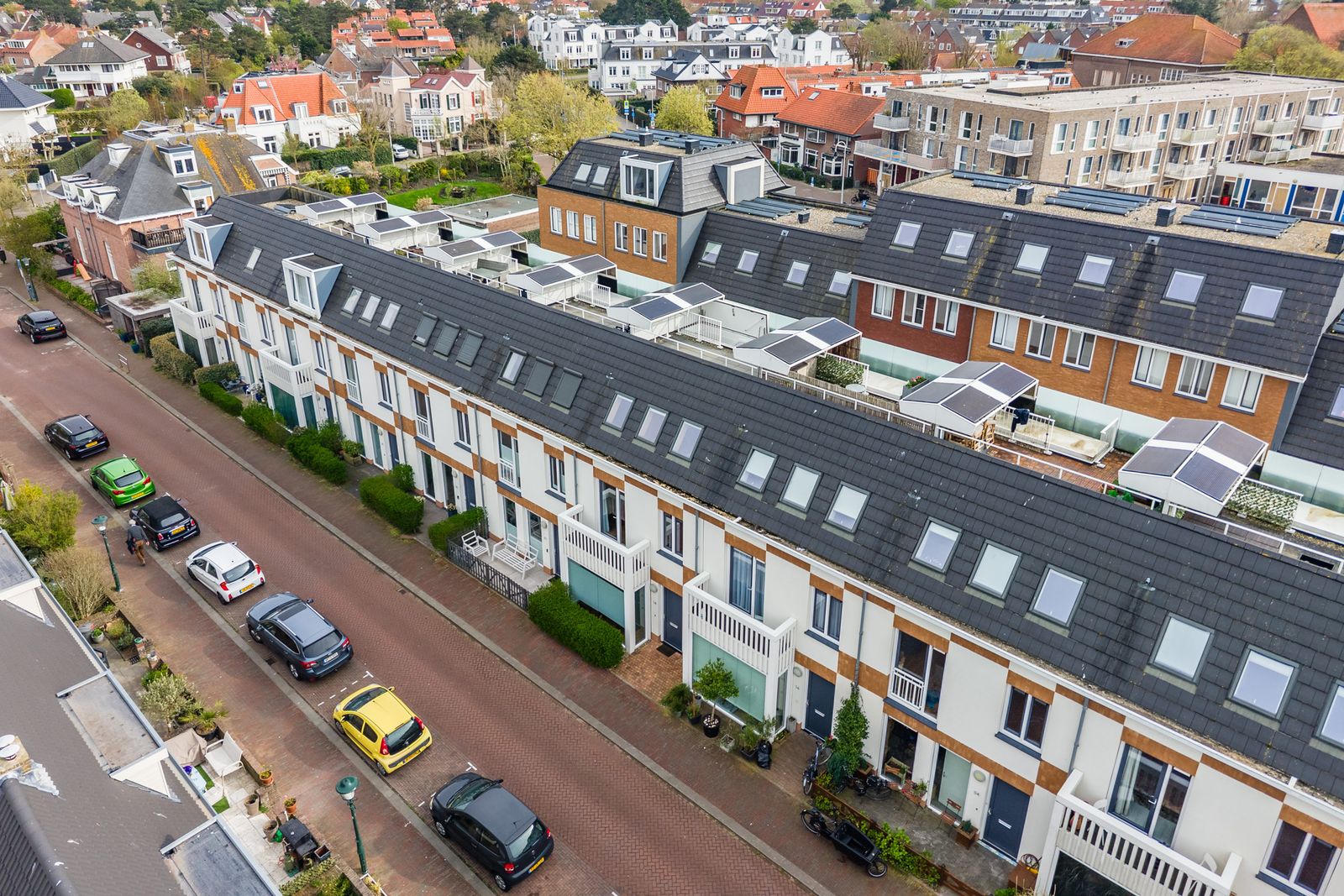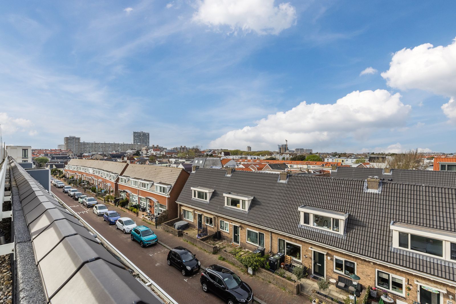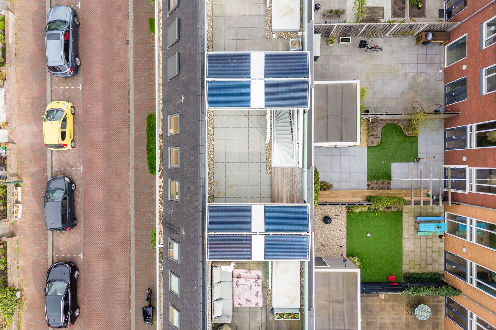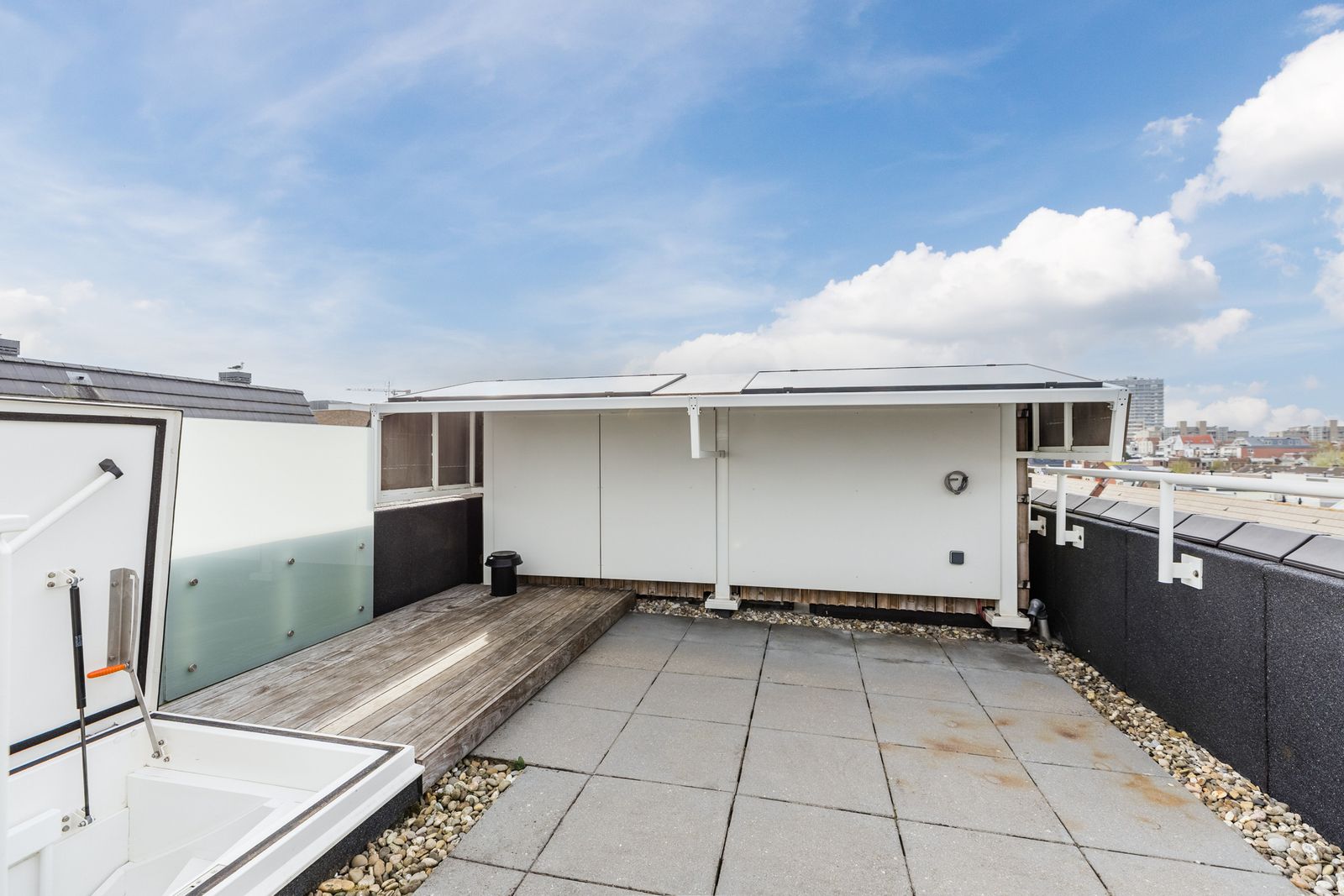 Het dakterras beslaat de volledige oppervlakte van de woning en biedt altijd een zonnige plek. Hier geniet u van een prachtig uitzicht over het centrum van Zandvoort. De zonnepanelen zijn efficiënt verwerkt in de afwerking van het terras.