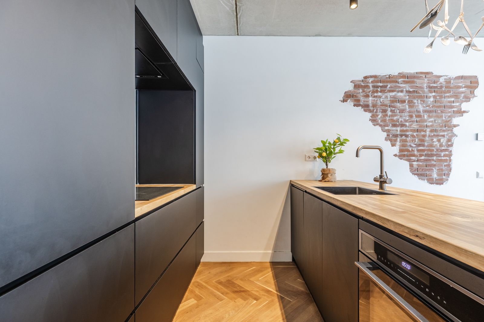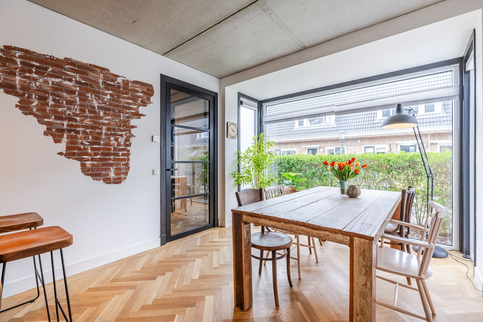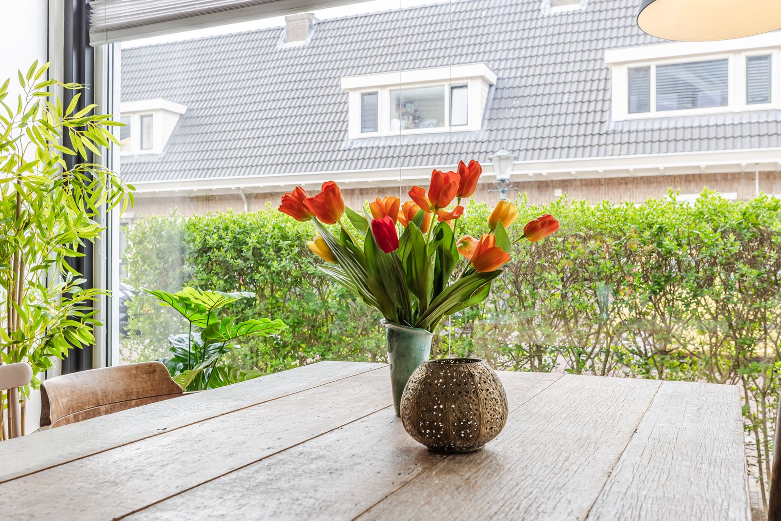 Via een glazen deur bereikt u de ruime en lichte woonkeuken, voorzien van een eiken werkblad en diverse inbouwapparatuur, waaronder een oven, vaatwasser, koelkast met vriesvak, inductiekookplaat en afzuigunit. De erker met grote raampartijen zorgt voor veel daglicht. Er is volop ruimte voor een grote eettafel.