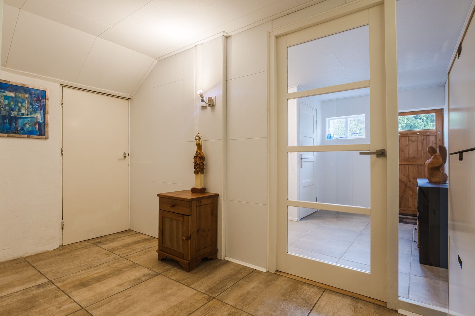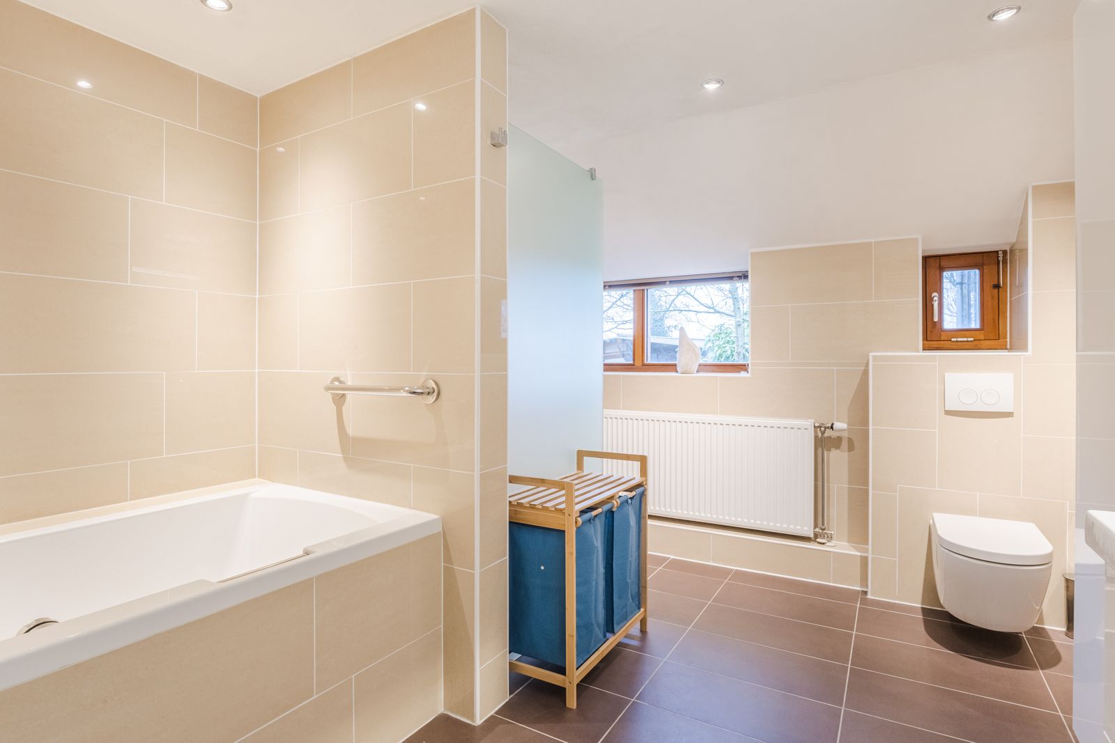 De badkamer (ca. 12 m²) is compleet uitgevoerd met een ruim ligbad, inloopdouche, dubbele wastafel, toilet en vloerverwarming. Daarnaast beschikt de woning over een bijkeuken, separate toiletruimte, technische ruimte (HR-olieketel 2021) en een betimmerde zolder met mogelijkheden.