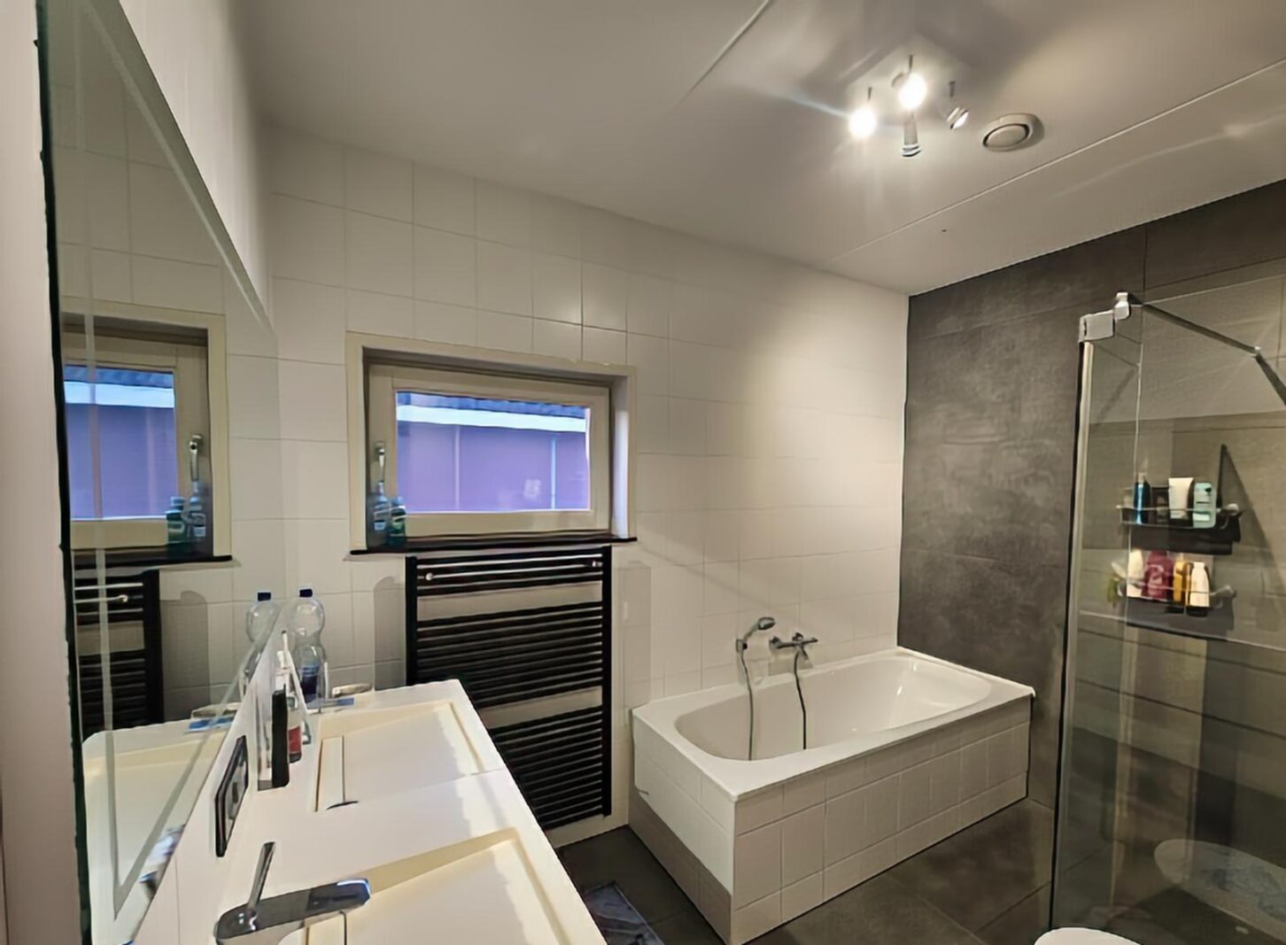 De badkamer is zeer ruim en luxueus afgewerkt. Deze is voorzien van een hangend toilet, een dubbel wastafelmeubel, een royale inloopdouche, een comfortabel ligbad en een handdoekradiator.