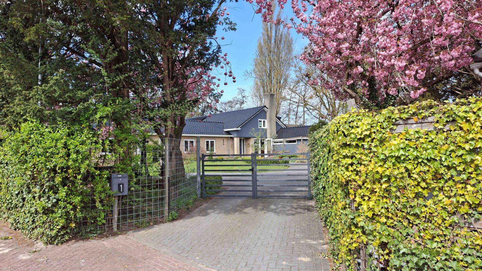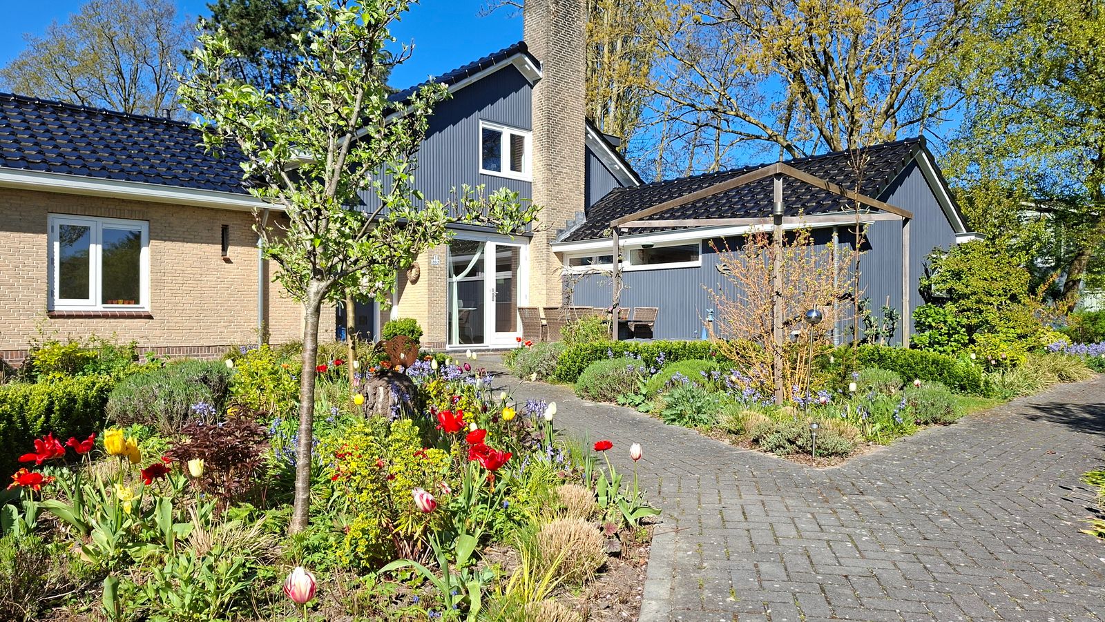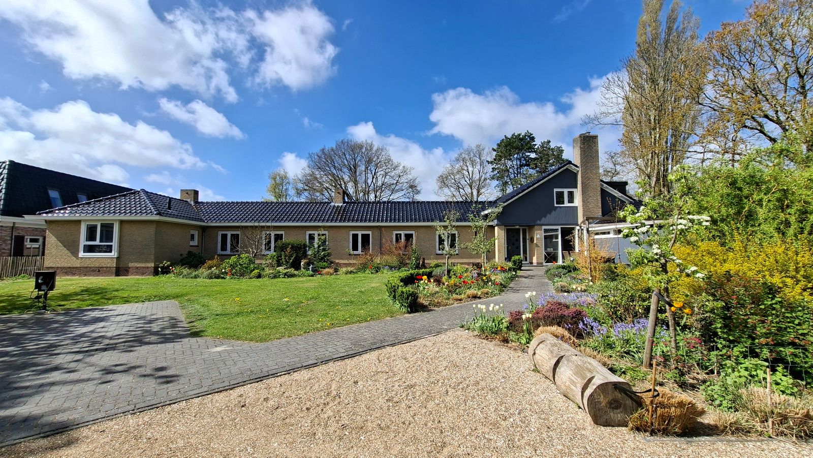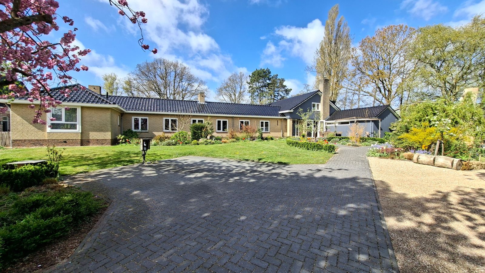 Je rijdt de oprijlaan op met parkeergelegenheid voor 3 à 4 auto’s voorzien van twee elektrische laadpunten. Aan de rechterzijde een garage met daar achter een nostalgisch huisje voor het stookhout.