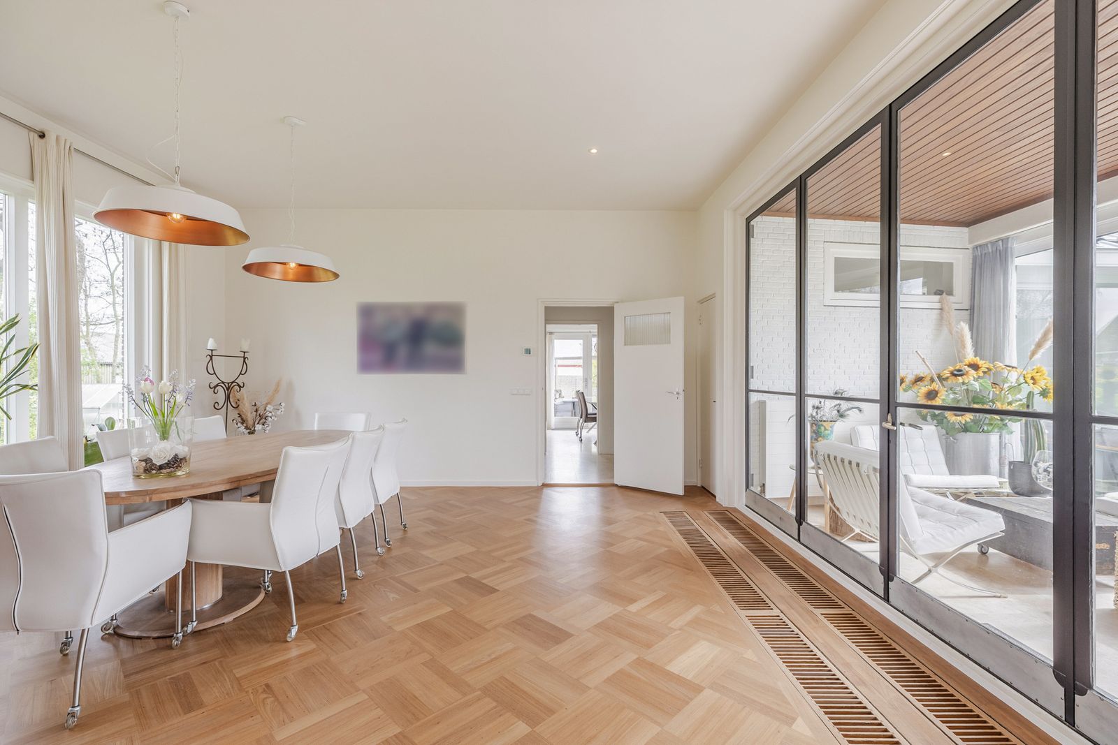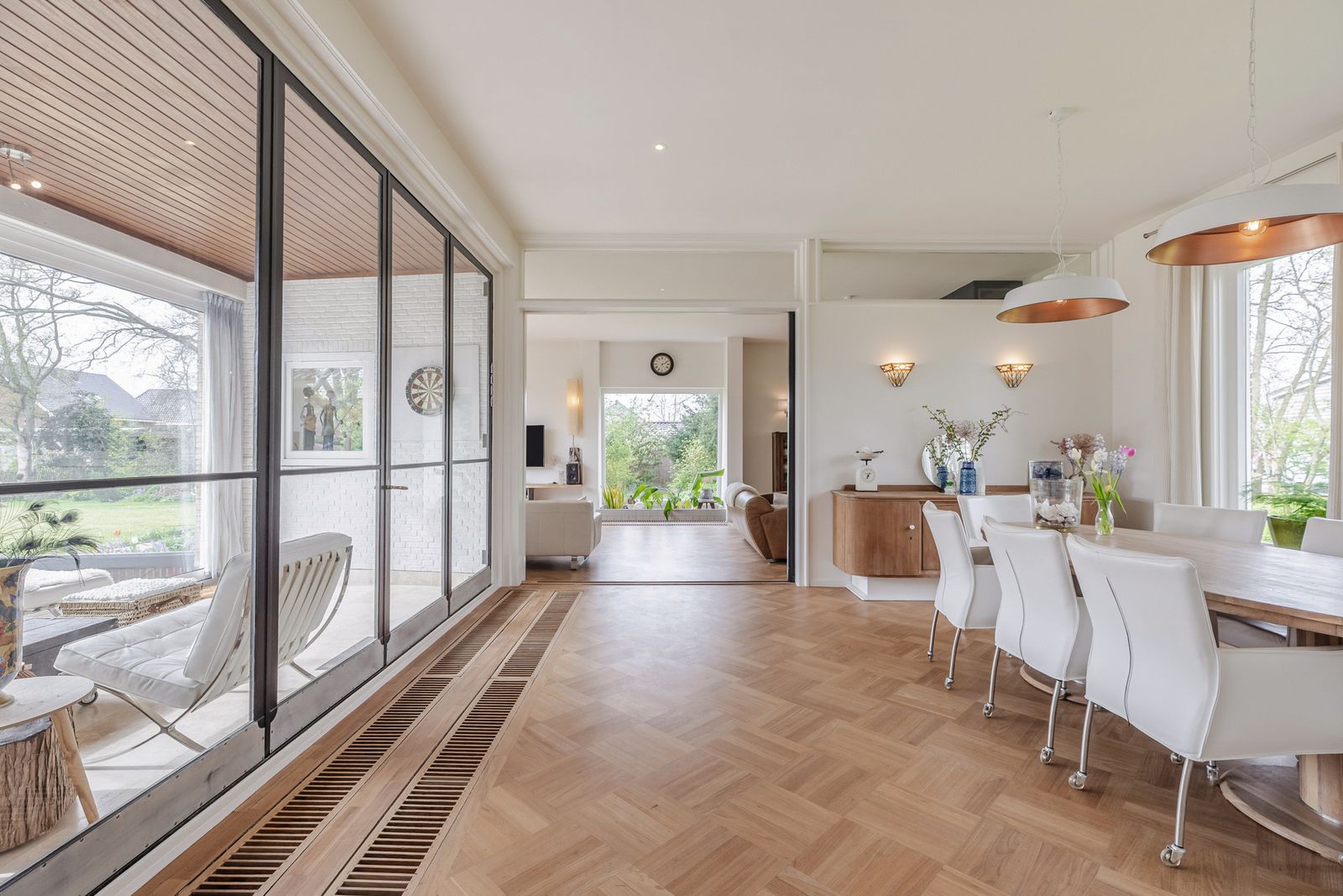 De eetkamer aan de andere zijde van de hal is met de grote stalen deuren verbonden met de serre en de woonkamer is toegankelijk via de grote schuifdeur. De eet- en woonkamer zijn voorzien van eikenhouten parketvloeren. In de woonkamer bevindt zich de brede inbouw houtkachel.