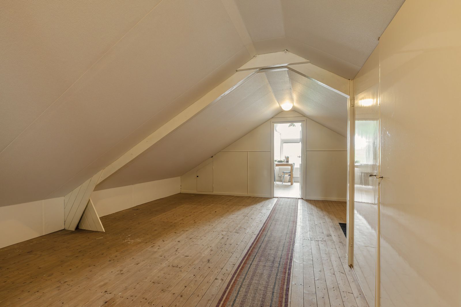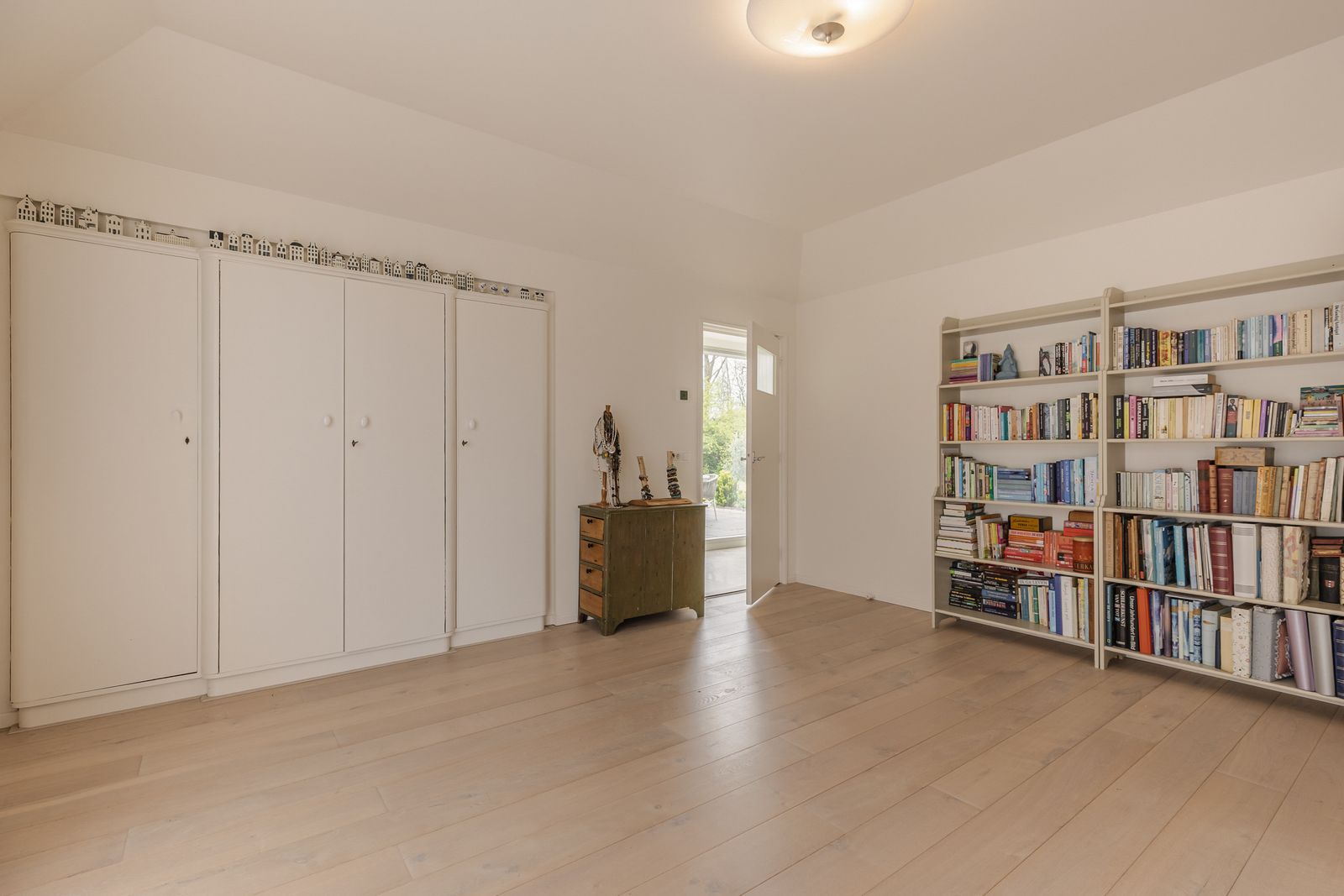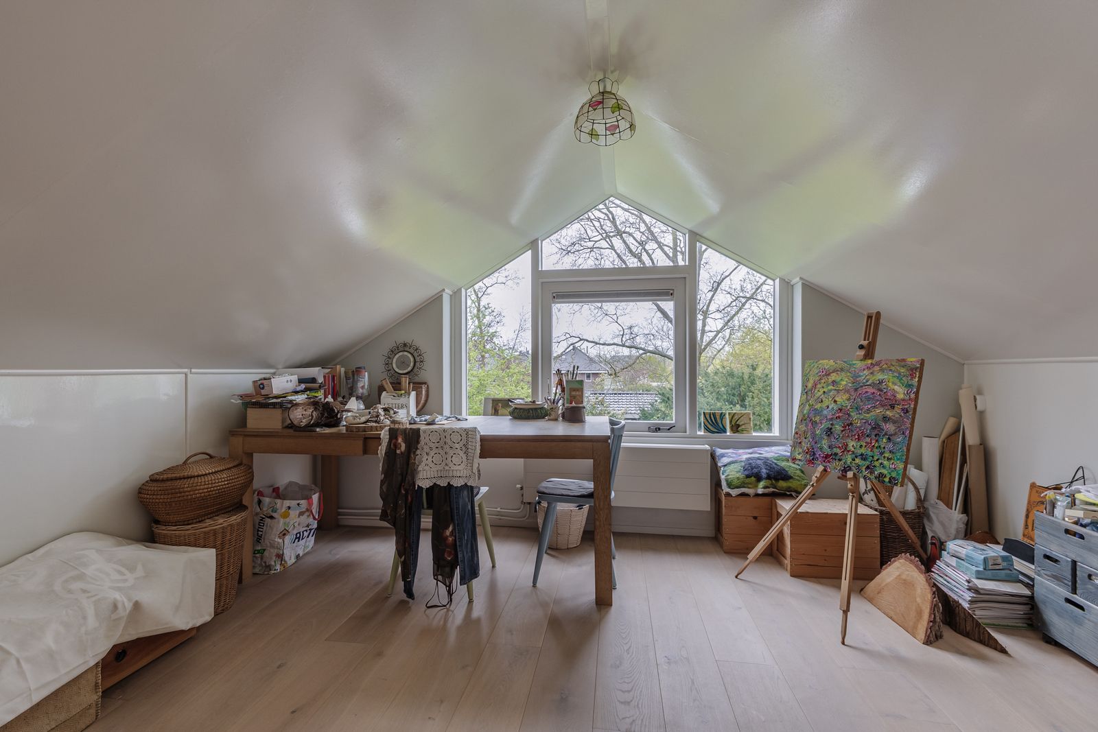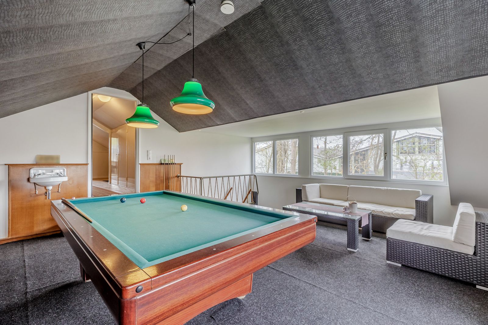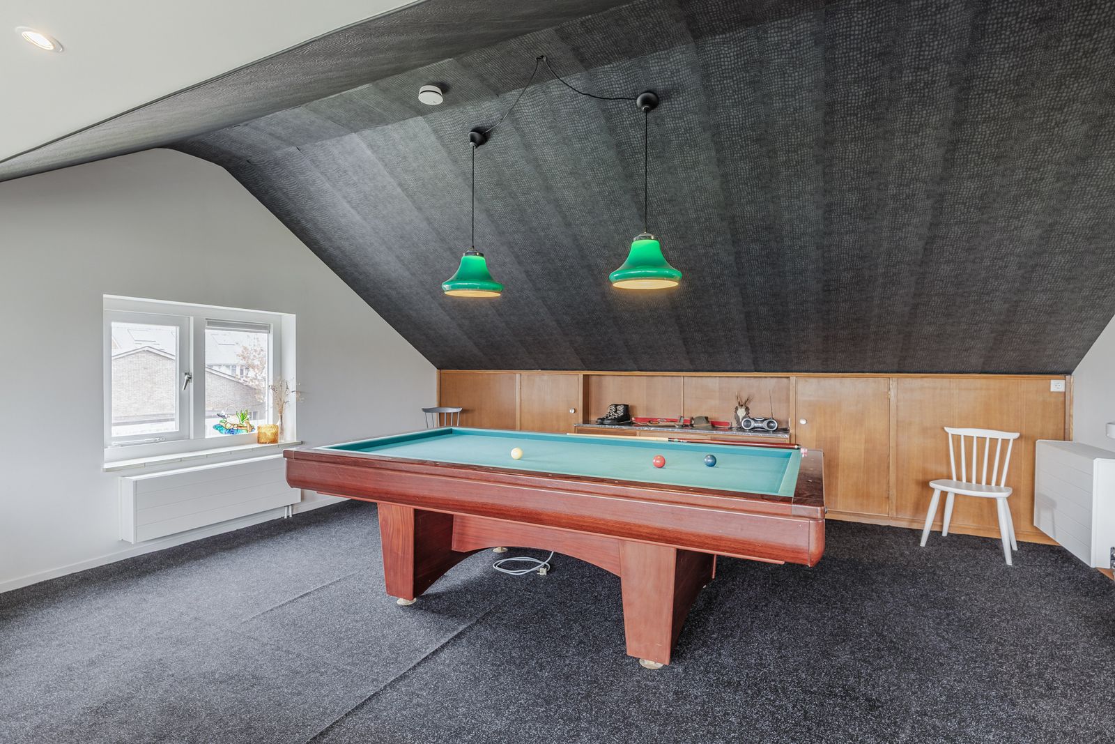 Op de bovenverdieping is nu een biljartkamer, deze is als 6e slaapkamer te gebruiken. Er is veel licht in deze ruimte door het 5 meter lange onderhoudsvrije dakkapel. De originele inbouwkastjes en wasbakje zijn nog bewaard gebleven. Vanuit hier naar een lange doorgangsruimte met inbouwkasten. En aan het eind een creatief atelier met zicht op de tuin. De bovenverdieping biedt ruimte om naar eigen wens in te vullen.
