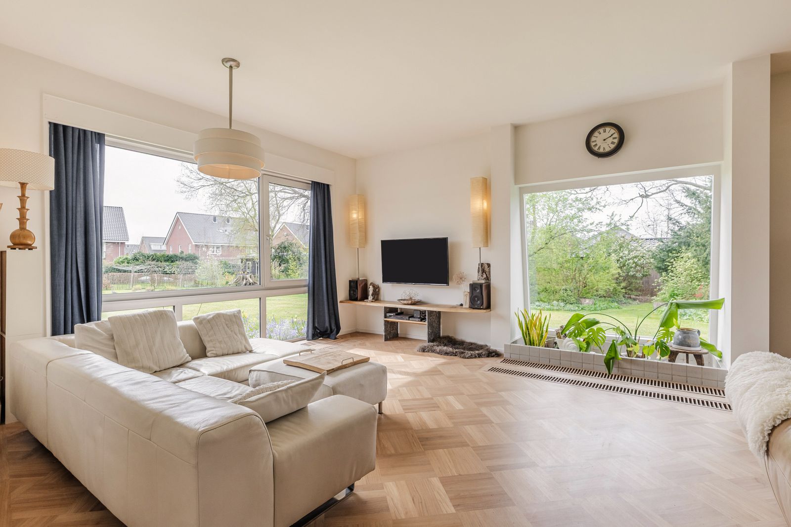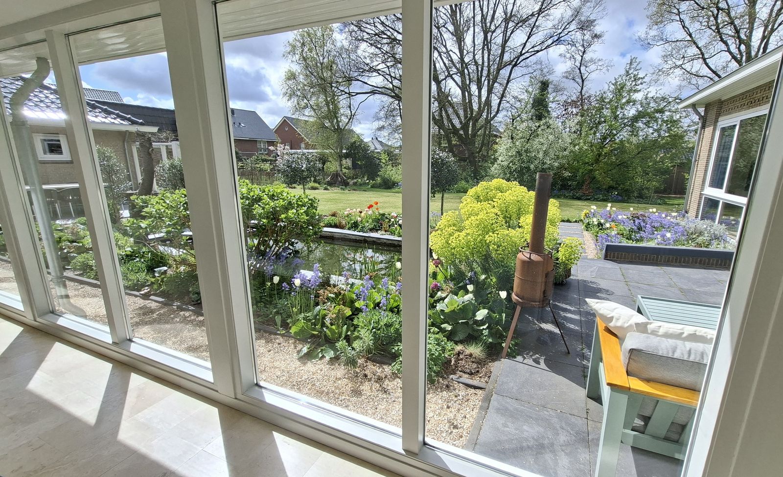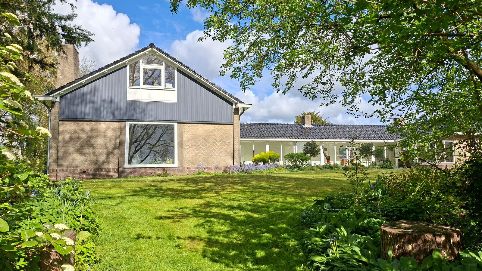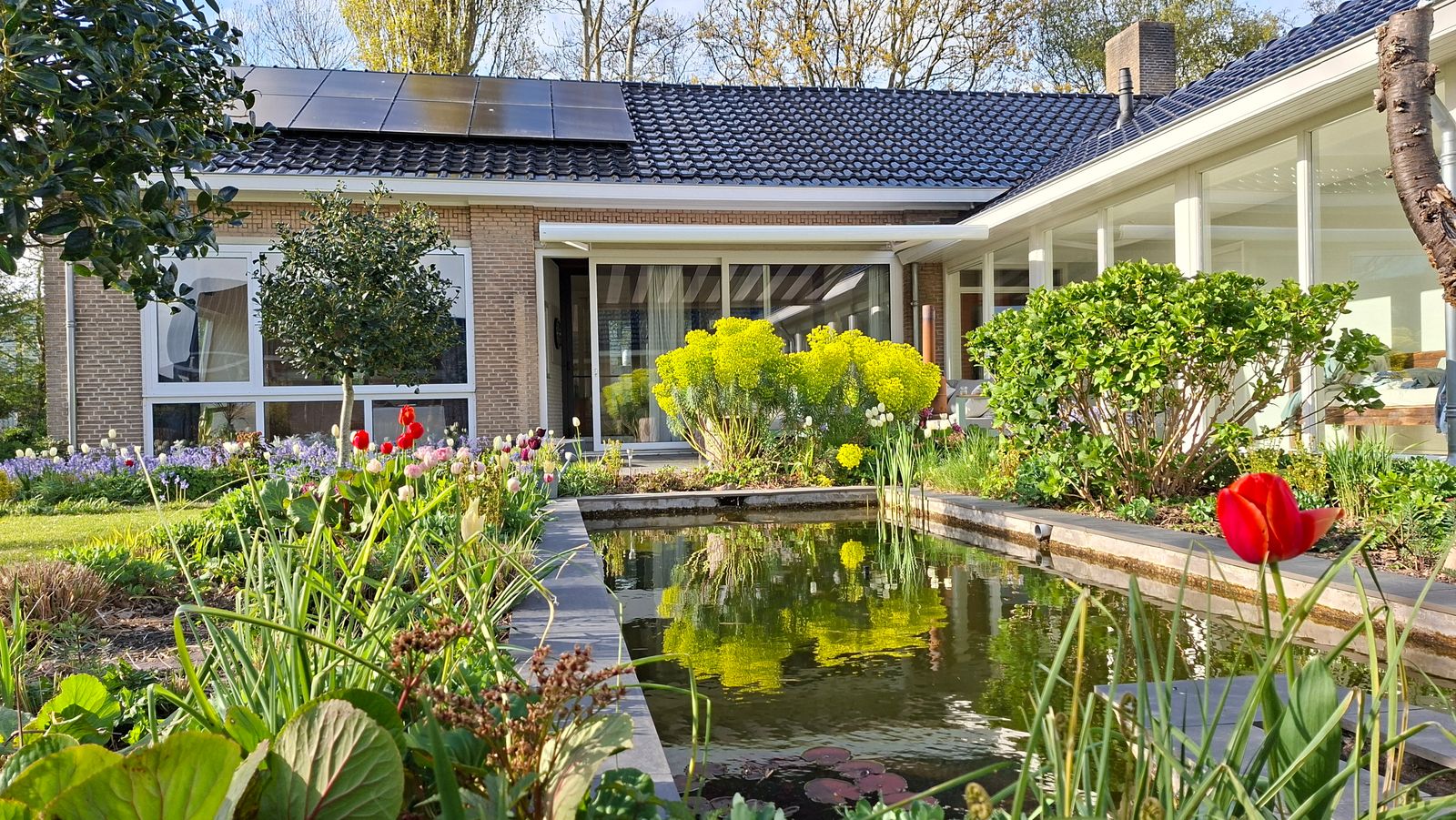 De semi-bungalow woning ligt in een U-vorm om de sfeervolle vijver met een fontein, waardoor je vanuit elke ruimte uitzicht hebt op het groen en het water. Ontbijt in de ochtendzon op het terras bij de keuken, of geniet van de middag- en avondzon op twee terrassen direct aan de vijver. De tuin is omzoomd door volwassen bomen en er is een weids groen uitzicht vanuit elke kamer.