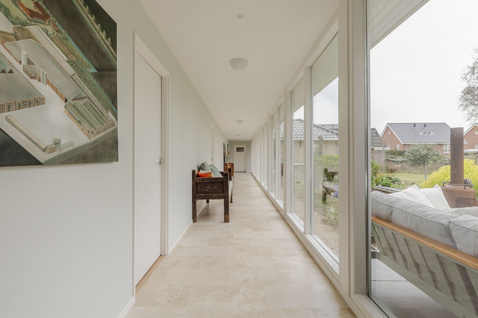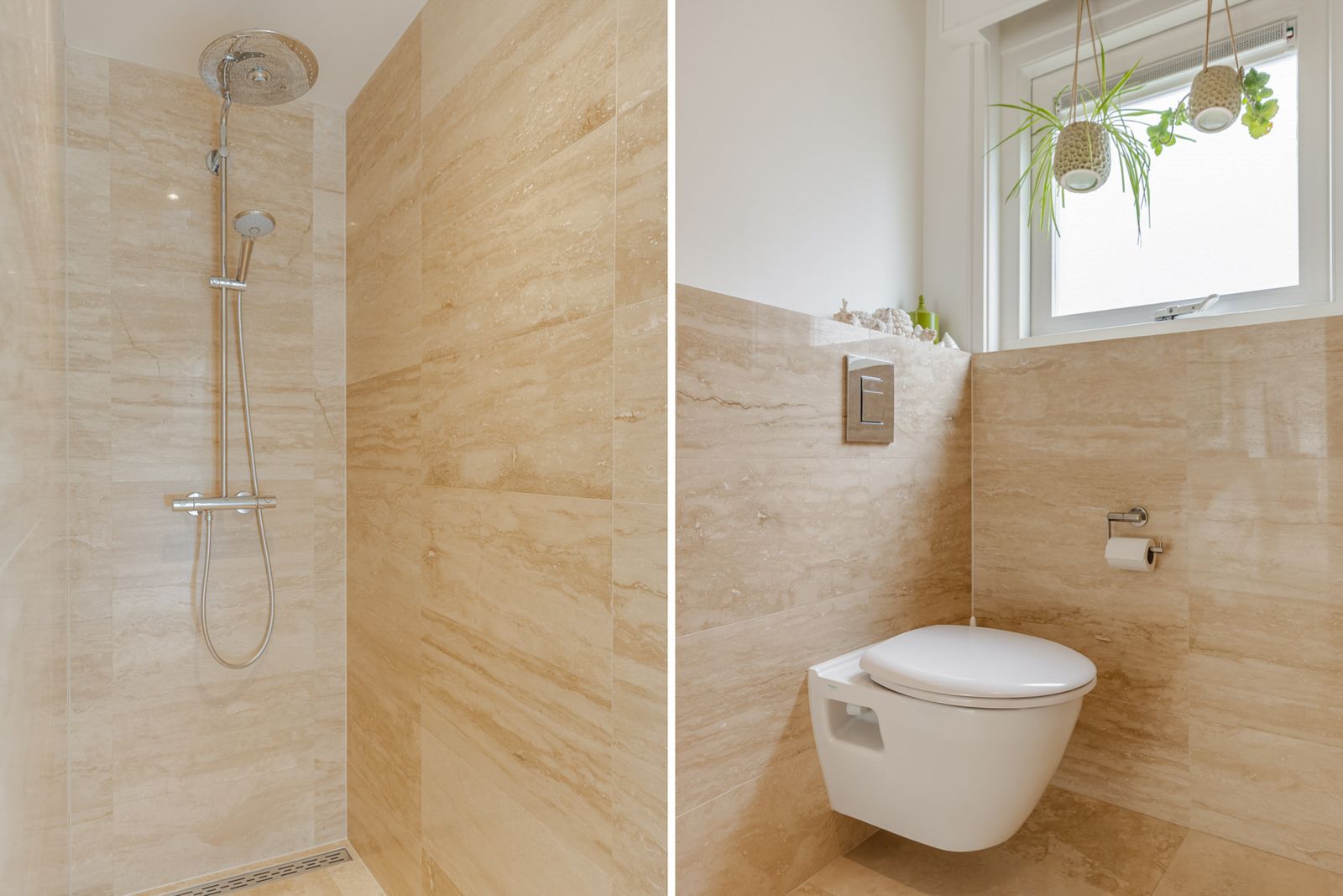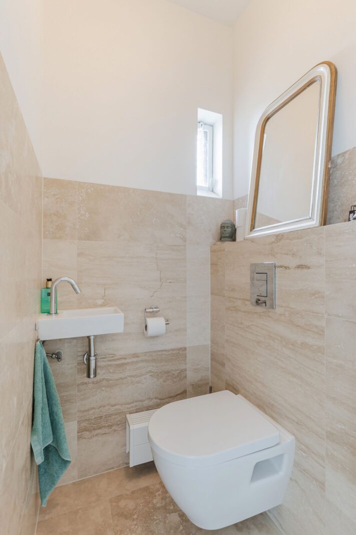 De keuken, toilet, entree, hal, serre, lange gang, grote badkamer zijn allen voorzien van travertin tegels op de vloeren en een gedeelte van de muren in toilet en badkamer.