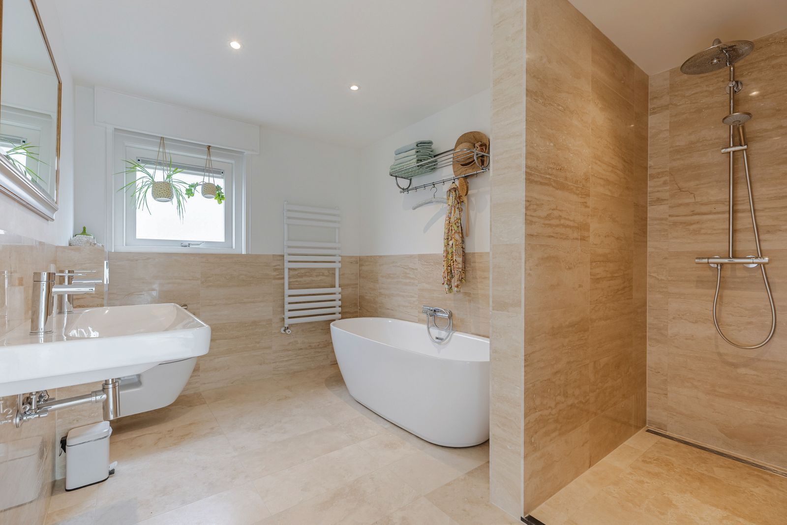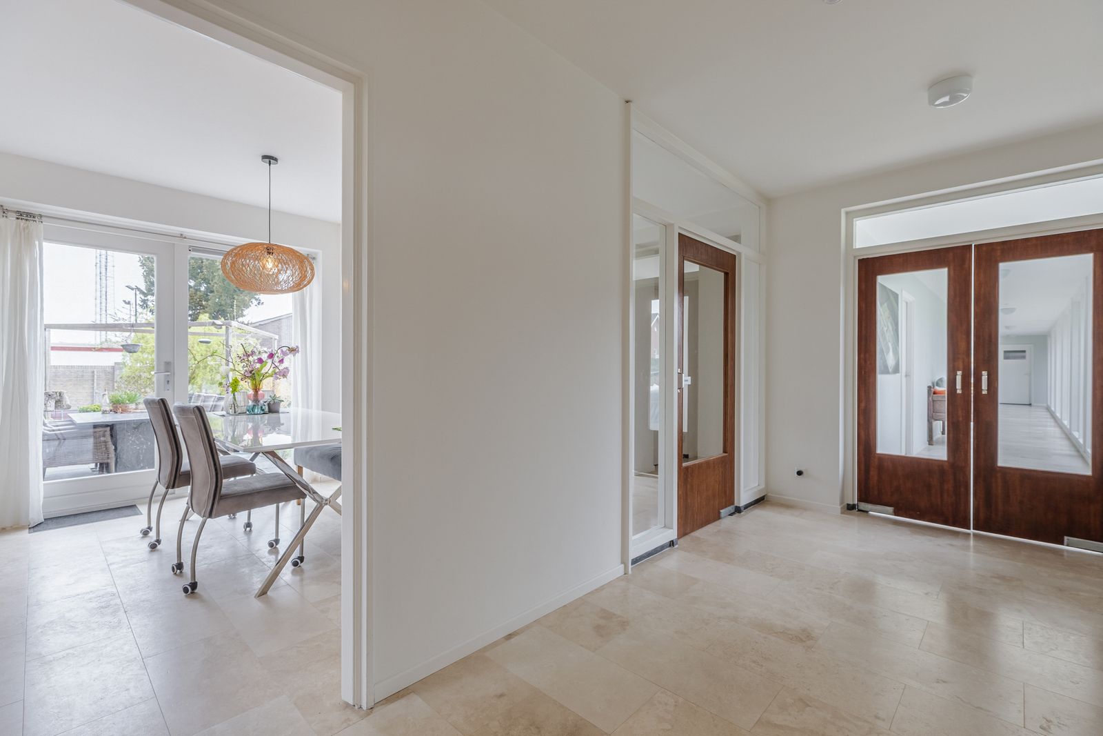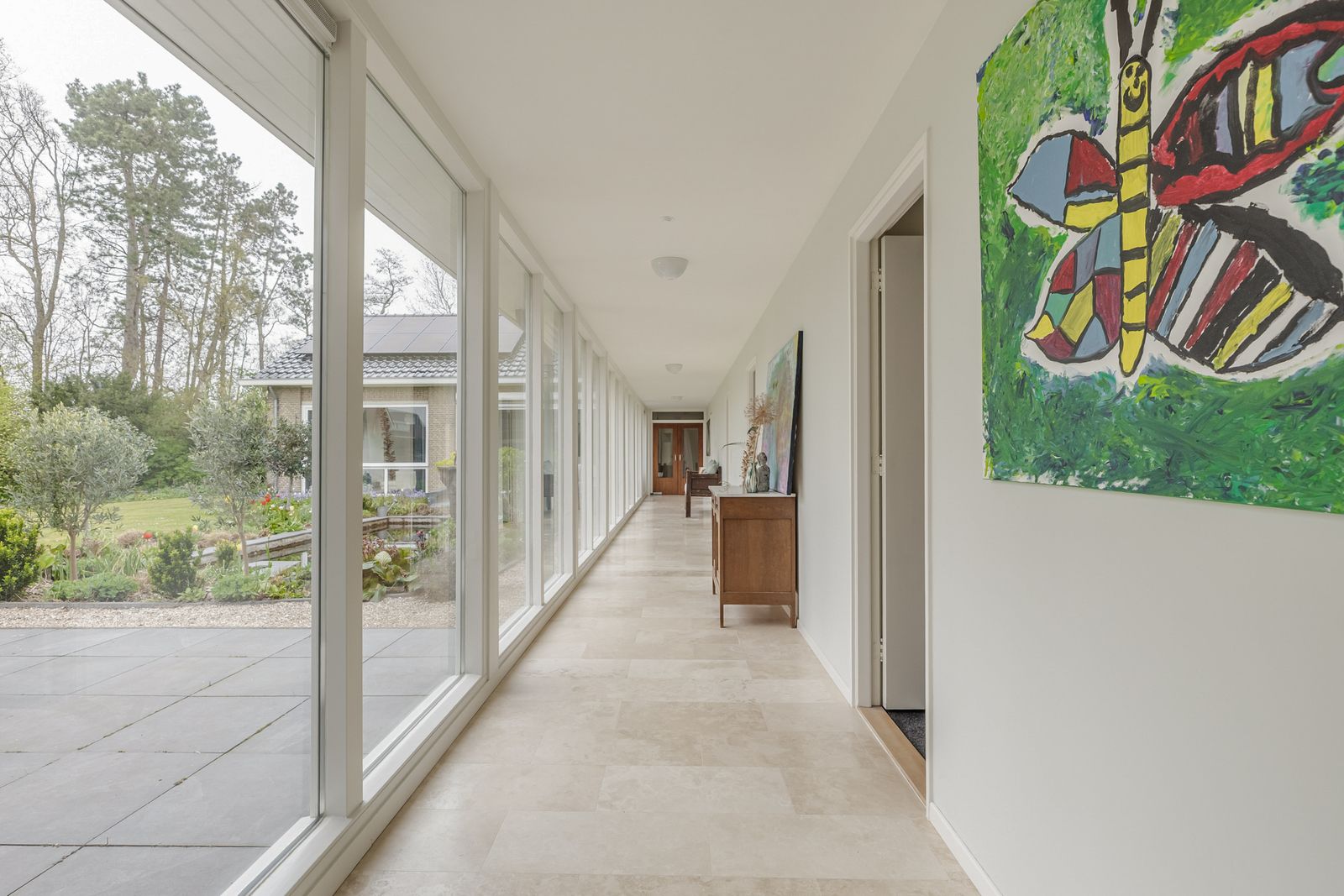 De keuken, toilet, entree, hal, serre, lange gang, grote badkamer zijn allen voorzien van travertin tegels op de vloeren en een gedeelte van de muren in toilet en badkamer.