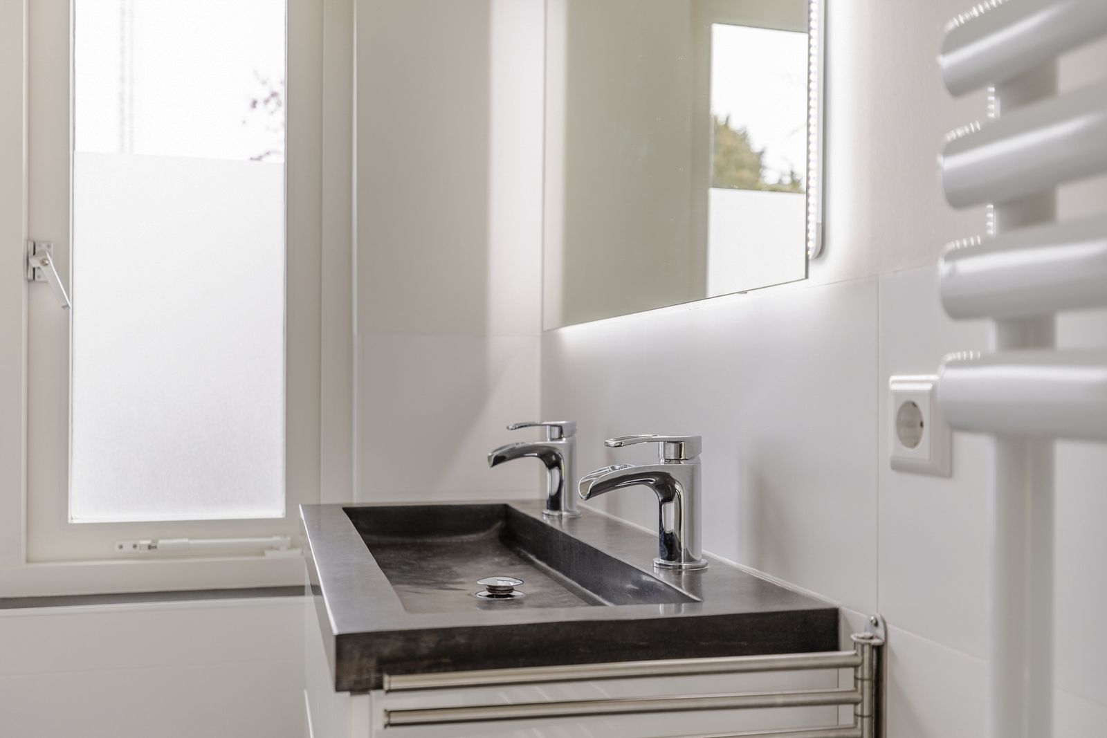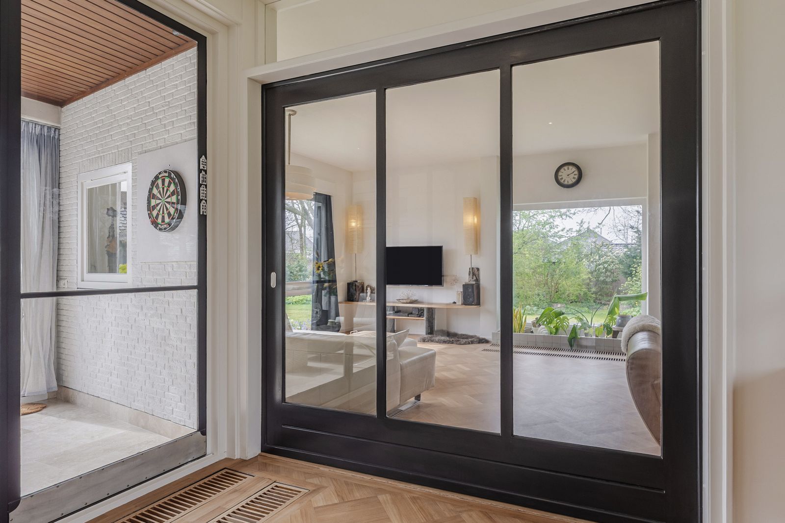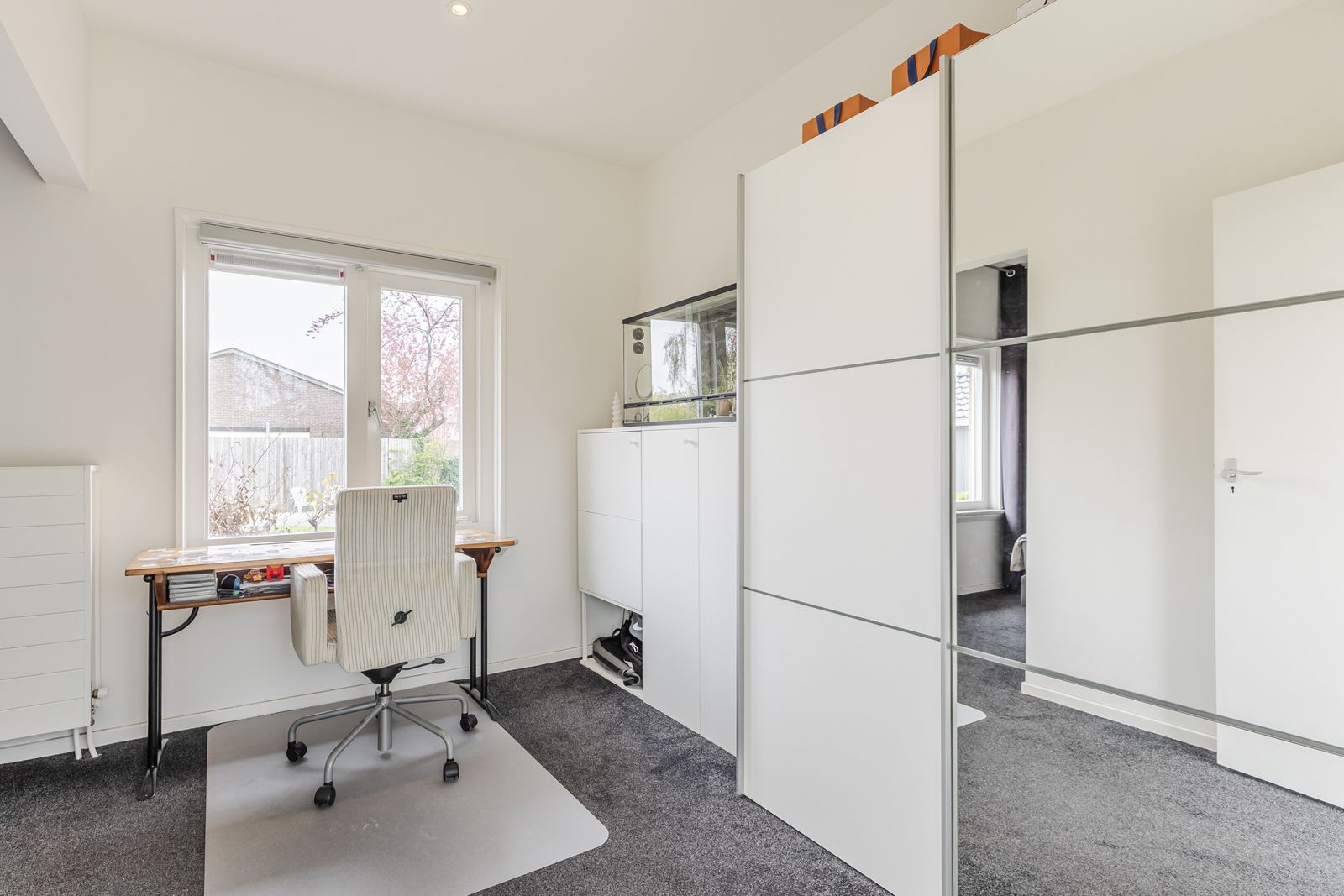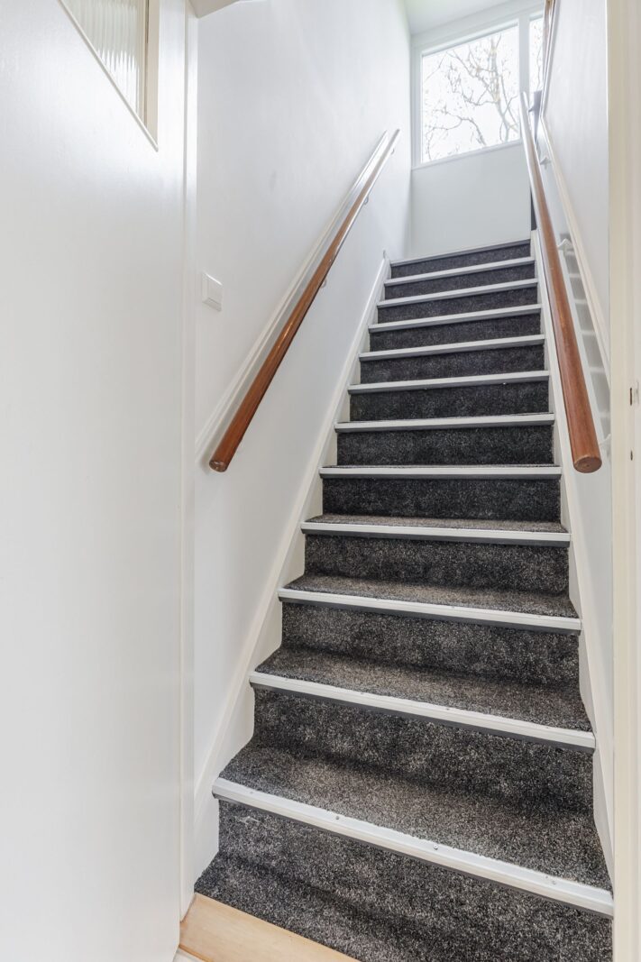 De originele details – zoals de imposante stalen serredeuren van 2,8 meter hoog, de grote glazen schuifdeur tussen woon- en eetkamer en de inbouwkasten – zijn behouden gebleven. Tijdens de volledige renovatie in 2019 is het huis naar de huidige maatstaven gebracht: nieuwe dakbedekking en een grote dakkapel, een groot aantal nieuwe deuren en raamkozijnen, volledige isolatie, nieuw stucwerk aan muren en plafonds, elektra, water, verwarming en datakabels, 12 zonnepanelen en een hybride warmtepomp zijn de voornaamste vernieuwingen in het huis.