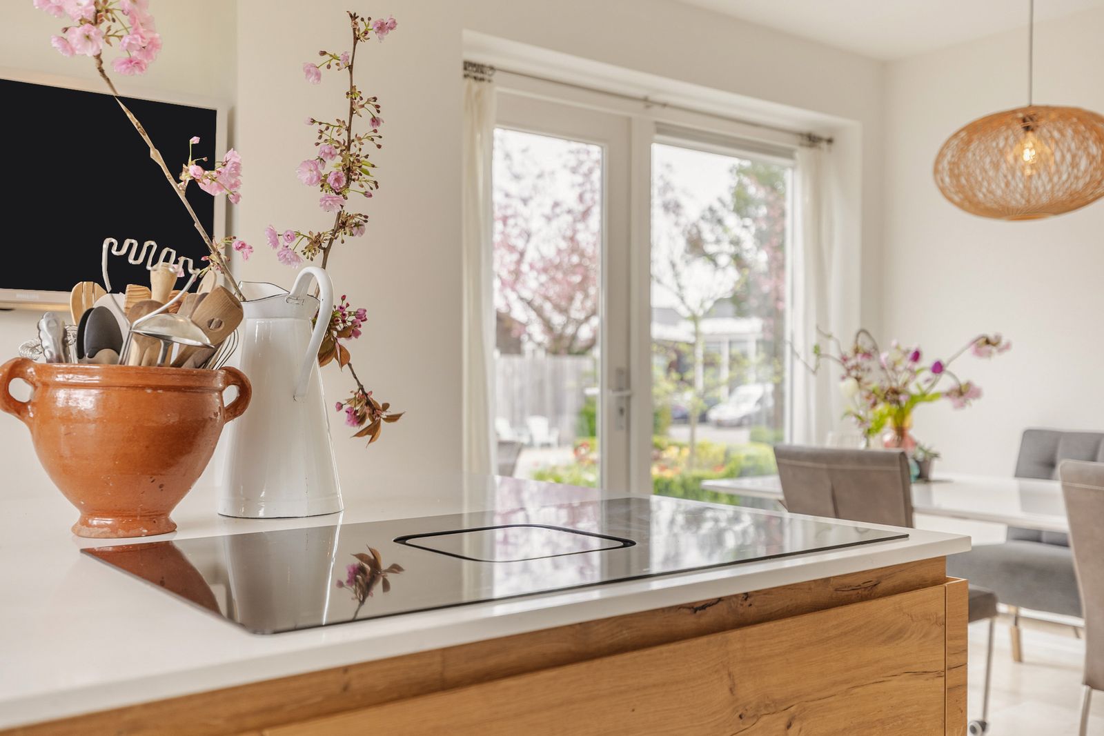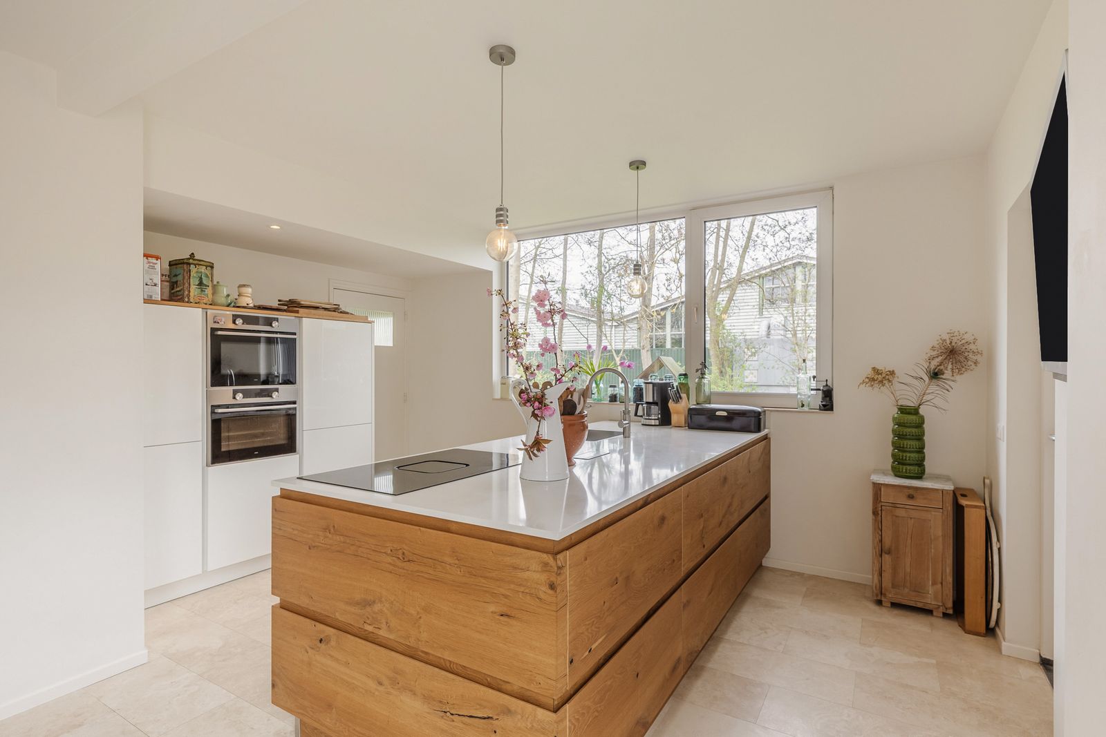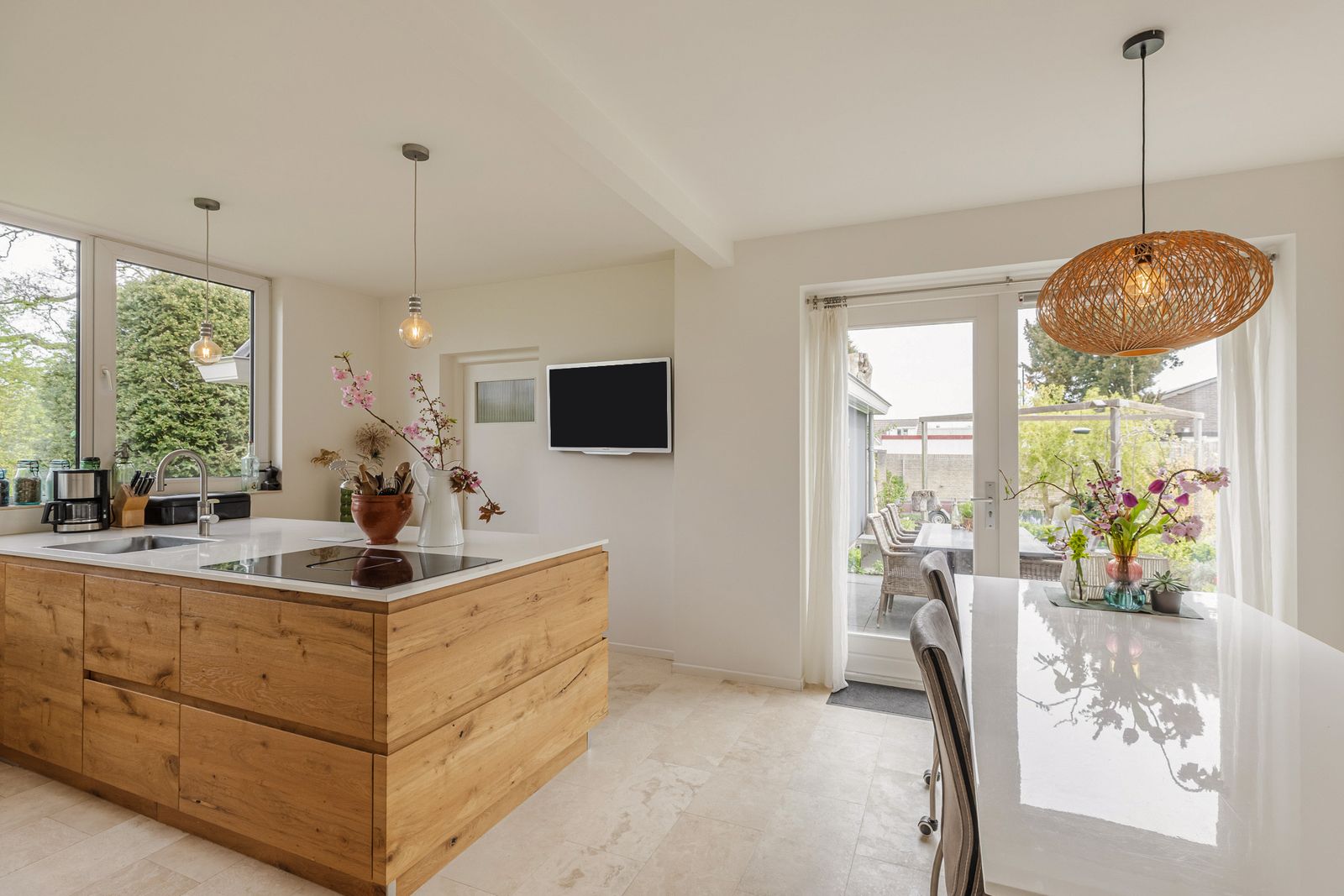 De ruime moderne keuken geeft toegang tot het buitenterras, de bijkeuken en de inpandige schuur en de kelder. De keuken is voorzien van inductie kookplaat met afzuiging, combimagnetron, hetelucht oven, vaatwasser, Quookerkraan en koelkast met vriesvak.