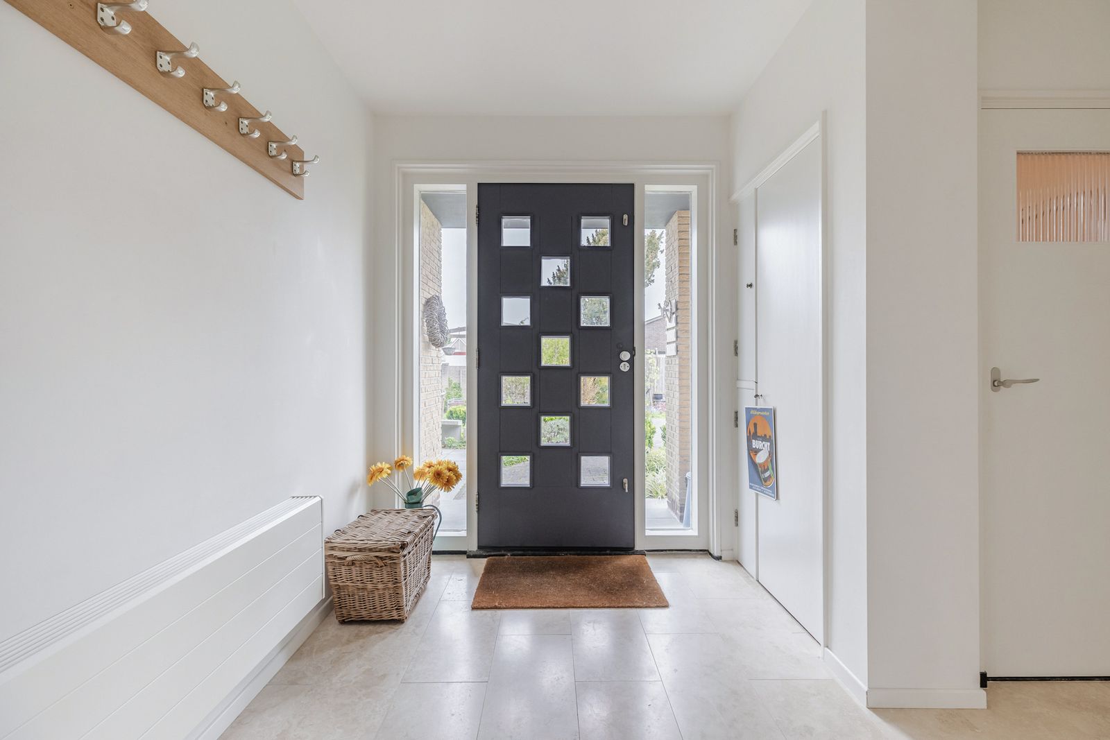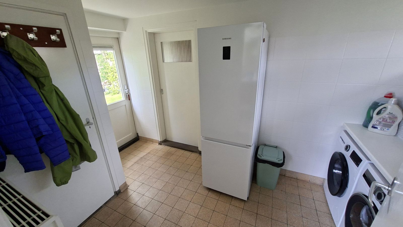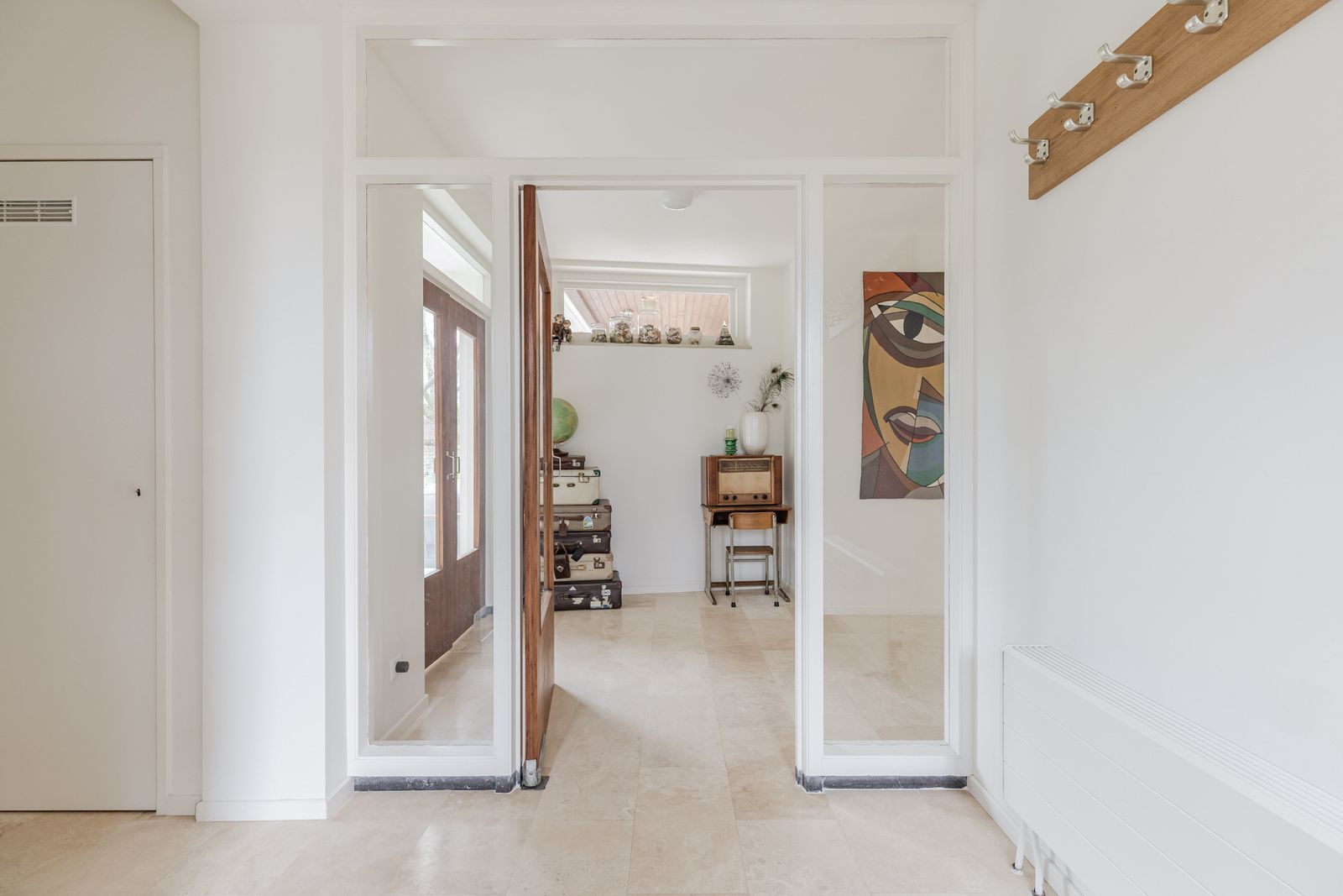 Je komt binnen in de entree met links de meterkast, een CV- en hybridepompkast en een toilet. De hal geeft rechts toegang tot de keuken, de bovenverdieping, eet- en woonkamer. En aan de linkerzijde van de hal is de lange gang naar 5 slaapkamers en 2 badkamers.