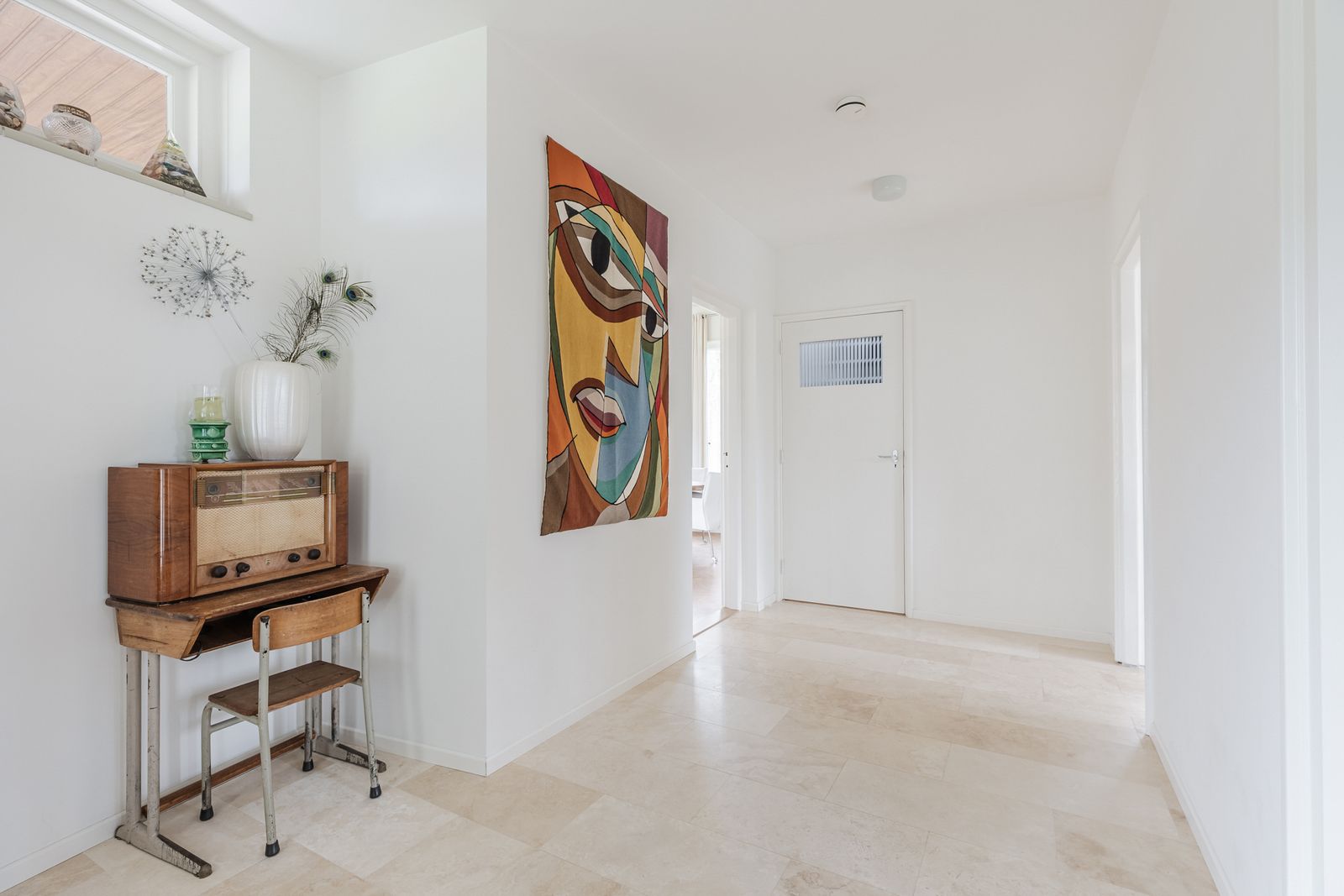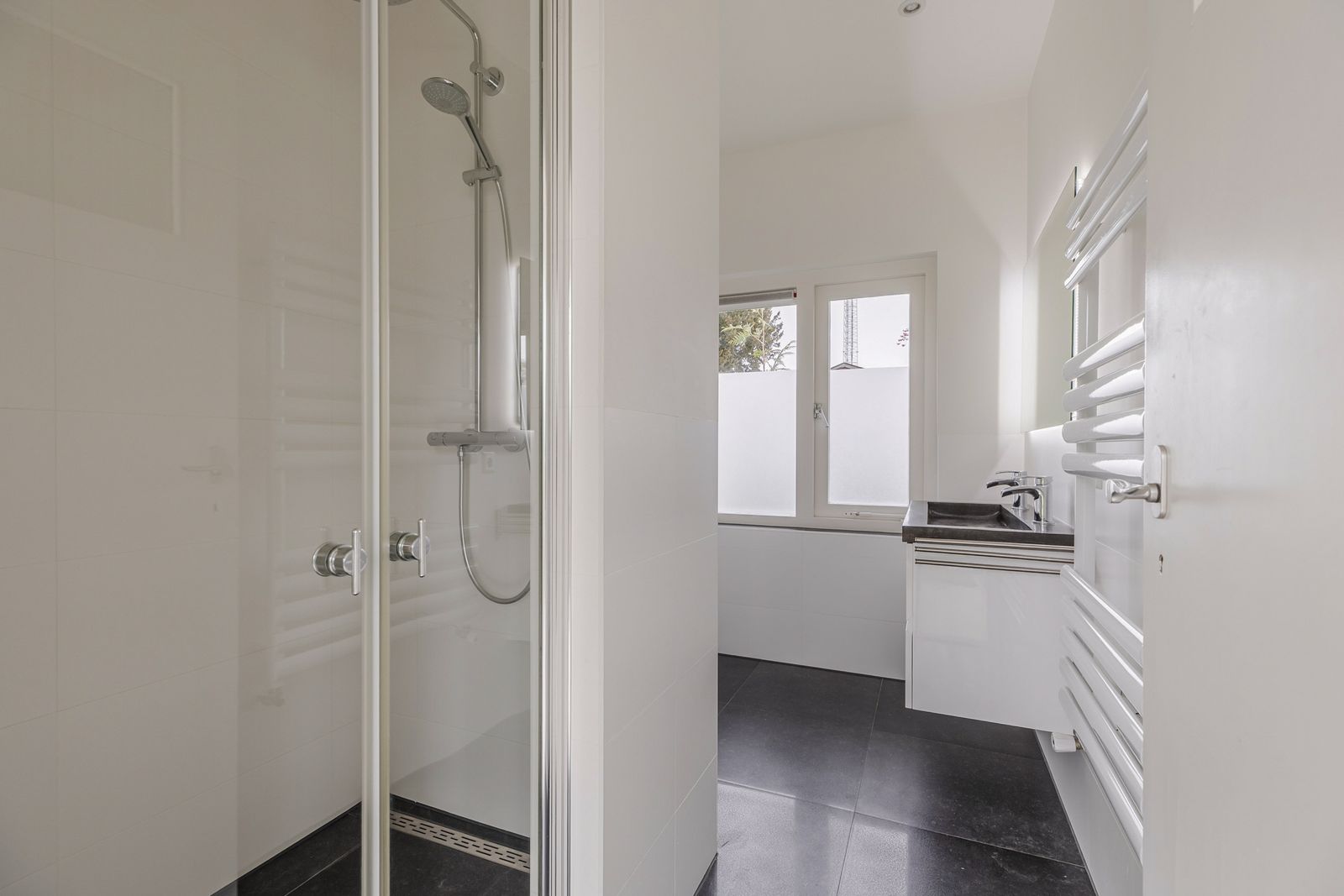 Via de hal kom je in de lange gang met als eerste een kleine slaapkamer, twee identieke ruime slaapkamers met daar tussen de badkamer met douche, dubbele wastafel en toilet. Aan het eind van de gang de grote badkamer met bad, douche, dubbele wasbak en toilet.