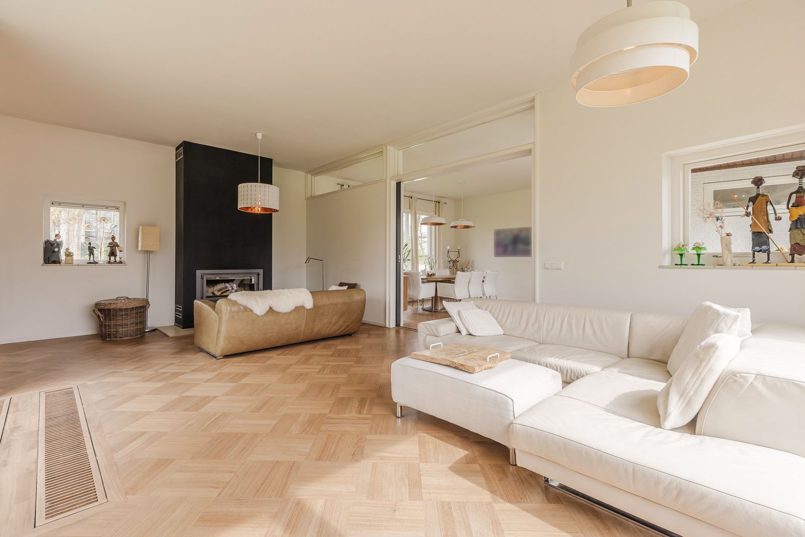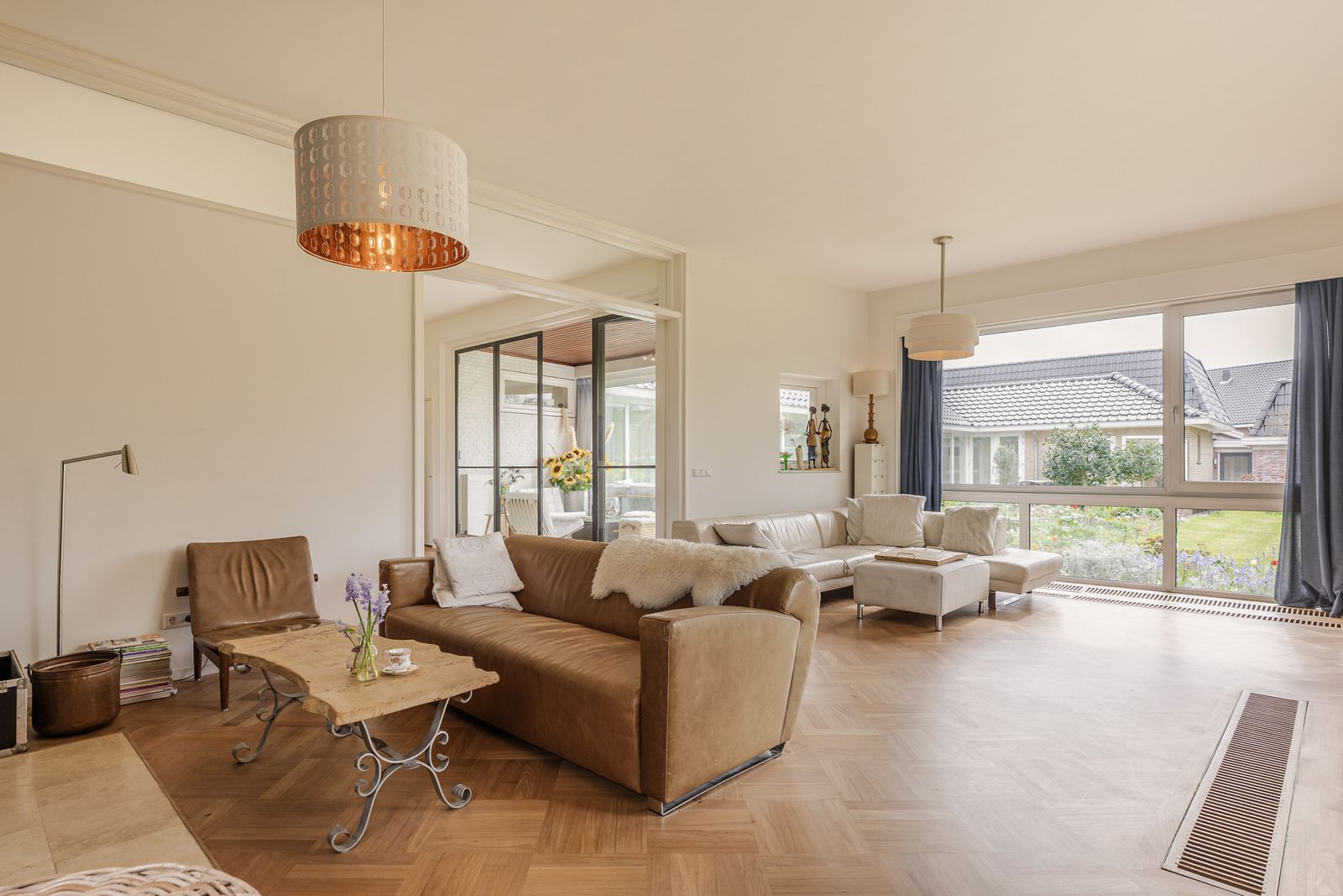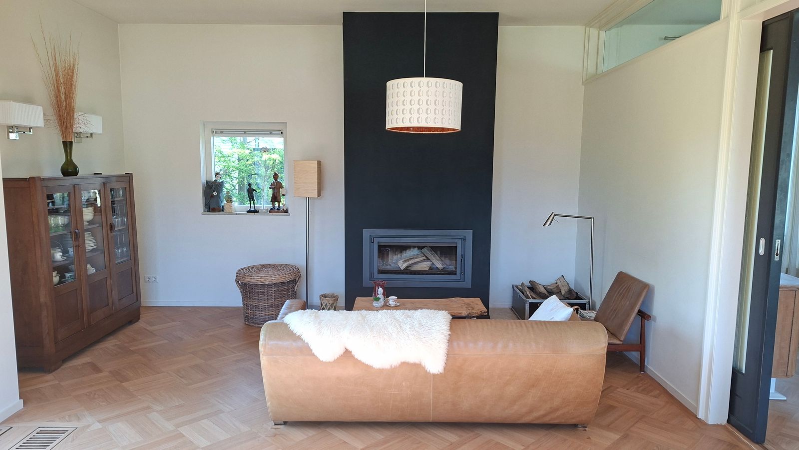• Ruime eet- en woonkamer met hoge plafonds, grote inbouwhoutkachel, imposante schuif- en stalen deuren in de eetkamer en veel lichtinval