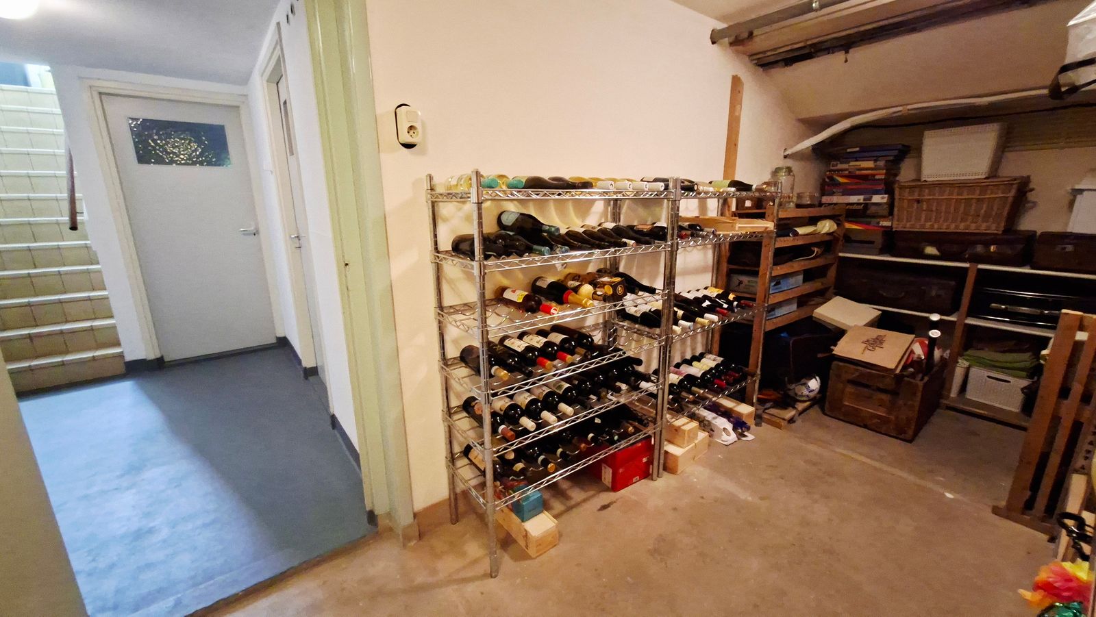 Via de keuken naar de kelder, er zijn hier 3 afsluitbare ruimtes. Links is de sauna met een elektrische saunakachel en tevens 3 stuks infrarood lampen. Er is in deze ruimte nog een kast onder de trap. De andere twee ruimtes zijn nu in gebruik voor opslag en de wijnvoorraad gezien de koele temperatuur in de kelder.