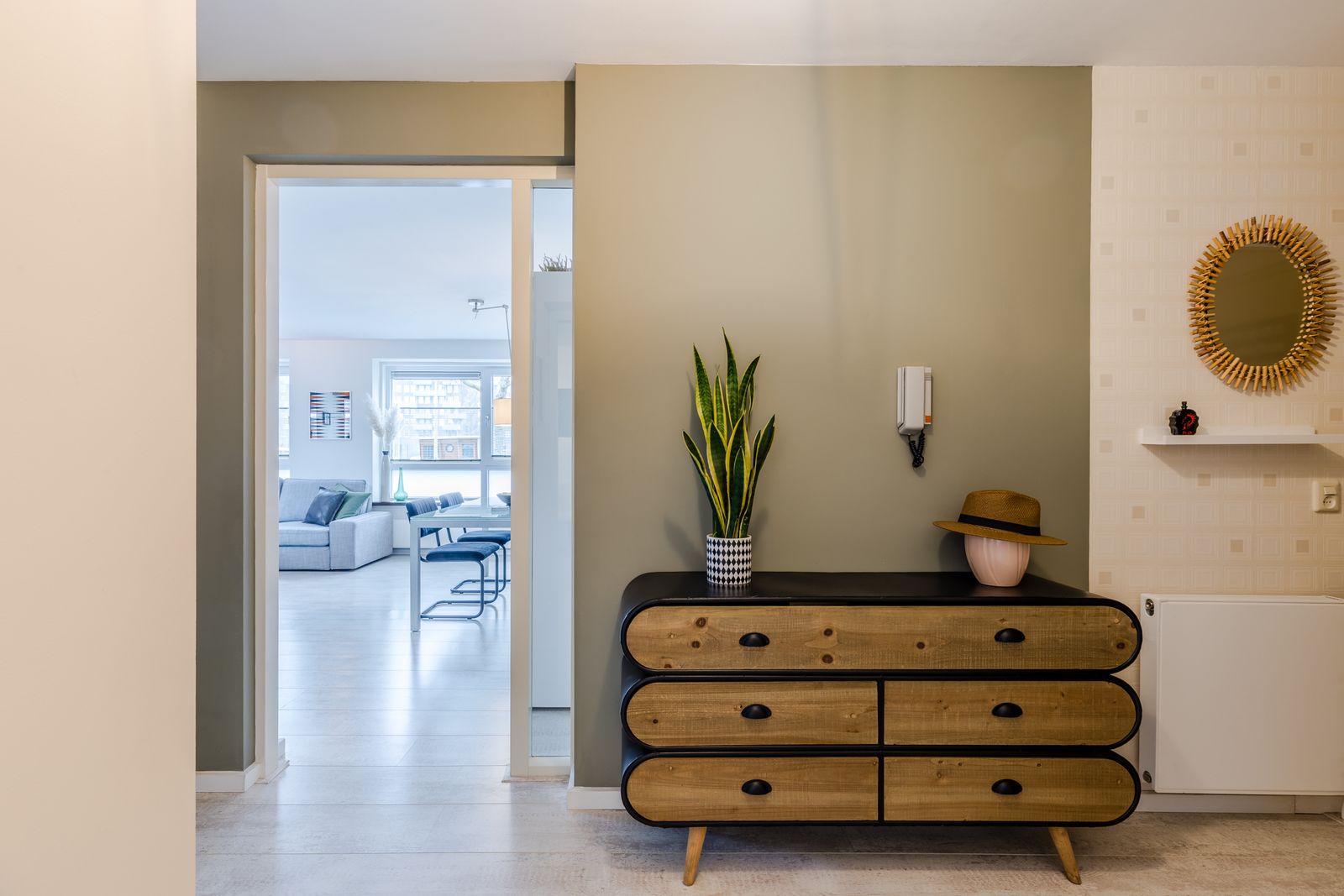 INDELING: Een met intercom beveiligde entree met automatisch deuren, lift en trappenhuis bied toegang tot de berging en het appartement. Binnengekomen bevinden zich grenzend aan de royale gang het toilet, de bergruimte met CV-ketel, de ruime badkamer met ligbad en de slaapkamer. Daarnaast heeft u ook nog een aparte wasruimte. Het appartement is voorzien van een mechanisch ventilatiesysteem, Vaillant Hr-ketel ecoFIT pro (nov. 2021) en strakke design radiatoren. Vanuit de woonkamer stapt u op het terras dat voorzien is van houten vlonders. Via de terraspoort ( eigen opgang dus! ) staat u meteen bij uw auto op uw eigen privé parkeerplaats.