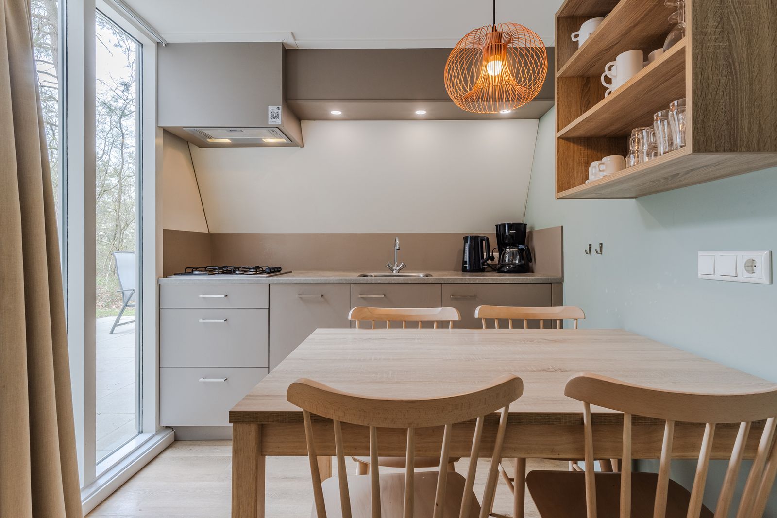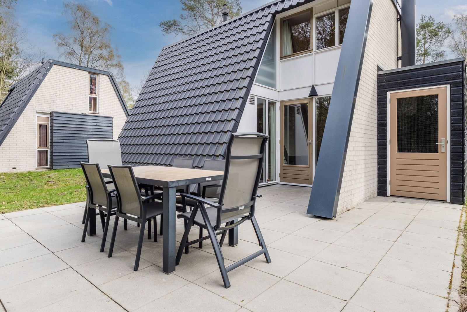Via de openslaande deur komt u op het zonnige terras, waar u met gemak met 6 personen kunt zitten. De ligging op het park is erg gunstig: het terras biedt veel privacy en de parkeerplaats is dichtbij op dit autoluwe park.