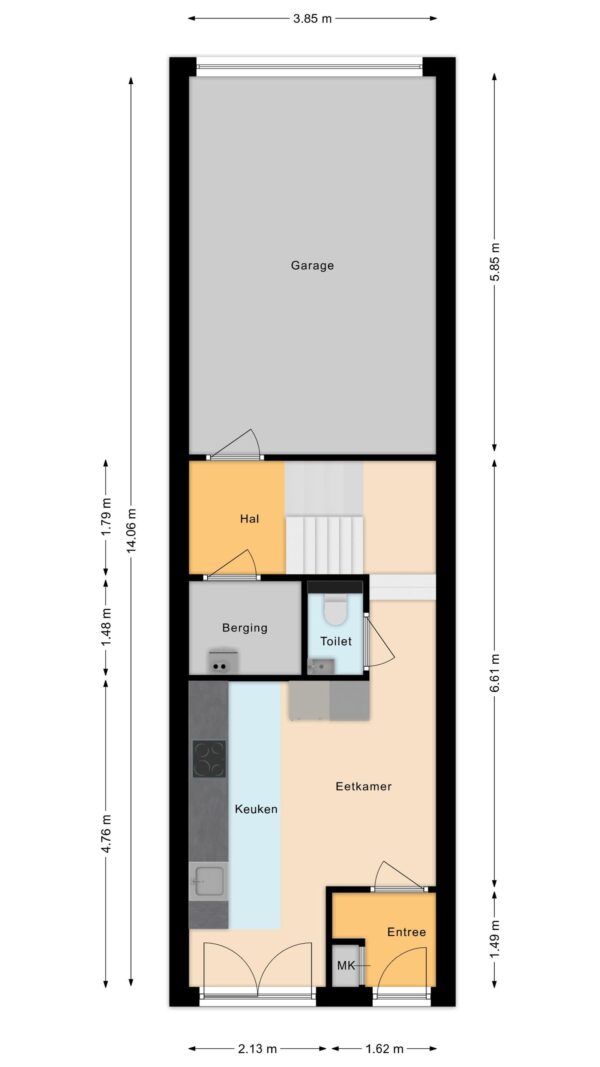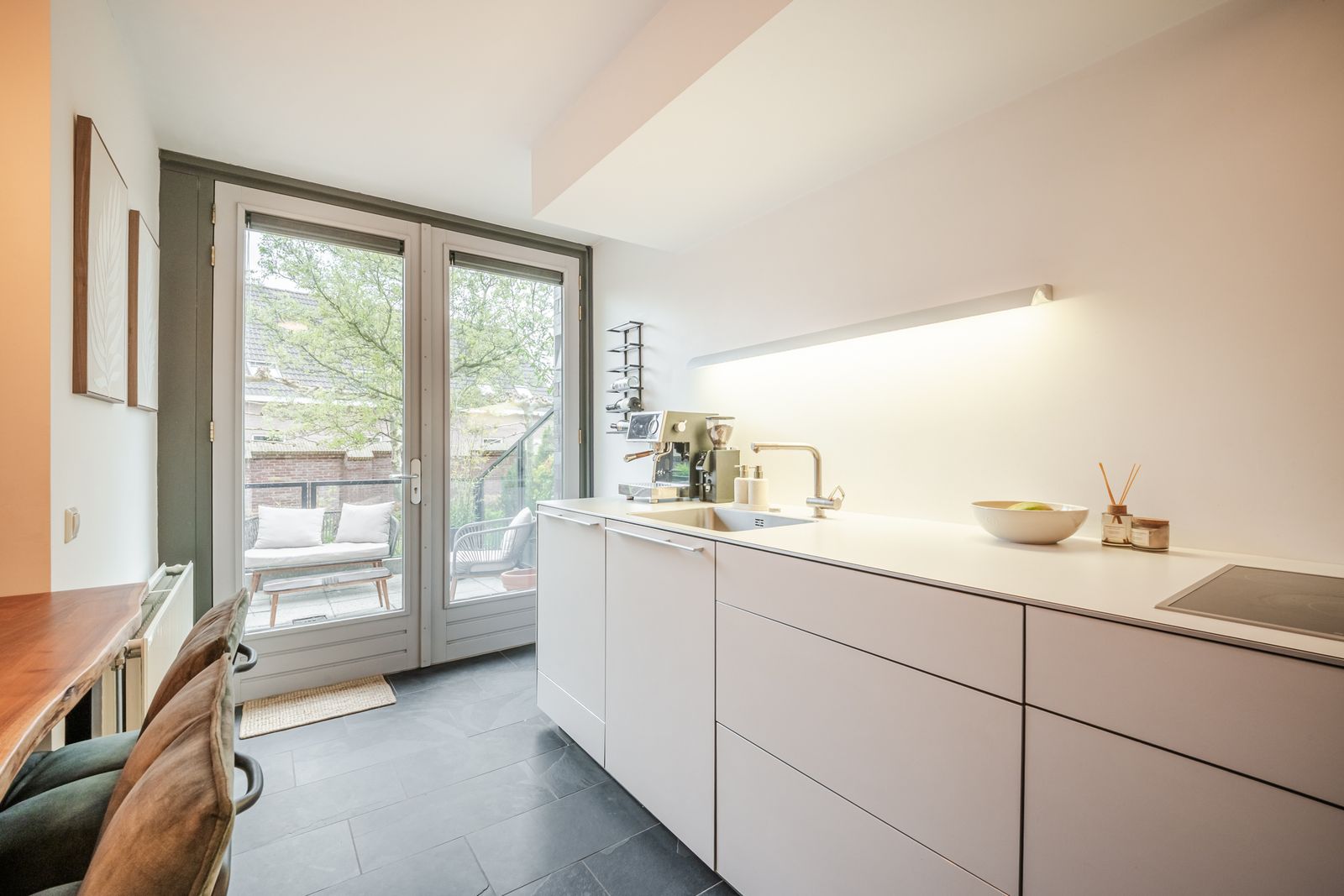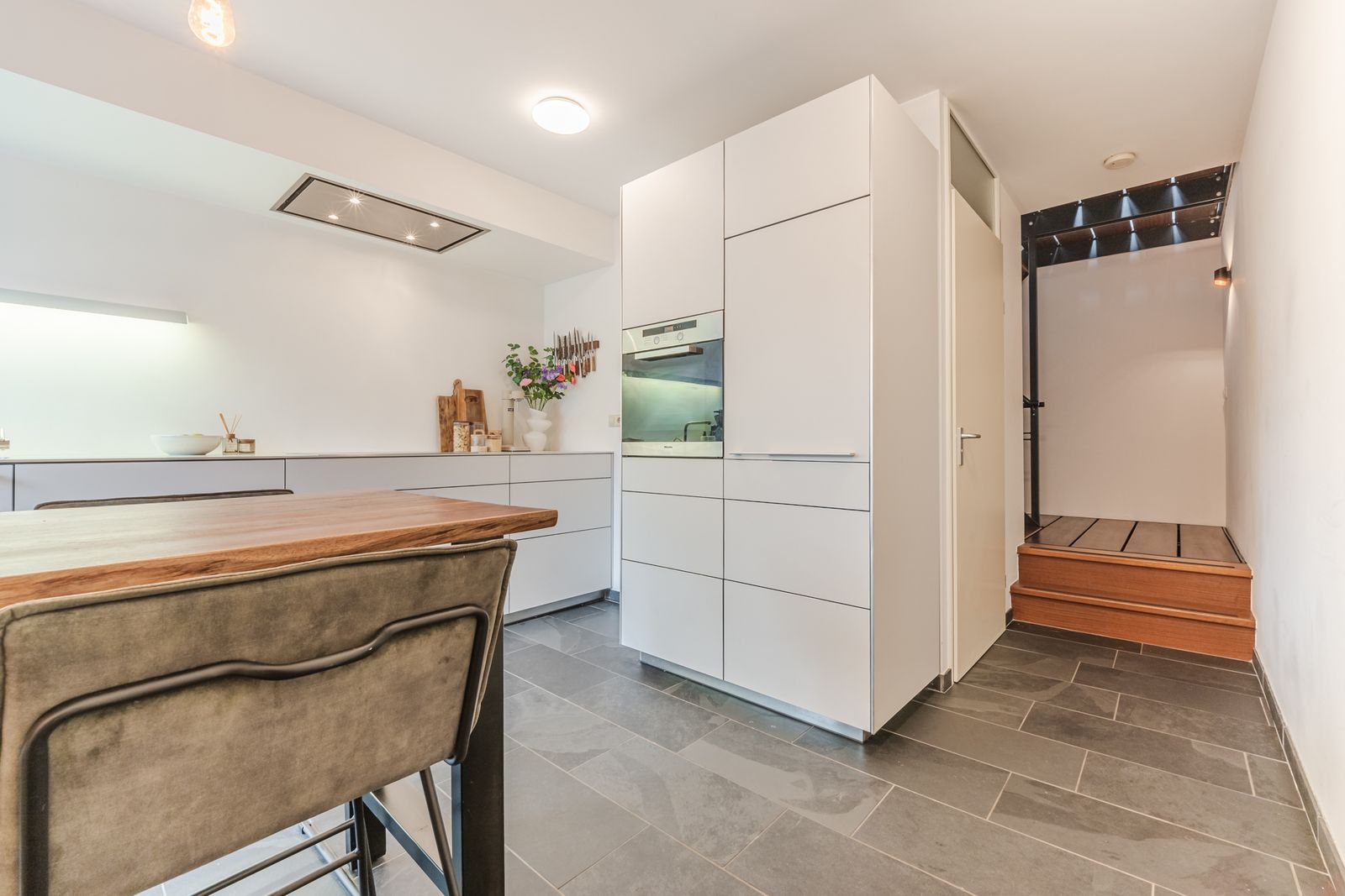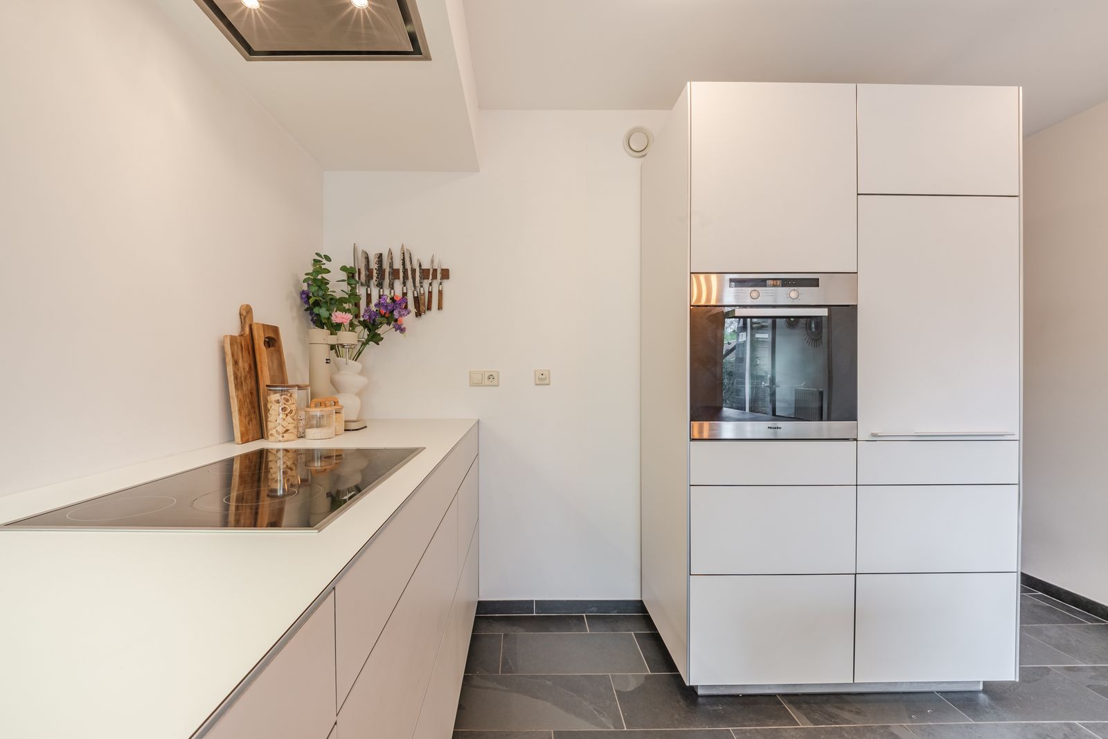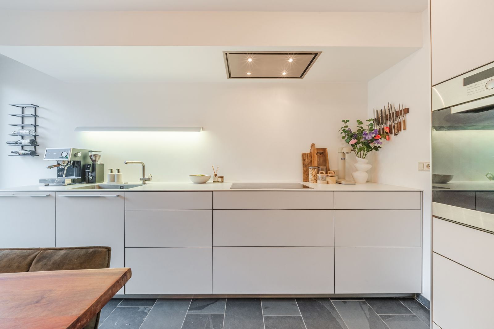 Via de opgang aan de voorzijde bereik je de entree van de woning. In de hal bevinden zich de meterkast en de toegang tot de leefruimte. Je stapt binnen in de ruime Bulthaup-eetkeuken met praktische leistenenvloer - een droom voor kookliefhebbers. De keuken is uitgerust met hoogwaardige Miele- en Siemens-apparatuur en beschikt over openslaande deuren naar het terras, waardoor binnen en buiten prachtig in elkaar overgaan.