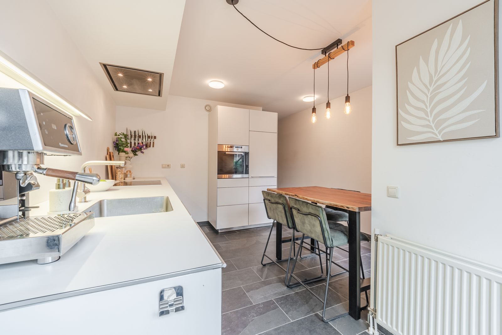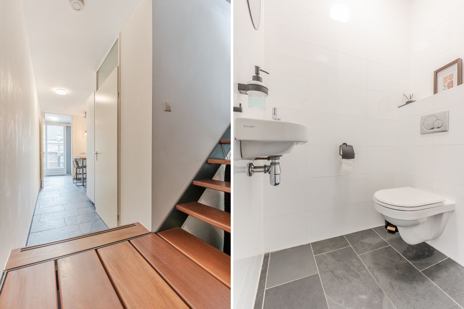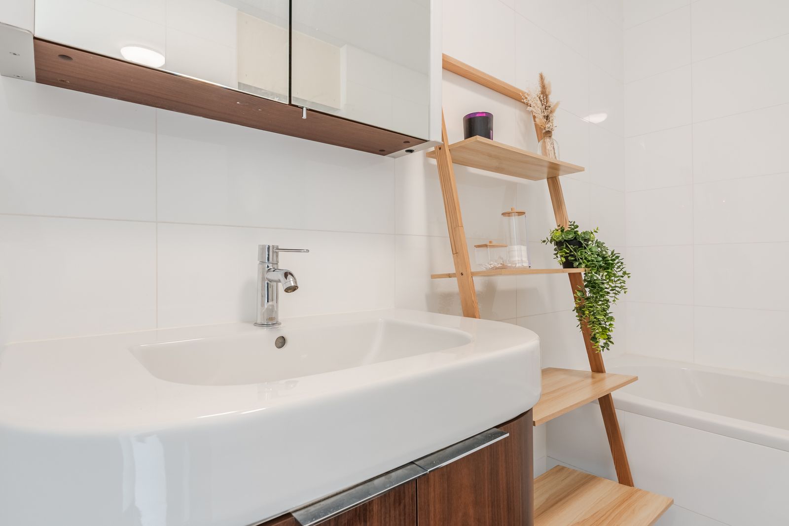 Achter de keuken vind je het volledig betegelde toilet met fontein en een inpandige berging met aansluitingen voor wasmachine en droger, de zonneboiler en de Remeha-cv-ketel (2021). Tegenover de berging bevindt zich de toegang tot de inpandige garage.