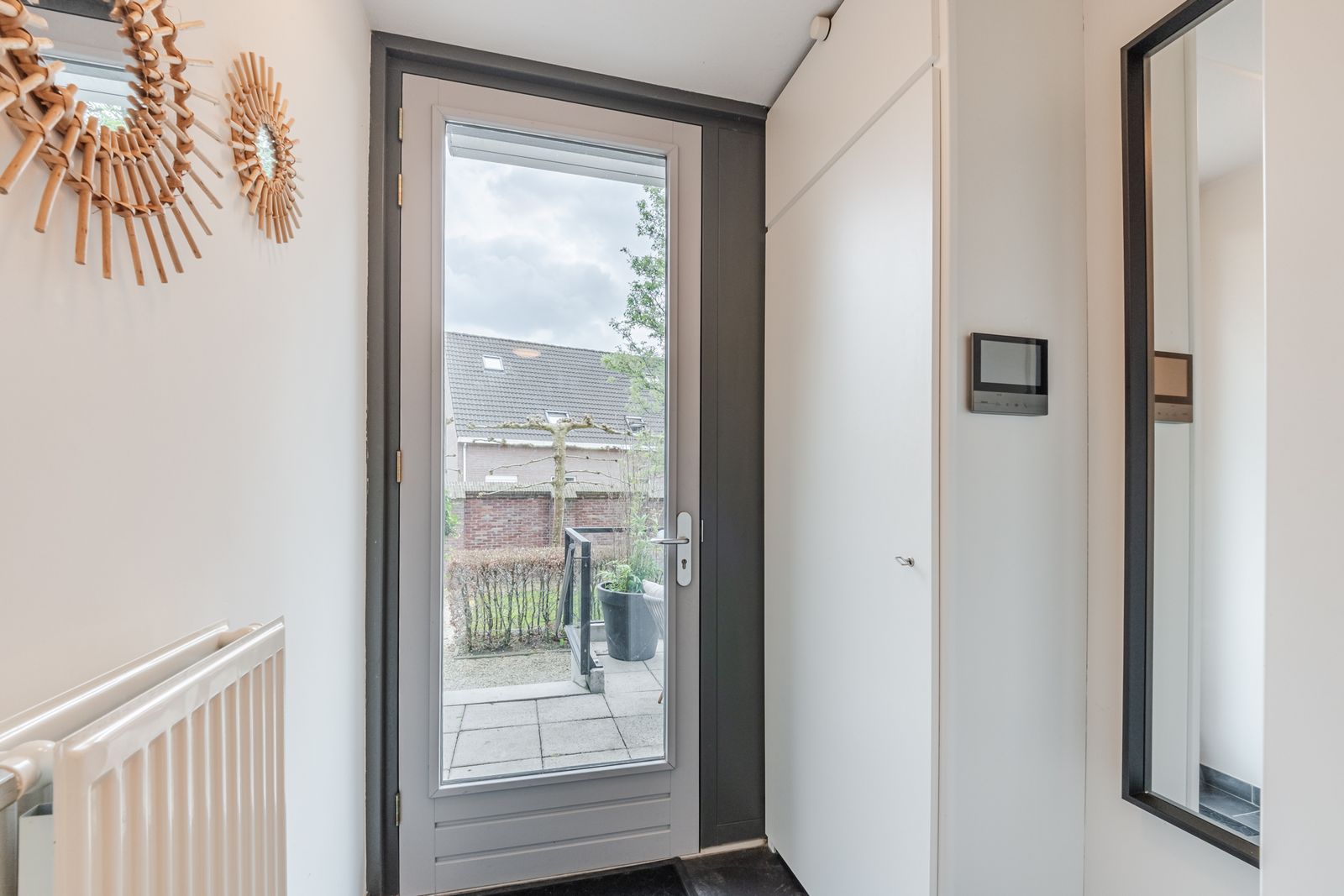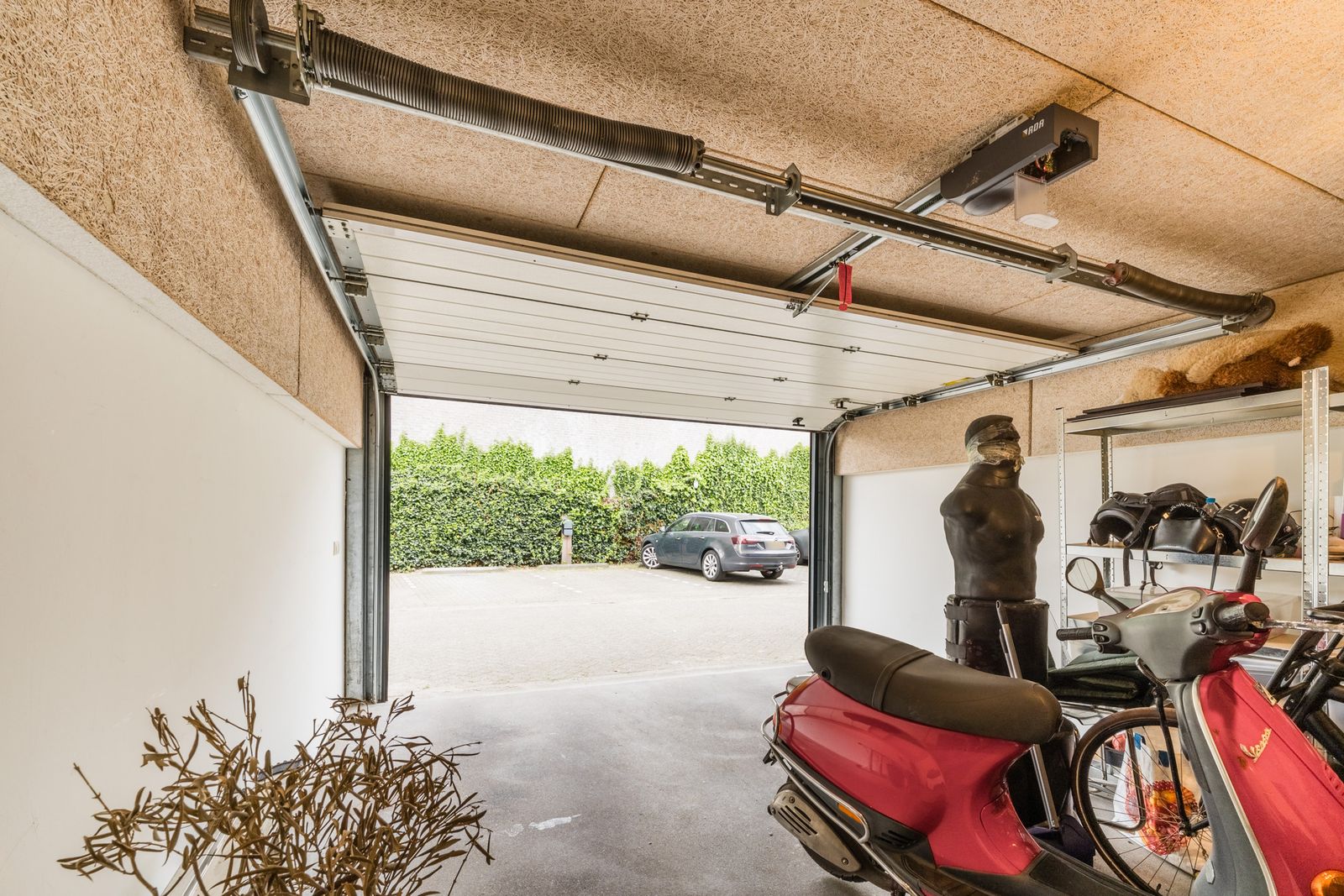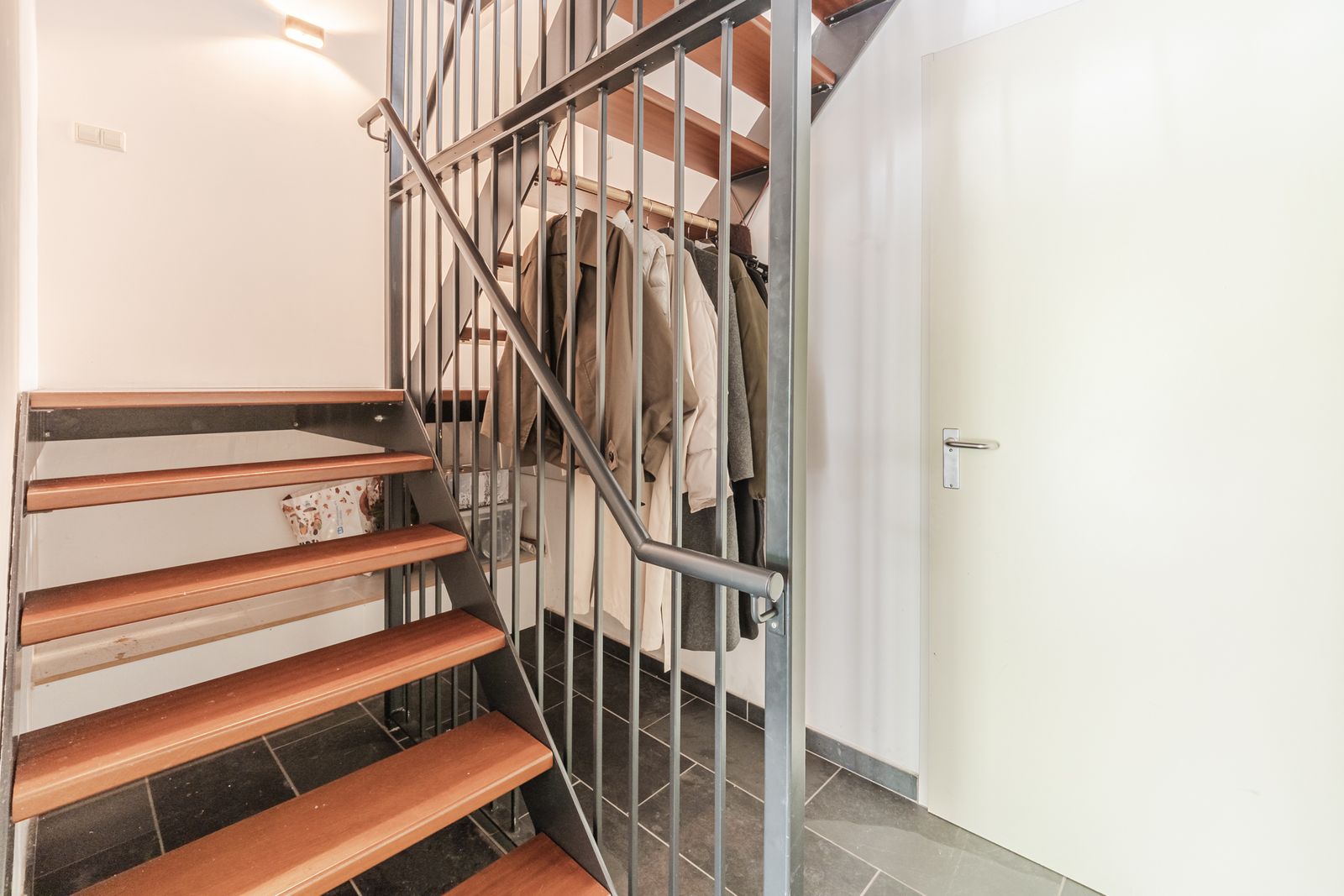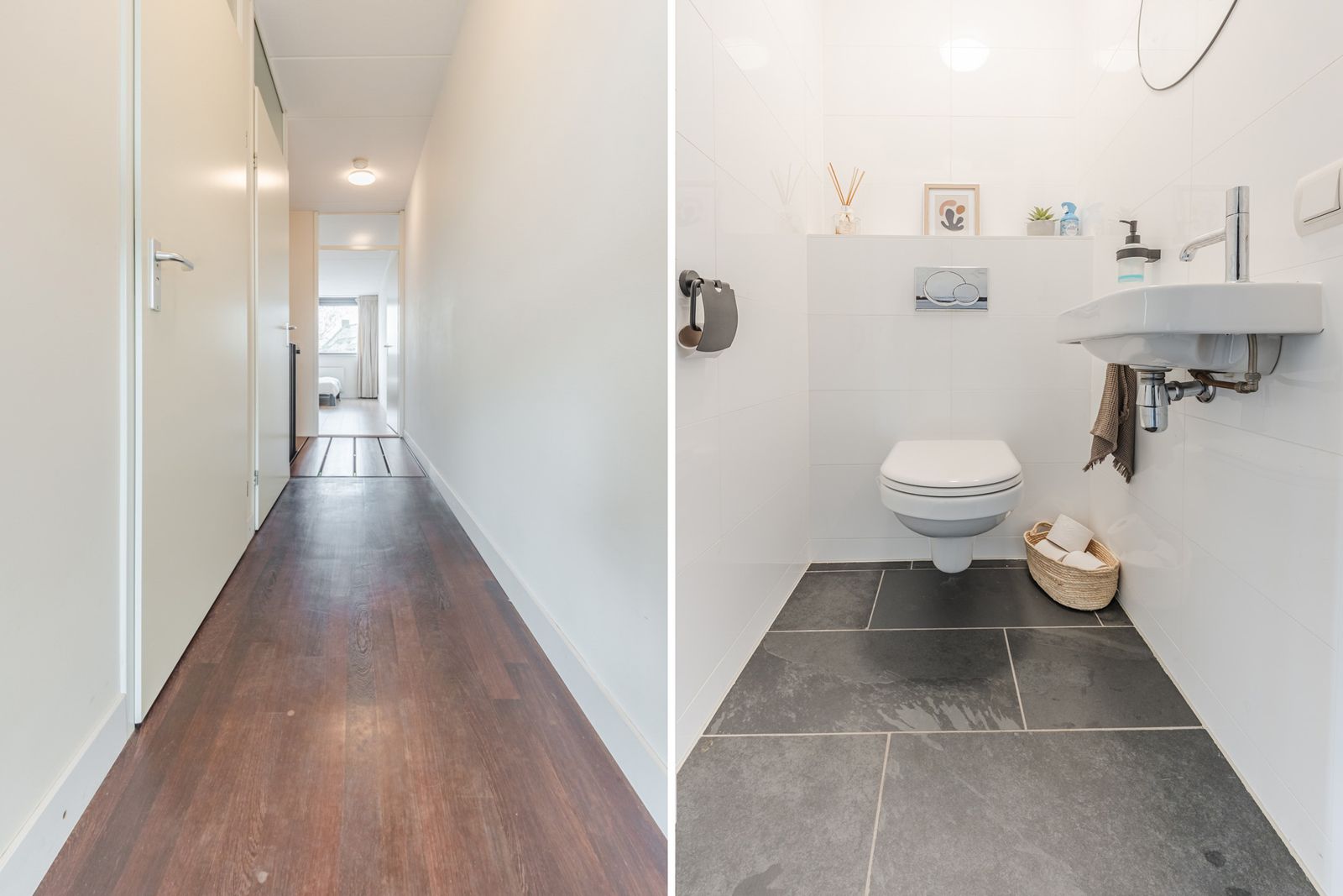 Achter de keuken vind je het volledig betegelde toilet met fontein en een inpandige berging met aansluitingen voor wasmachine en droger, de zonneboiler en de Remeha-cv-ketel (2021). Tegenover de berging bevindt zich de toegang tot de inpandige garage.
