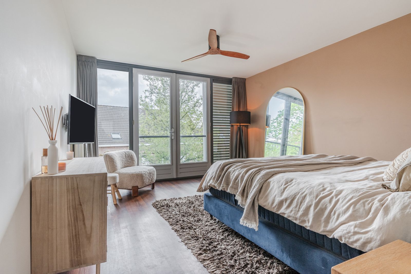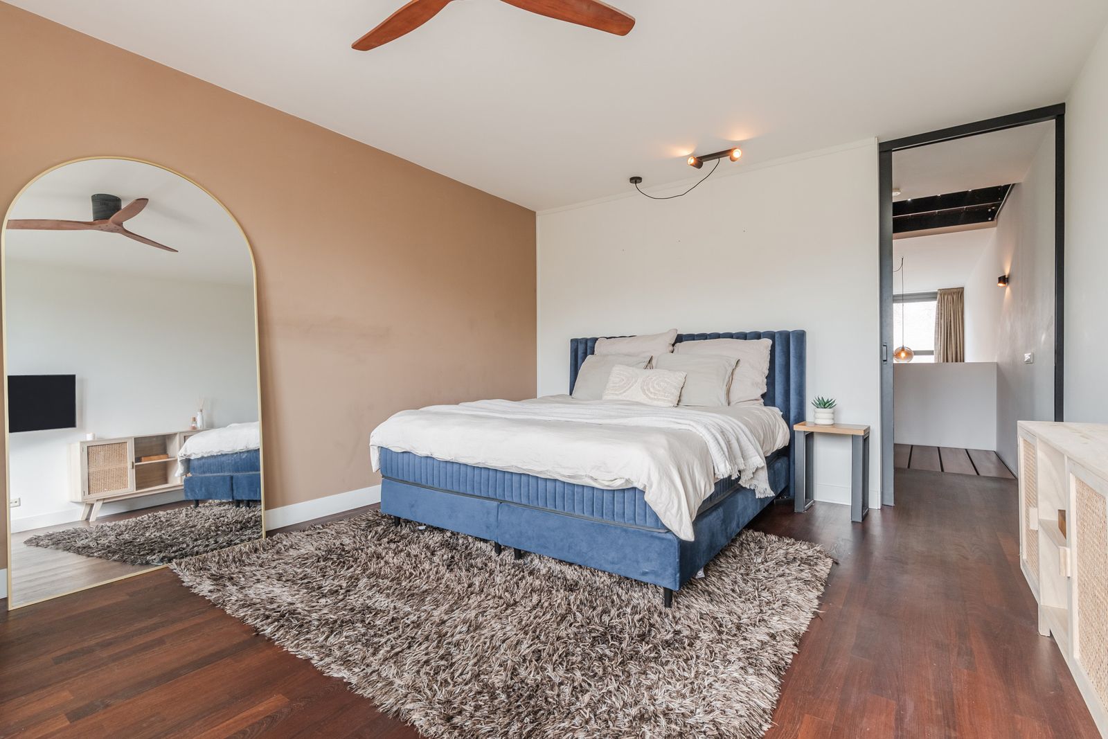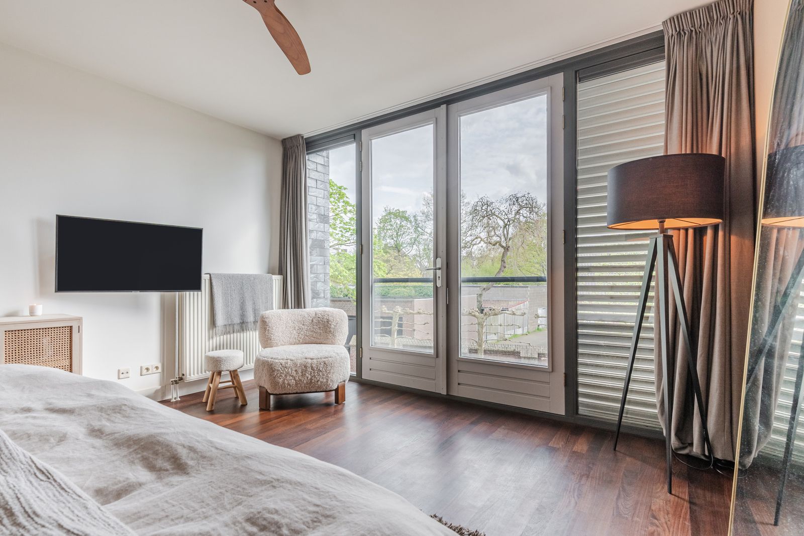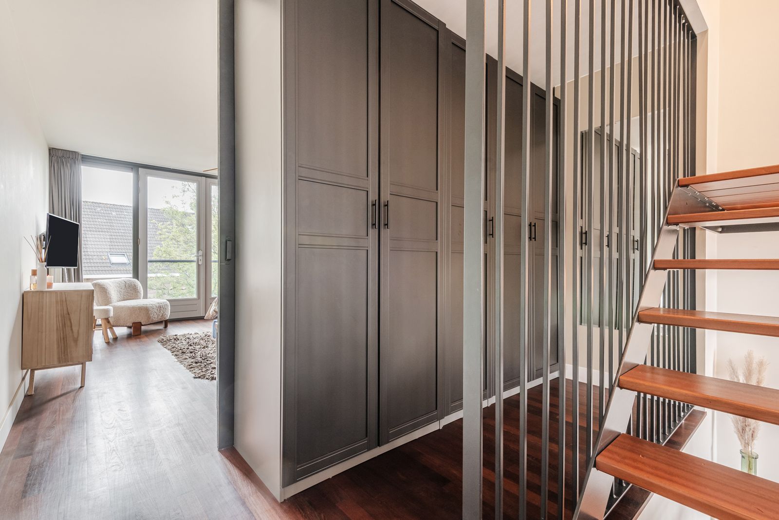 De eerste verdieping verrast met een royale living, hoge plafonds, grote raampartijen en een prachtige lichtinval. De extra ruimte, momenteel ingericht als riante master bedroom, biedt volop flexibiliteit, bijvoorbeeld als extra zitkamer of thuiswerkruimte. De grote op het zuiden gelegen raampartij heeft openslaande deuren met een Frans balkon. De verschuifbare, zonwerende metalen shutters aan de buitenzijde zorgen voor een aangenaam binnenklimaat. De gehele verdieping is afgewerkt met strakke wanden en een luxe walnoten parketvloer.