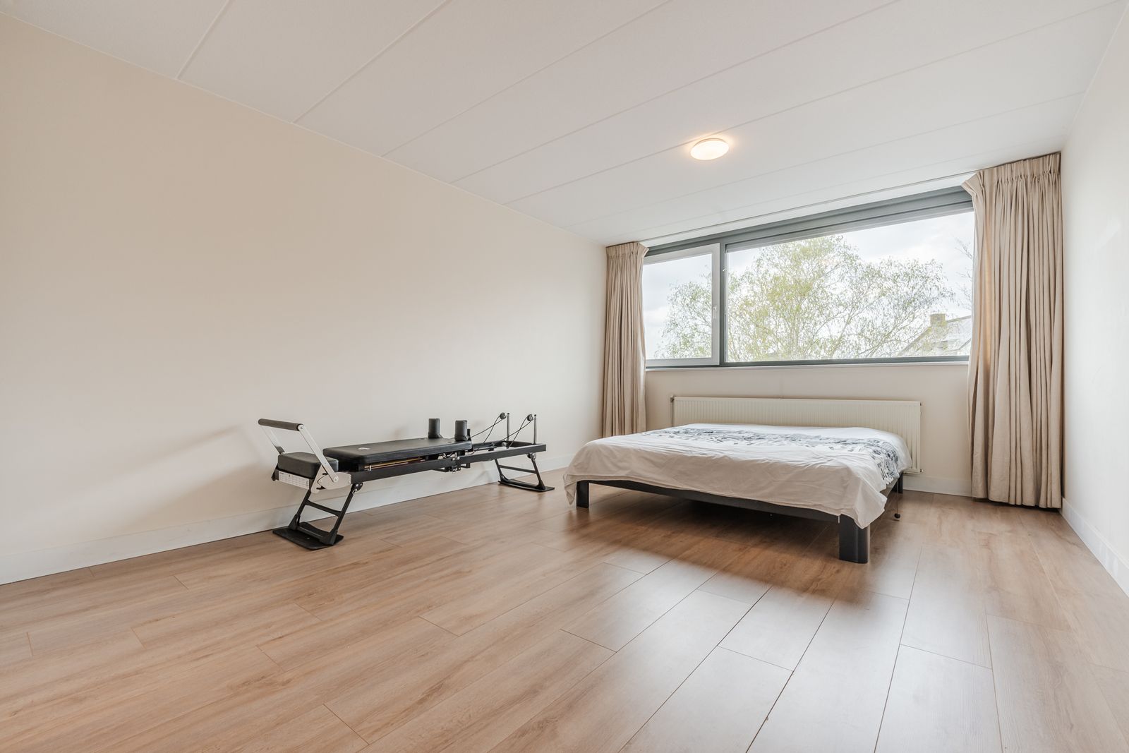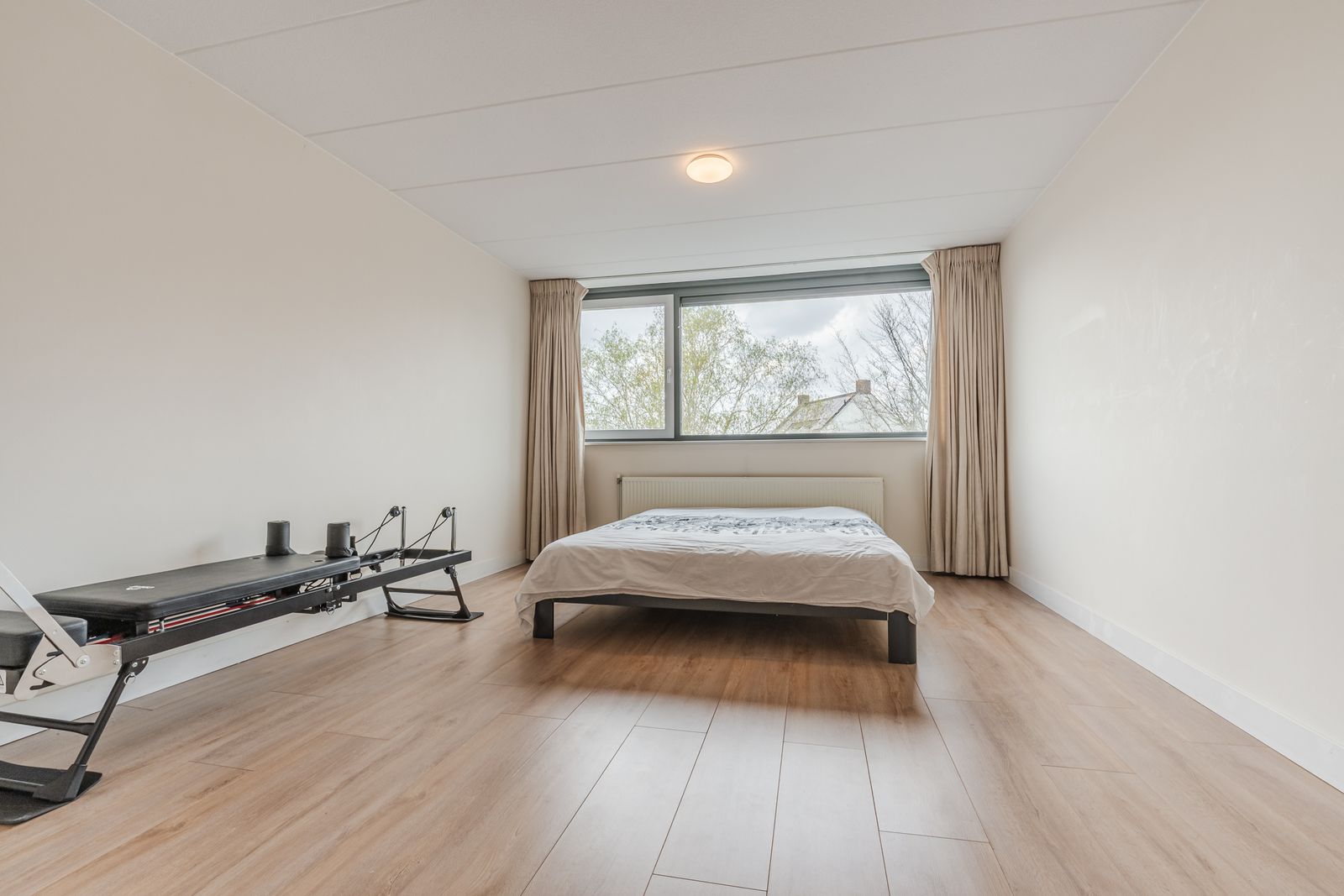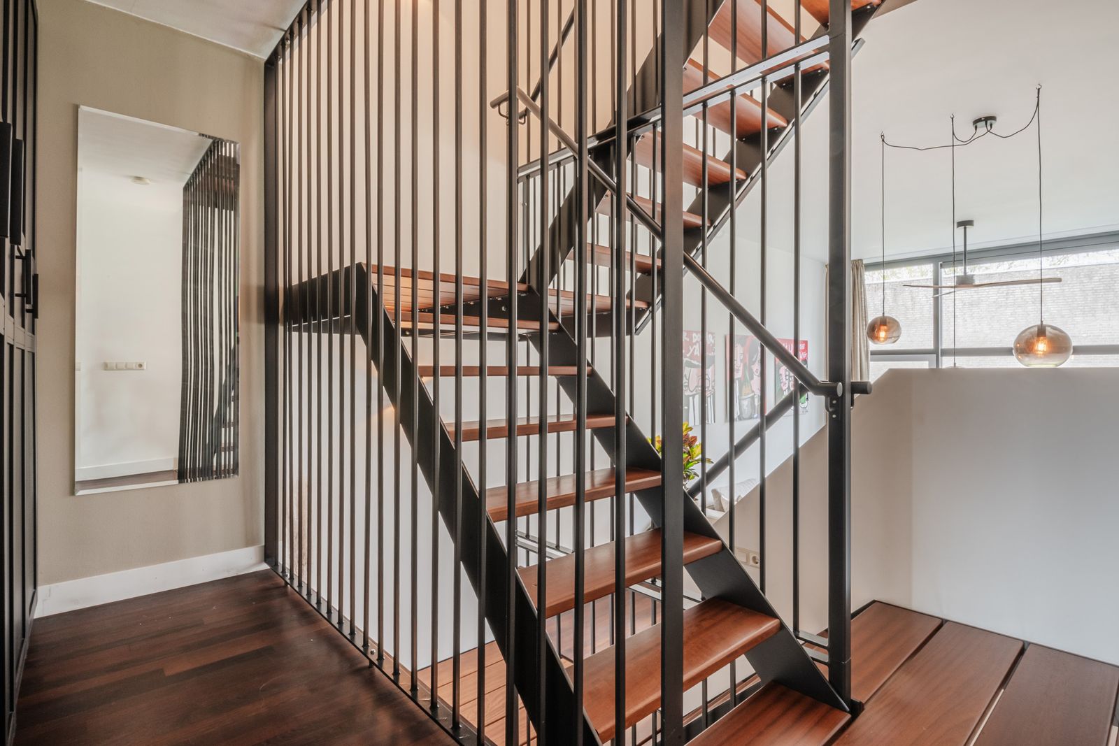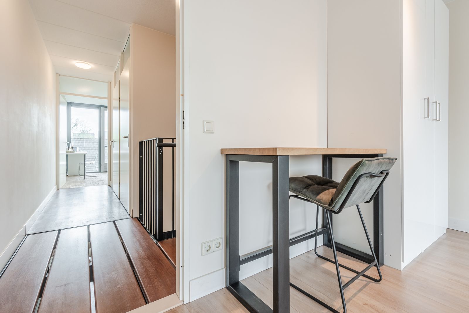 De eerste verdieping verrast met een royale living, hoge plafonds, grote raampartijen en een prachtige lichtinval. De extra ruimte, momenteel ingericht als riante master bedroom, biedt volop flexibiliteit, bijvoorbeeld als extra zitkamer of thuiswerkruimte. De grote op het zuiden gelegen raampartij heeft openslaande deuren met een Frans balkon. De verschuifbare, zonwerende metalen shutters aan de buitenzijde zorgen voor een aangenaam binnenklimaat. De gehele verdieping is afgewerkt met strakke wanden en een luxe walnoten parketvloer.