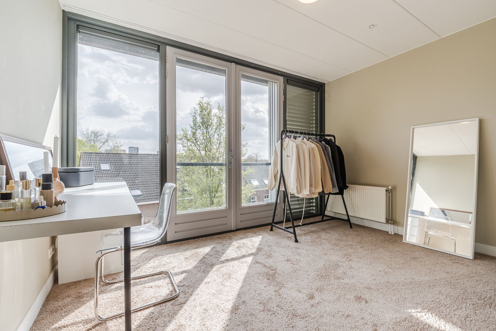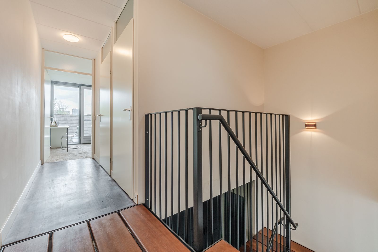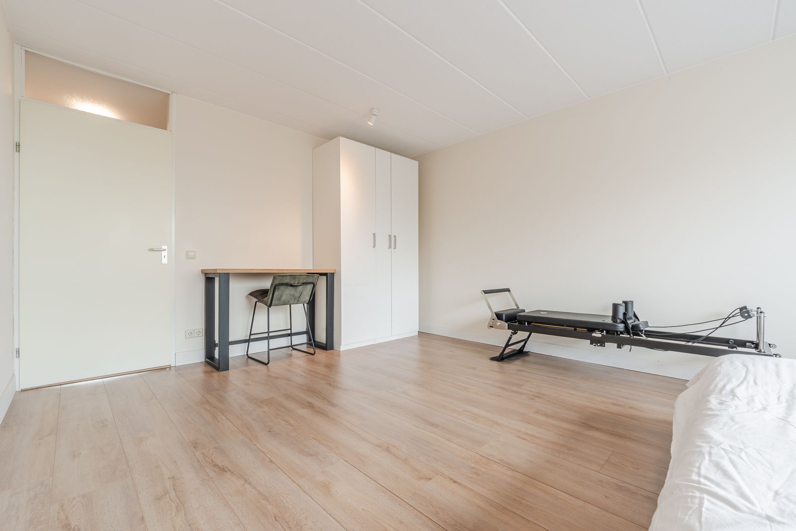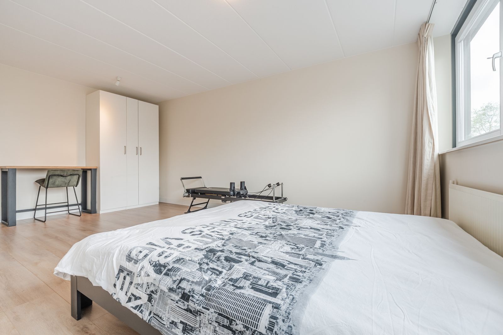 De eerste verdieping verrast met een royale living, hoge plafonds, grote raampartijen en een prachtige lichtinval. De extra ruimte, momenteel ingericht als riante master bedroom, biedt volop flexibiliteit, bijvoorbeeld als extra zitkamer of thuiswerkruimte. De grote op het zuiden gelegen raampartij heeft openslaande deuren met een Frans balkon. De verschuifbare, zonwerende metalen shutters aan de buitenzijde zorgen voor een aangenaam binnenklimaat. De gehele verdieping is afgewerkt met strakke wanden en een luxe walnoten parketvloer.