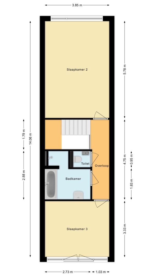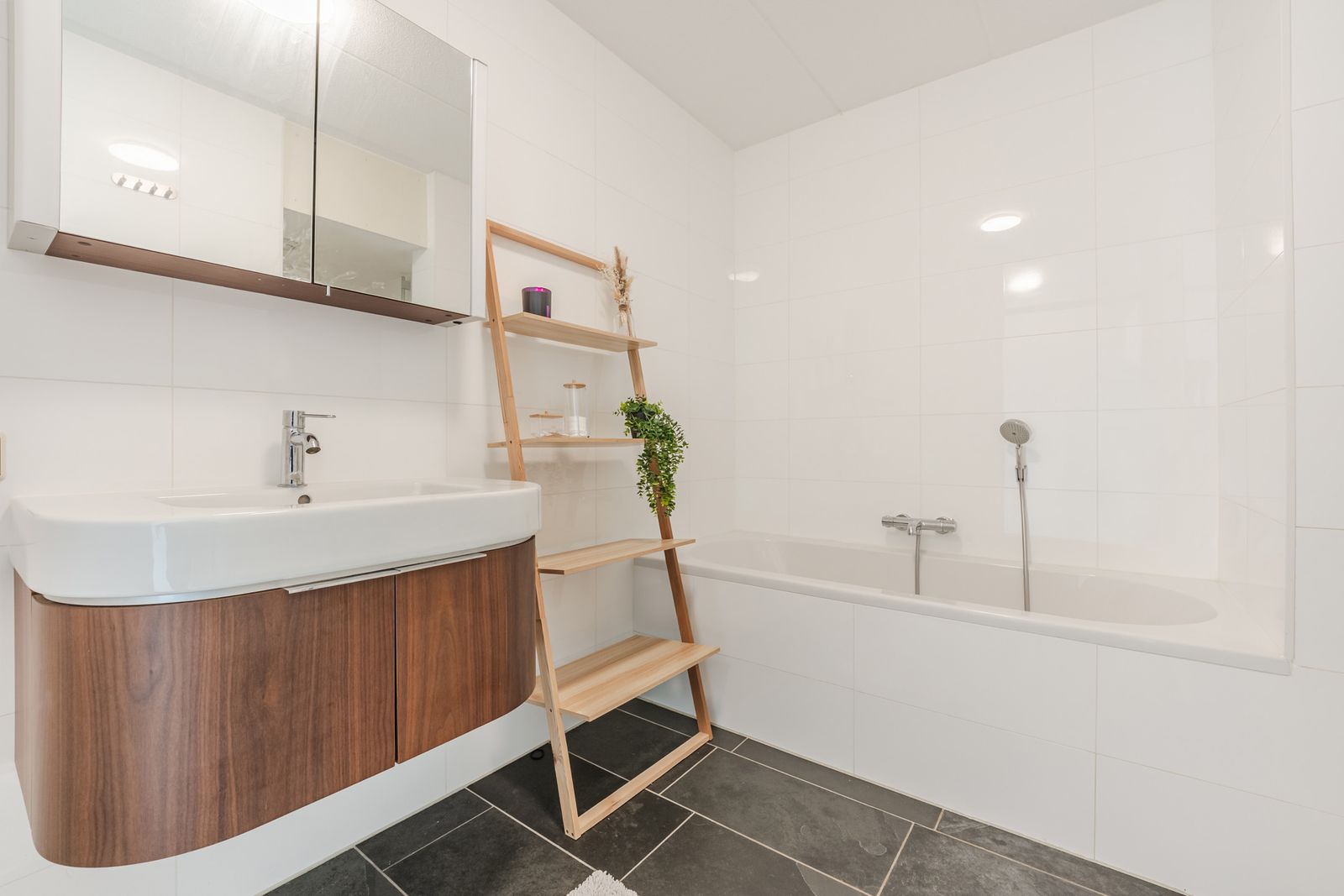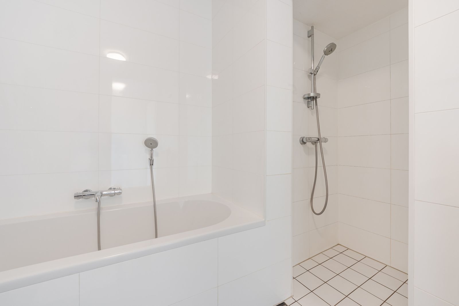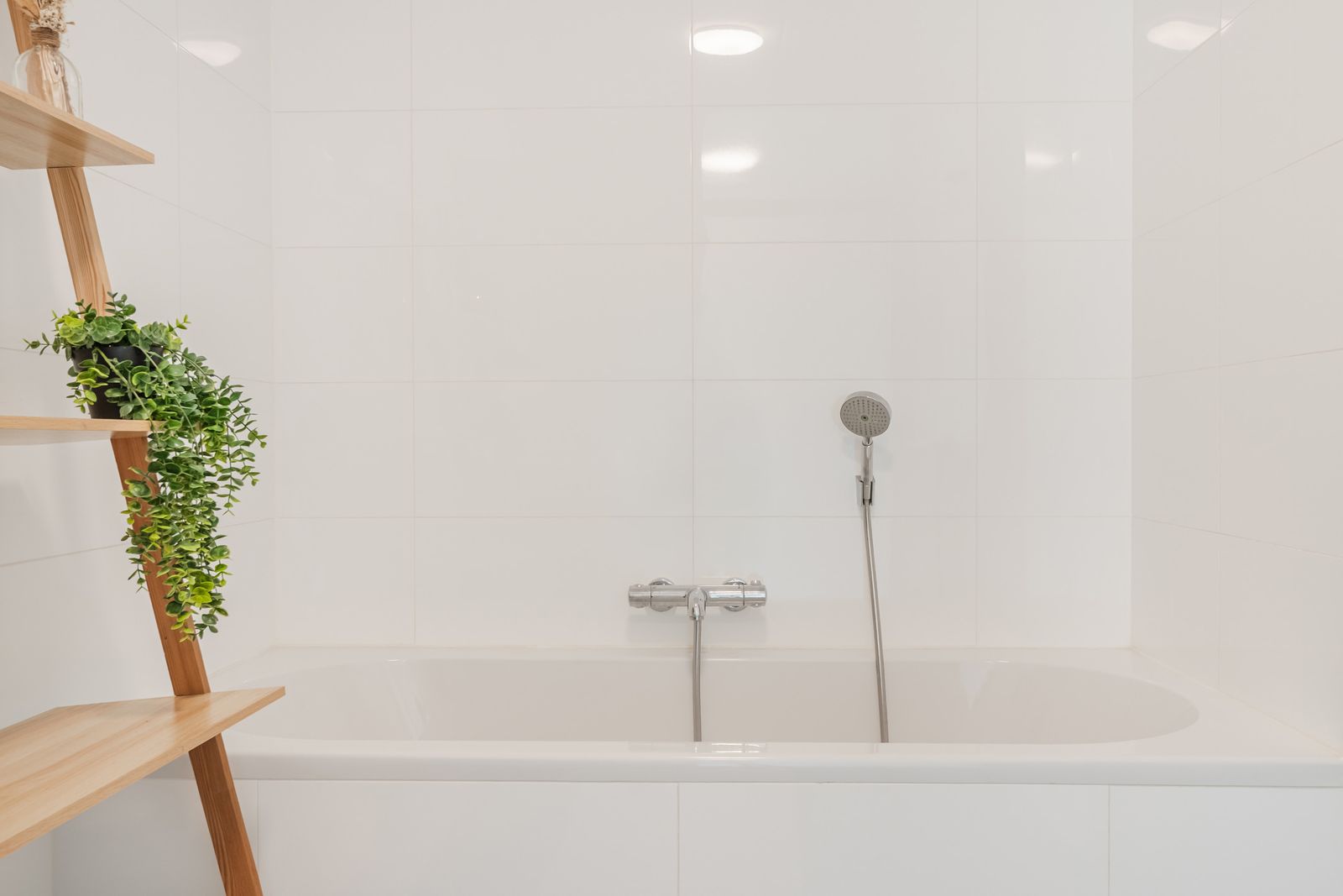 De volledig betegelde badkamer is uitgevoerd in een tijdloze witte kleurstelling en voorzien van een inloopdouche, ligbad, wastafelmeubel en designradiator. Op de overloop bevindt zich het tweede separate toilet en eveneens een walnoten vloerafwerking.