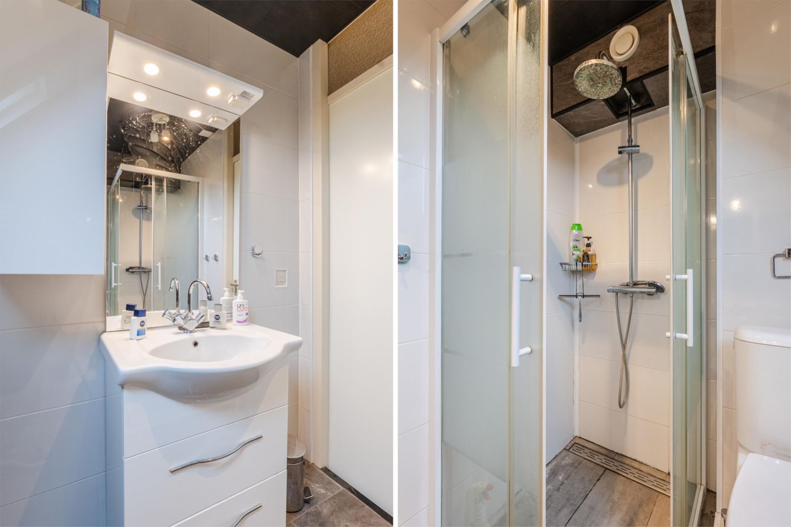 Overloop; 3 slaapkamers waarvan 2 met laminaatvloer; keurige badkamer met vrijstaand ligbad, douche, vaste wastafel en 2e toilet.