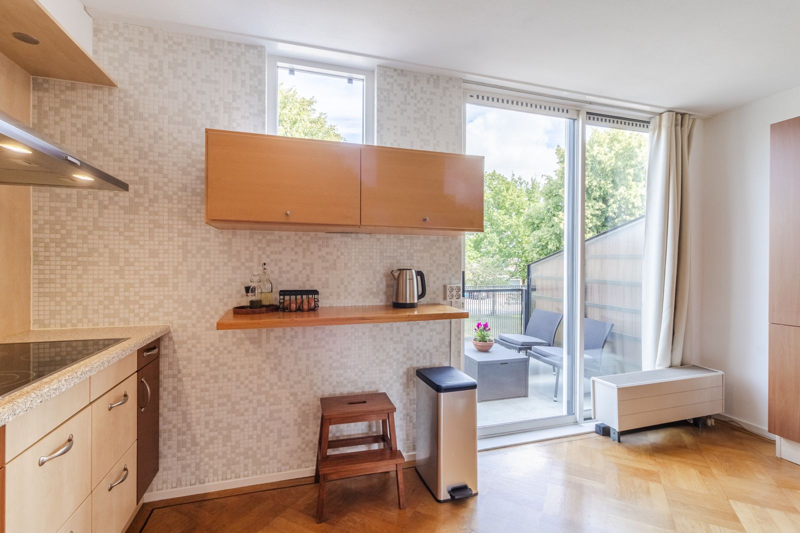 - Houten kozijnen voorzien van dubbel glas, schuifpui van aluminium
