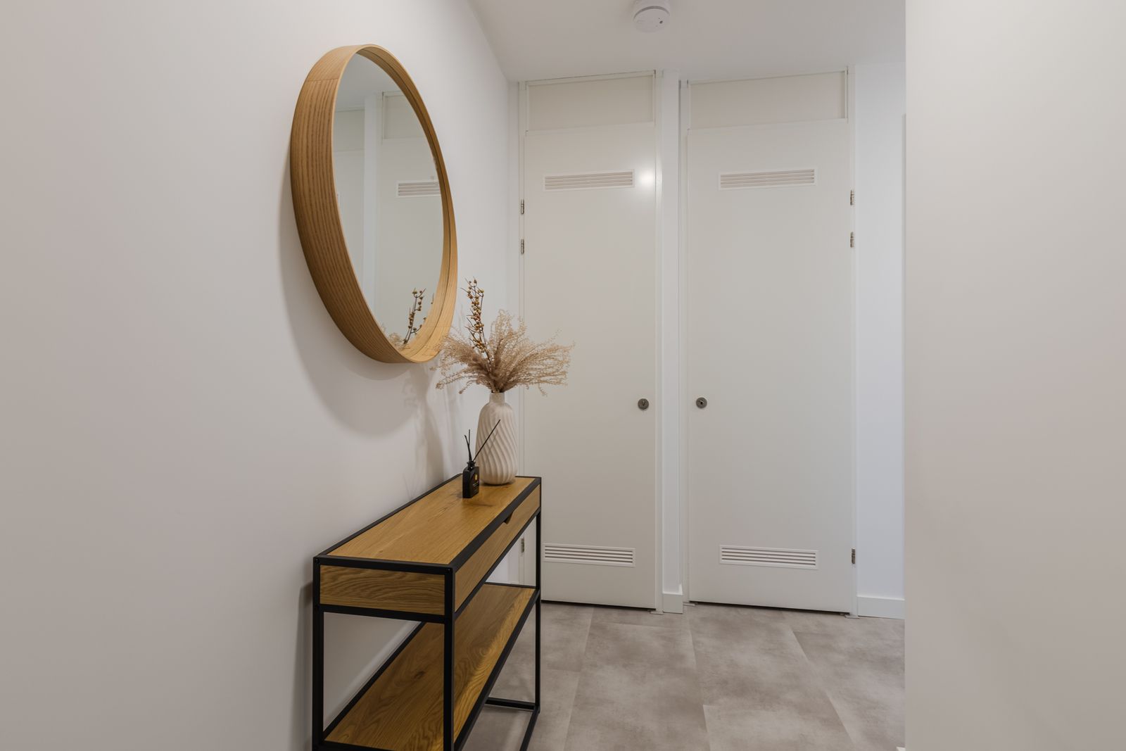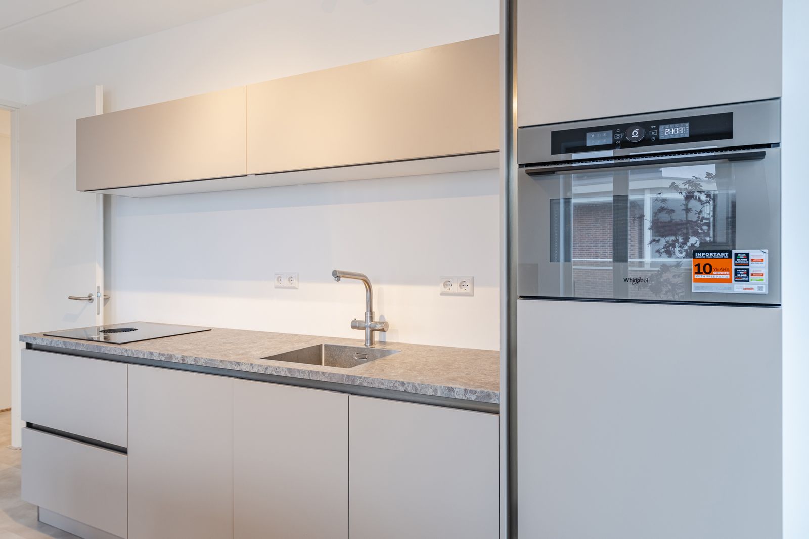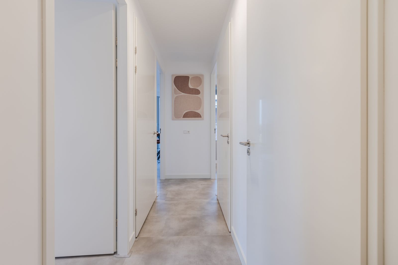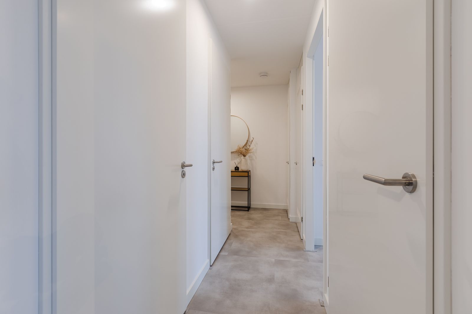 De gehele woning is voorzien van een strakke PVC-vloer met vloerverwarming en glad gestucte wanden, wat zorgt voor een rustige en hoogwaardige uitstraling.