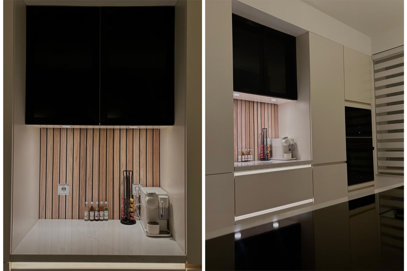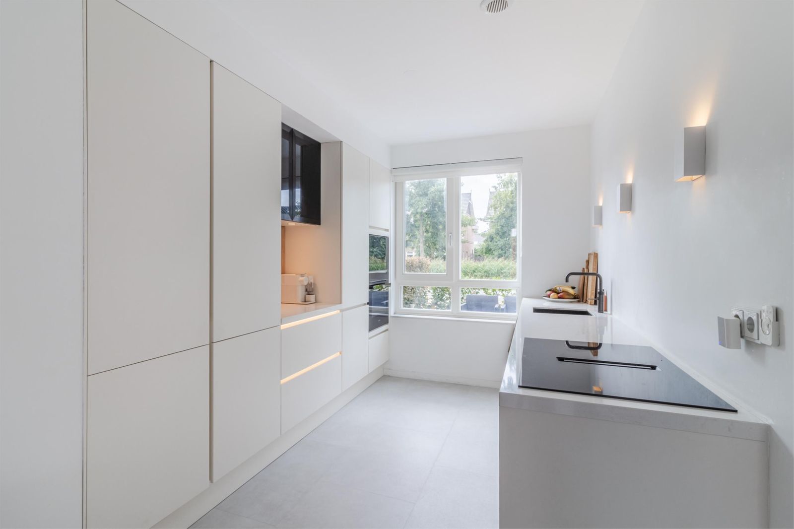 De moderne keuken is een echte eyecatcher en van alle gemakken voorzien. Dankzij de strakke opstelling heeft u veel werk- en opbergruimte. De keuken is uitgerust met: een Quooker-kraan voor direct kokend water, een oven, een magnetron, een vaatwasser, een ruime kookplaat met geïntegreerde afzuiging en als stijlvol detail een koffienis.