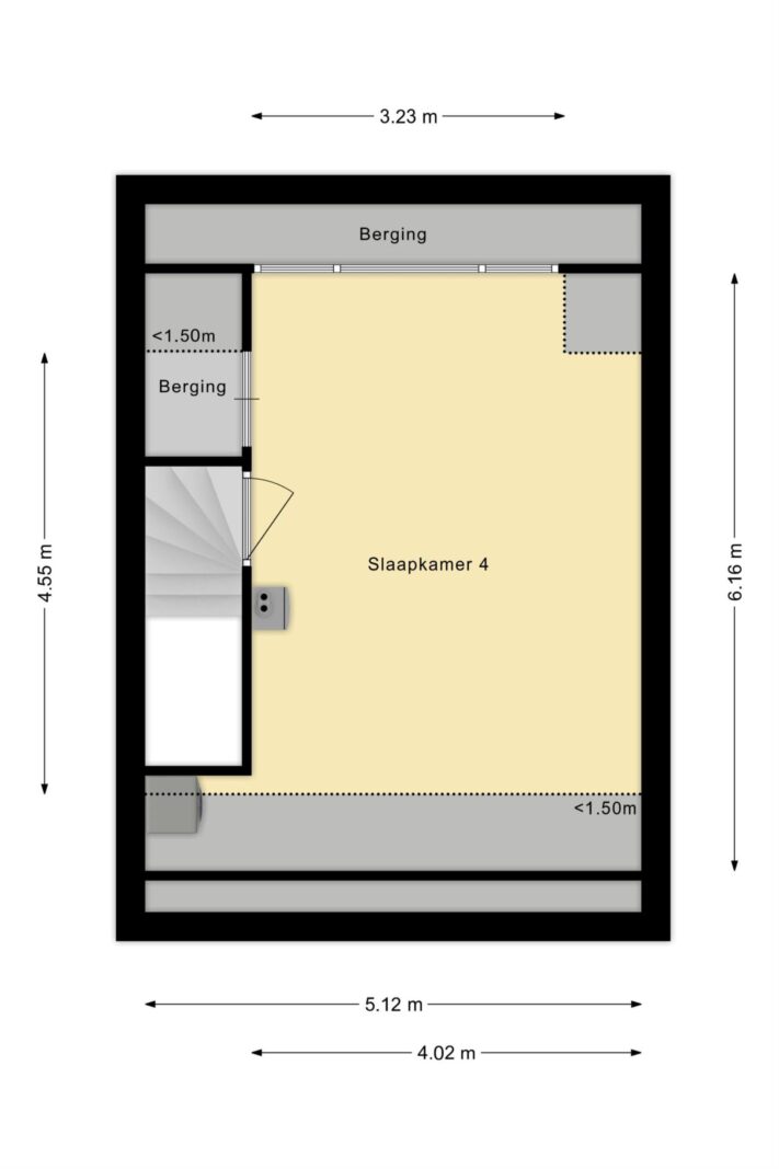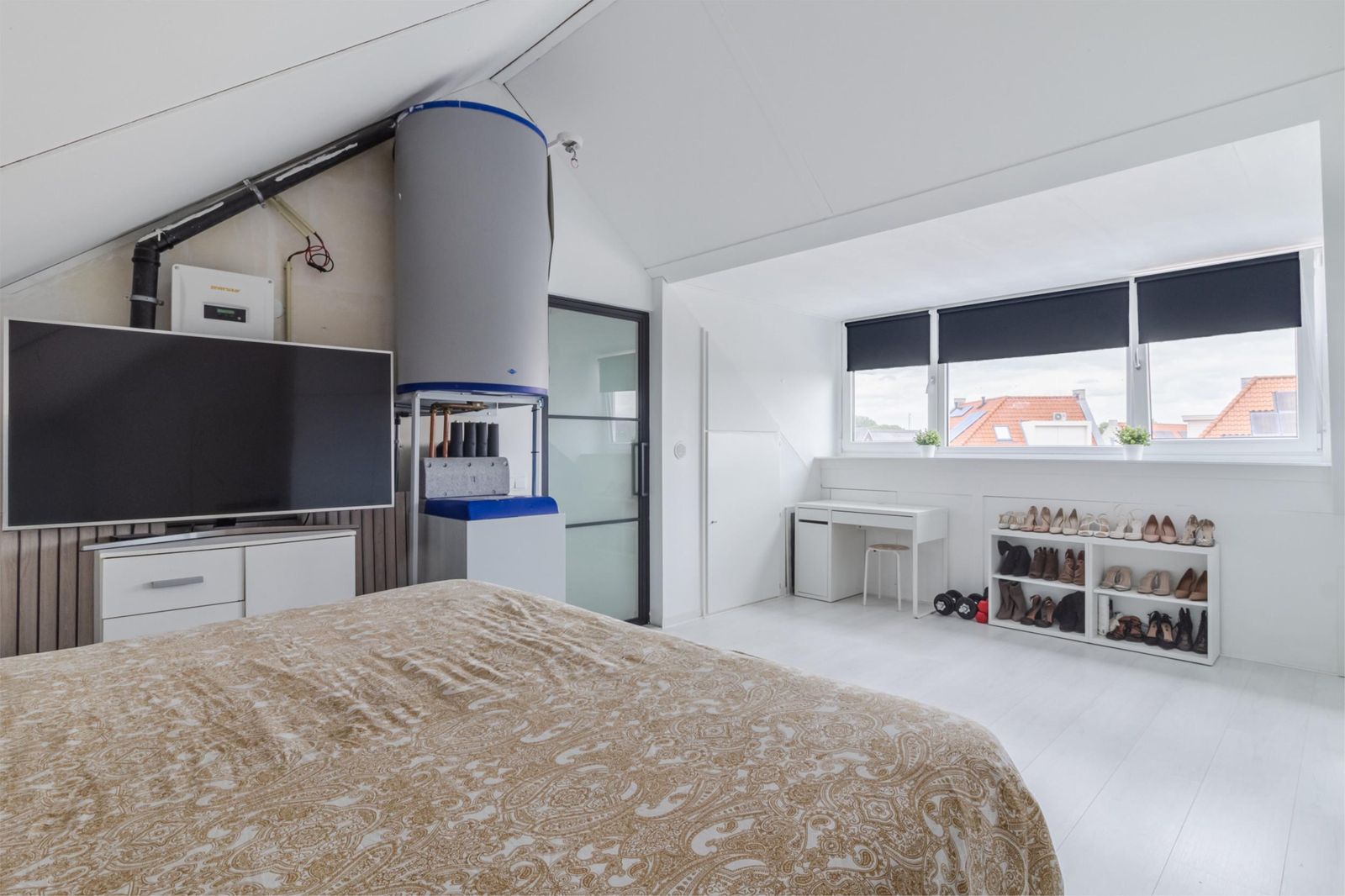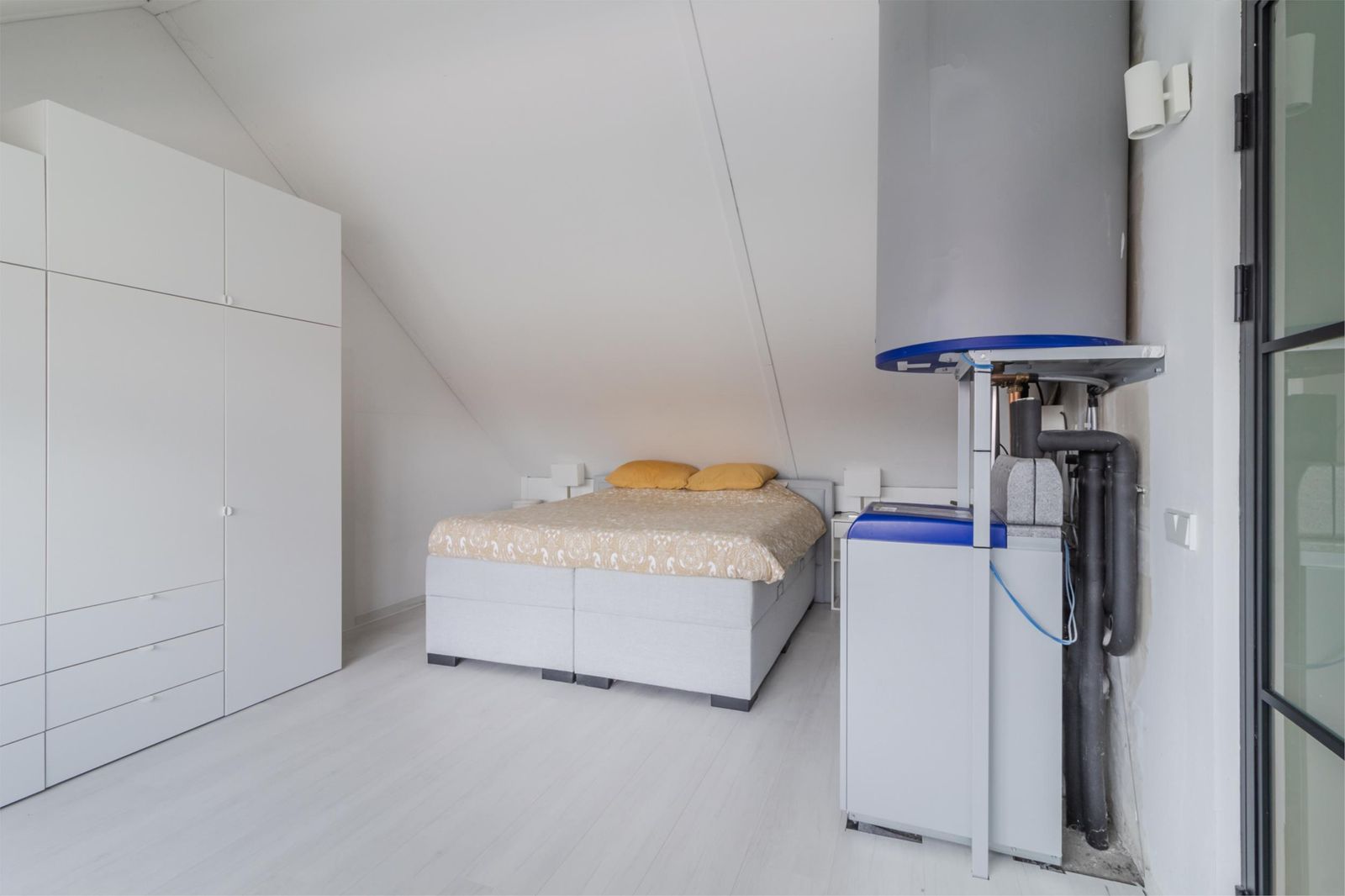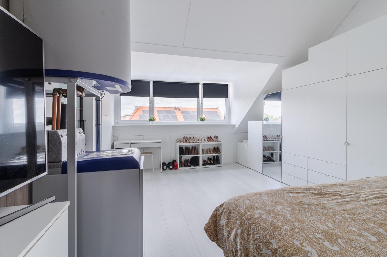 Open ruimte met veel licht dankzij het dakkapel, voorzien van stalen deur. Deze verdieping biedt mogelijkheden voor een extra kamer. Hier bevindt zich de warmtepomp en de technische installaties.