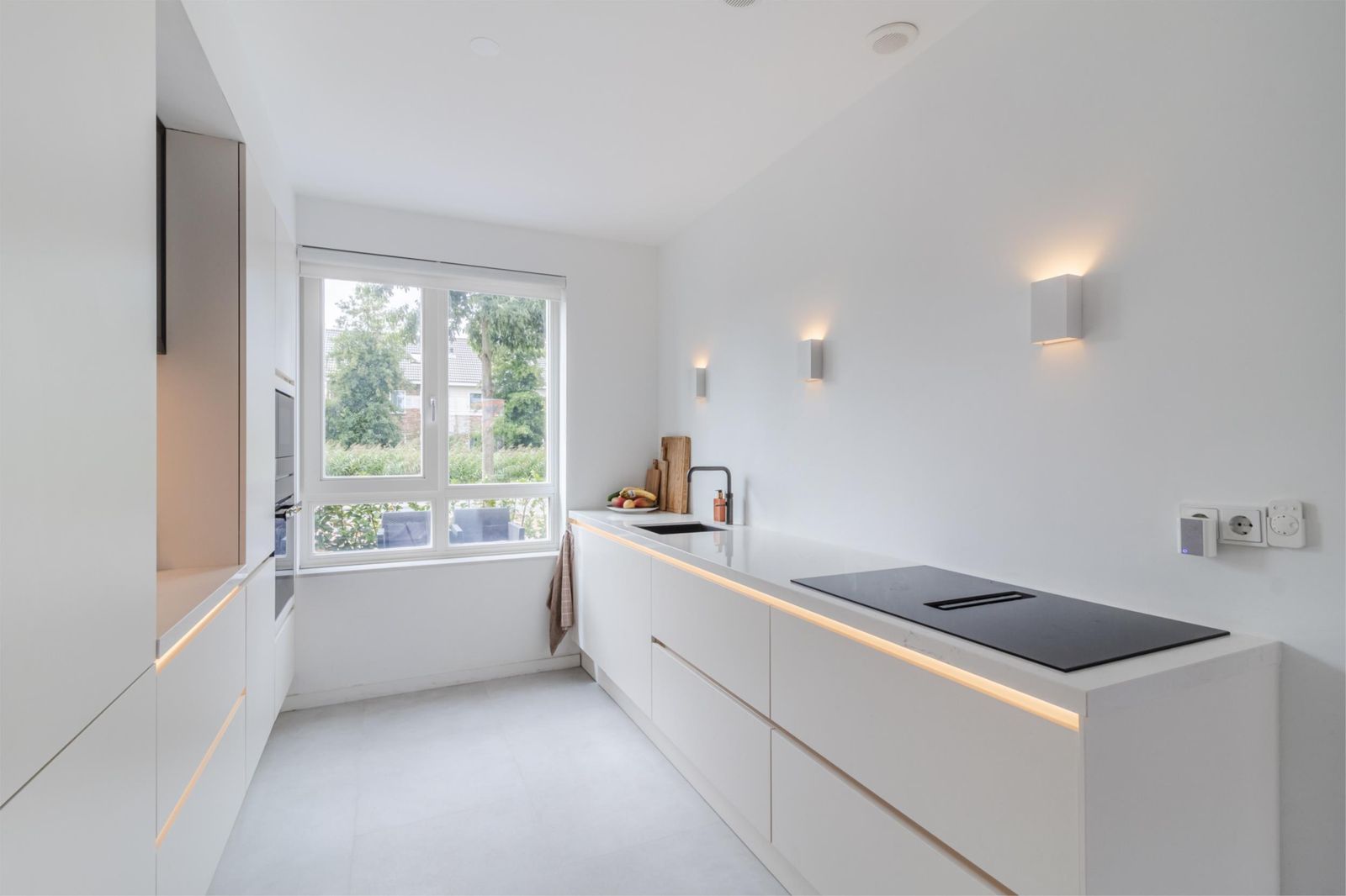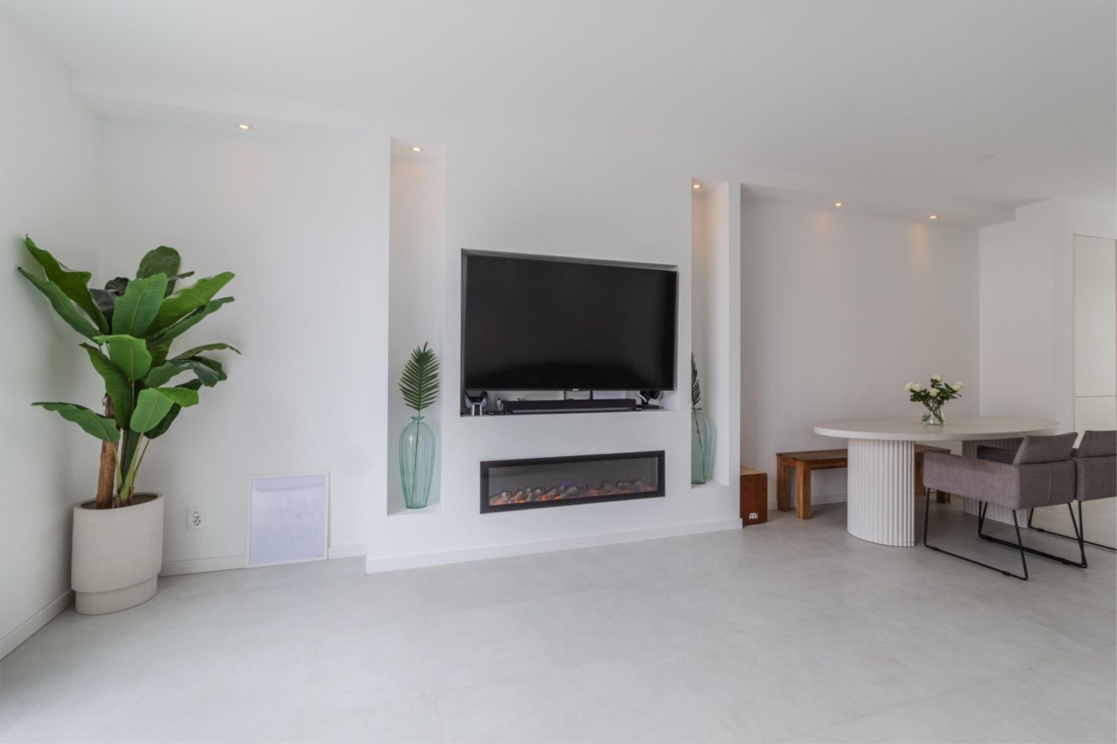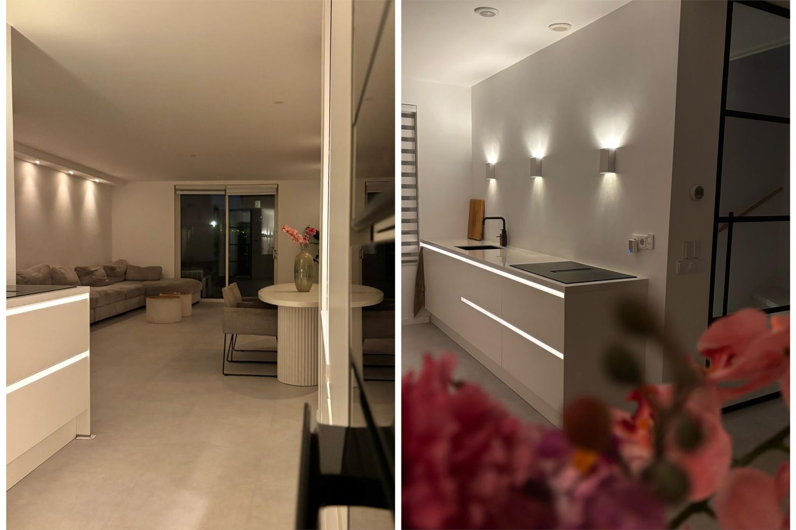 Aansluitend bevindt zich de woonkamer, met veel lichtinval door de schuifpui naar de achtertuin. De cinewall met sfeervolle ingebouwde sfeerhaard en de subtiel ingebouwde spots maken dit tot een warme en gezellige leefruimte. Een ruime voorraadkast met stalen deur biedt handige extra bergruimte.