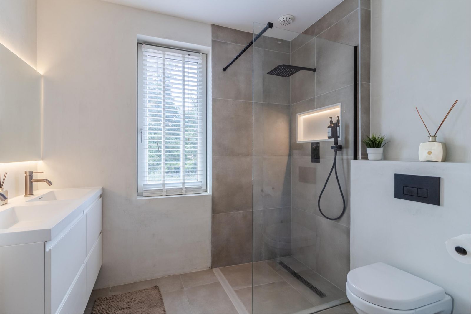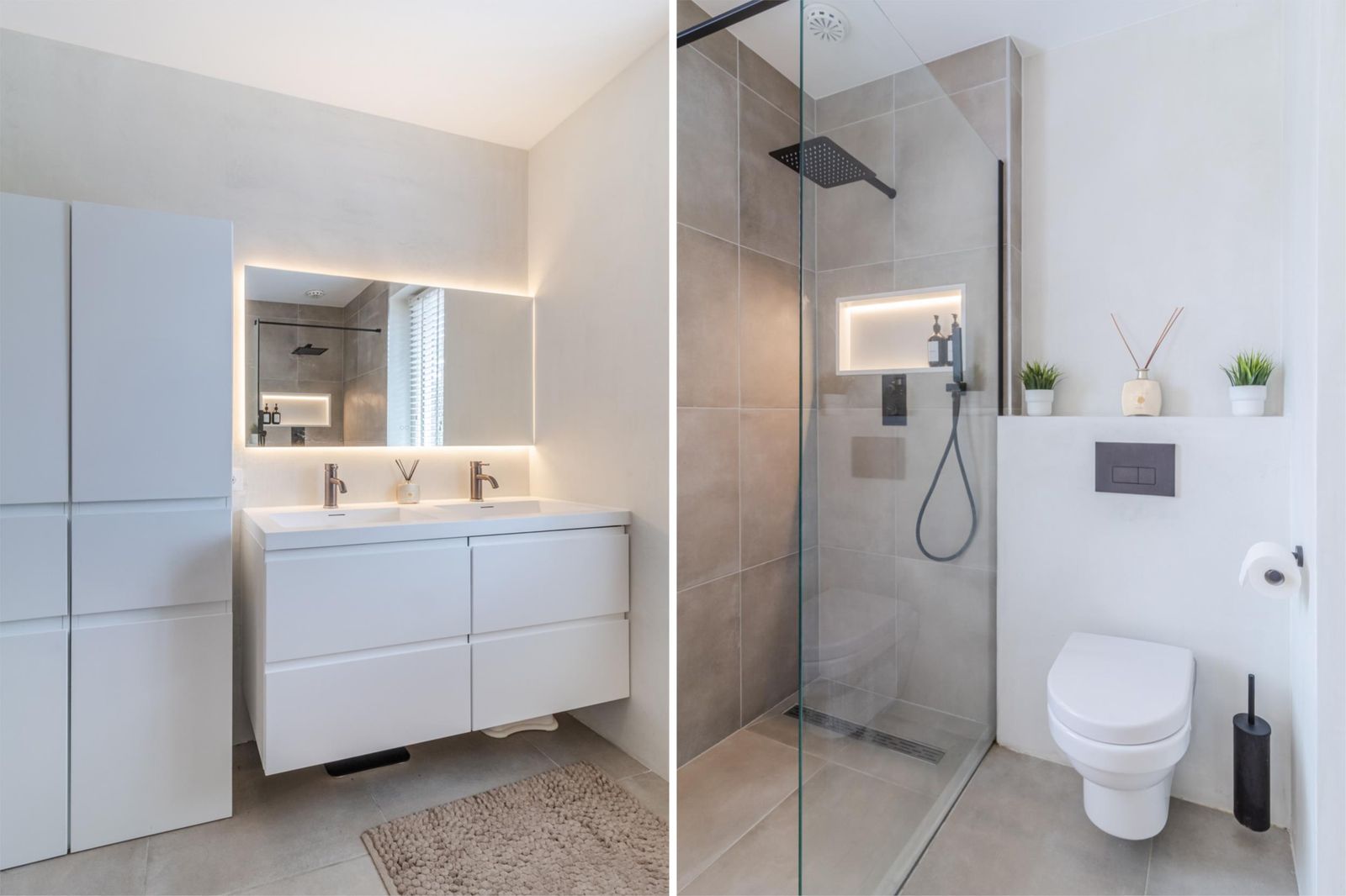 Overloop met moderne trapbekleding, drie slaapkamers en een luxe badkamer. De badkamer is stijlvol afgewerkt met beton ciré en beschikt over een dubbele wastafel met meubel, verlichte verwarmde spiegel, inloopdouche en tweede toilet.