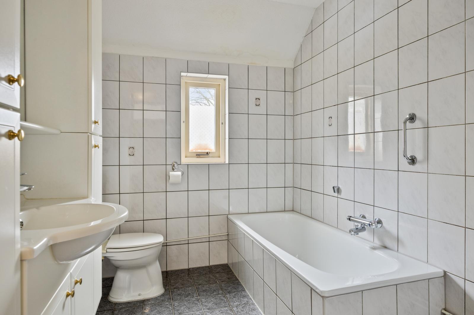 Via de trapopgang komt u op de overloop met toegang tot 2 slaapkamers, de badkamer en de vaste trap naar de 2e verdieping. De grote slaapkamer heeft zeer ruime afmetingen. In het verleden zijn er 2 slaapkamers samen gevoegd. Er zouden weer eenvoudig 2 slaapkamers van kunnen worden gemaakt. De ruime badkamer in compleet te noemen en heeft een ligbad, een douche, een toilet en een wastafelmeubel met genoeg opbergruimte. De badkamer is prettig tot aan het plafond betegeld.