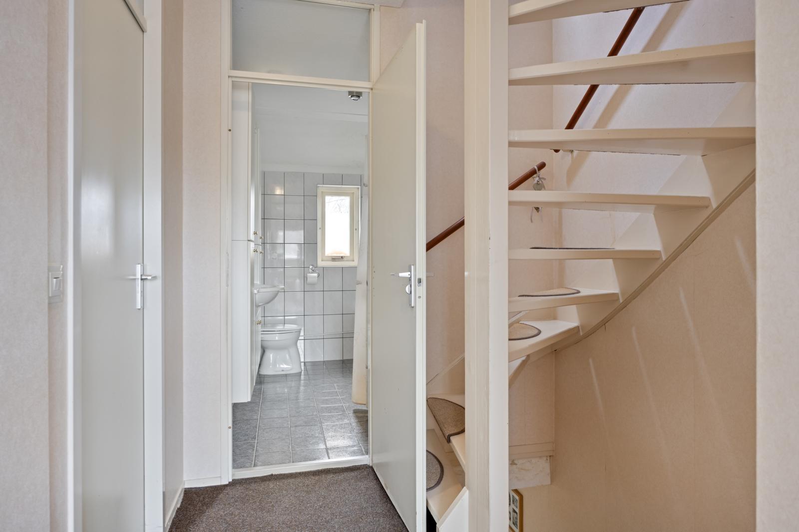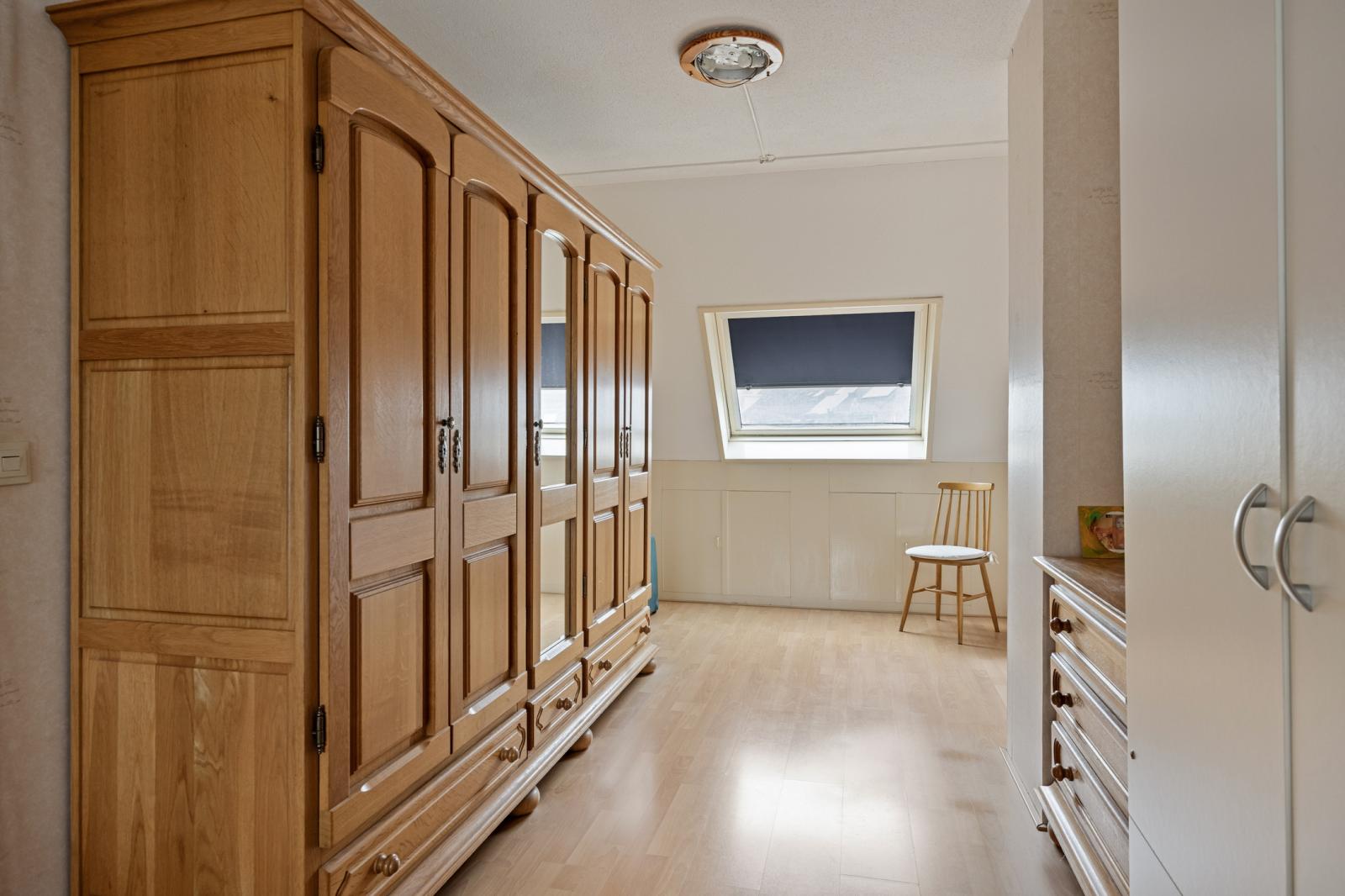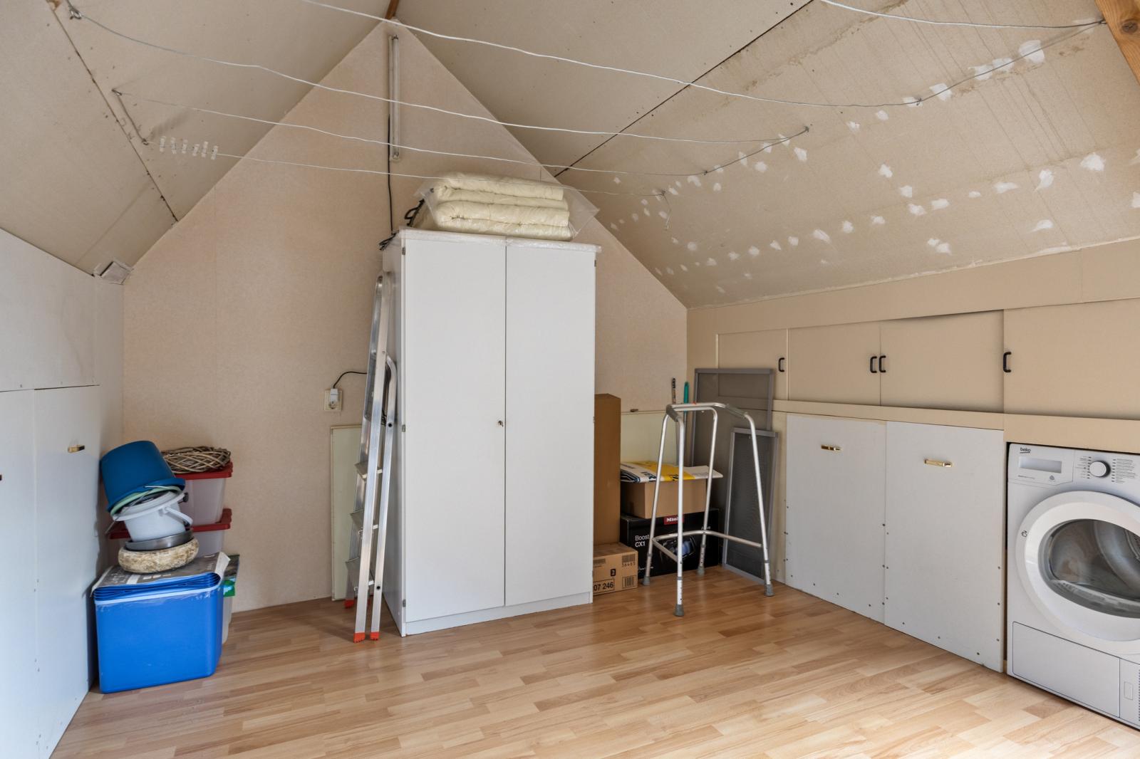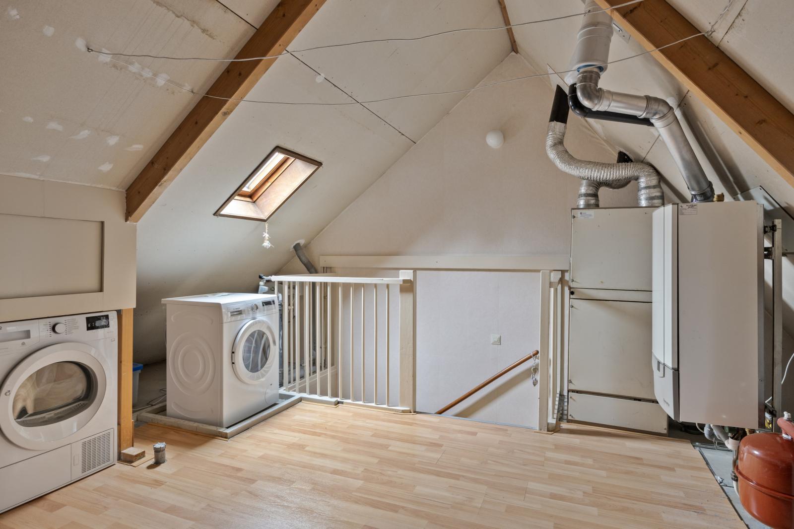 Via een vaste trap bereikt u de tweede verdieping. Op deze verdieping bevindt zich de de wasmachine-opstelling, de cv-installatie en de installatie van de heteluchtverwarming. Op deze verdieping is eenvoudig een extra slaapkamer of een thuiswerkplek te realiseren. Ook heeft deze verdieping veel vaste kastruimte onder het lage deel van het hellend dak.