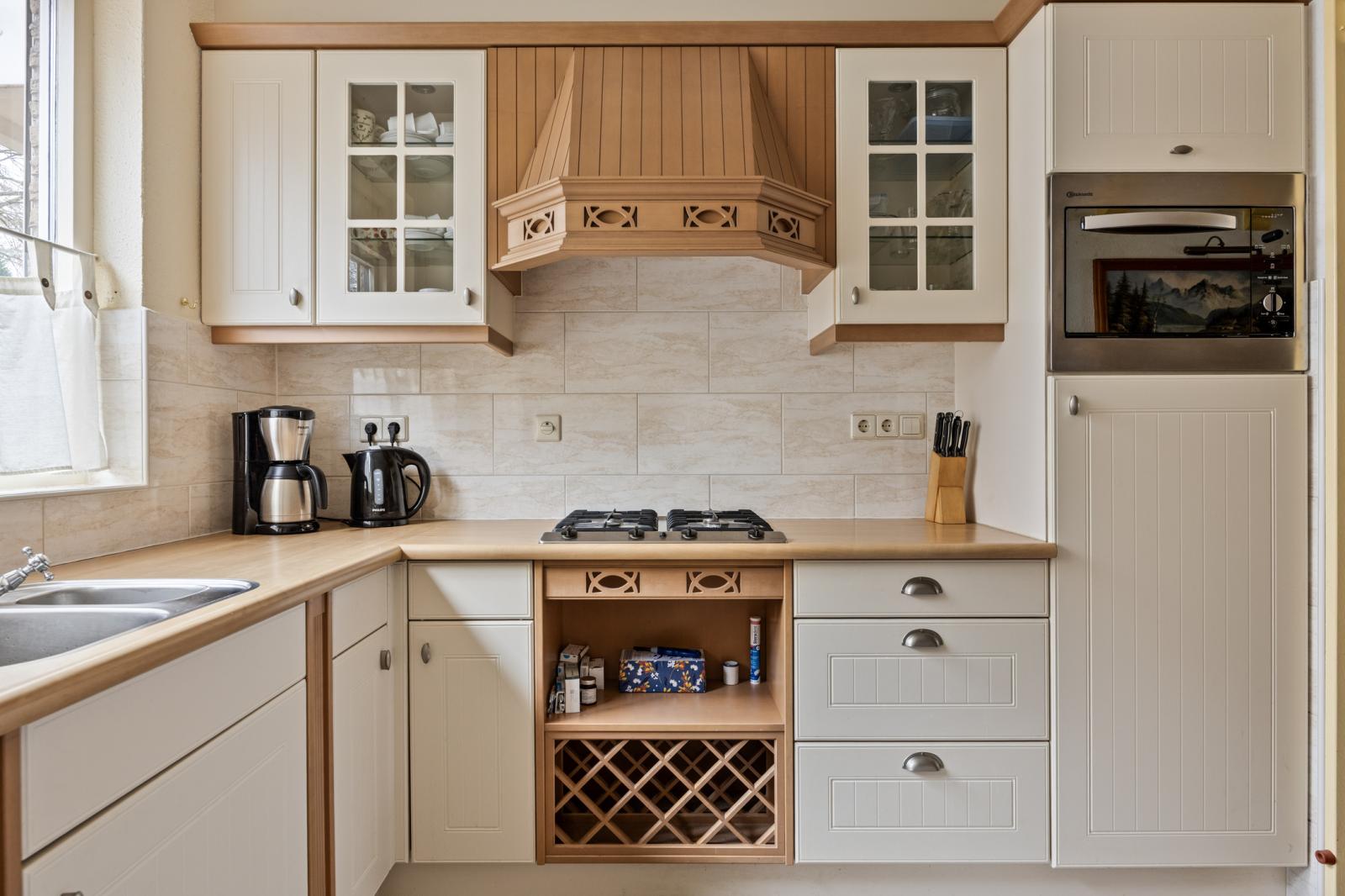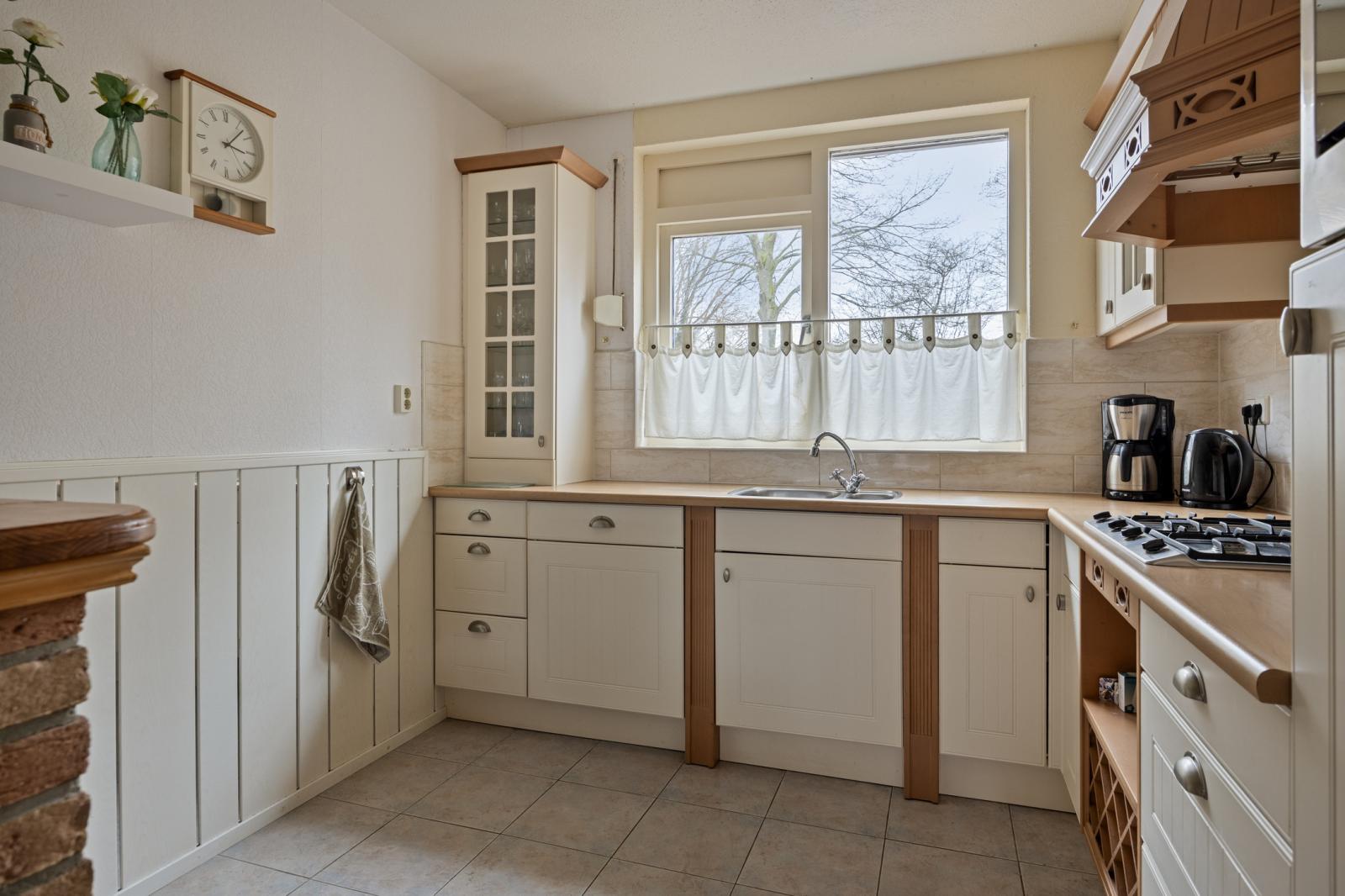 De keuken is uitgerust met een gaskookplaat en is voorzien van inbouwapparatuur. De grote raampartijen maken de woonkamer en keuken als geheel prettig licht. De keuken biedt voldoende kastruimte, wat de keuken tot een praktisch prima plek maakt. Vanuit het keukenraam ziet prettig uit over de voortuin en hebt u vrij uitzicht op het wandelpad en de groenstrook aan de overzijde van de straat.