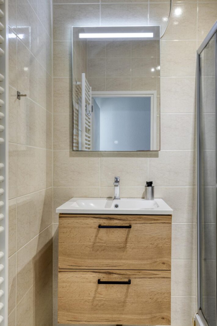 Entree met hal, meterkast en toegang tot de badkamer welke is voorzien van een hangend toilet, douchecabine en wastafelmeubel, was- en cv-ruimte met hr-ketel uit 2024, een slaapkamer en de lichte woonkamer met open keuken. De keuken is voorzien van inbouwapparatuur. In de woonkamer bevindt zich aan de voorzijde een kleine loggia.