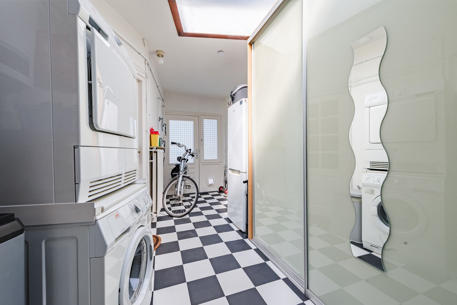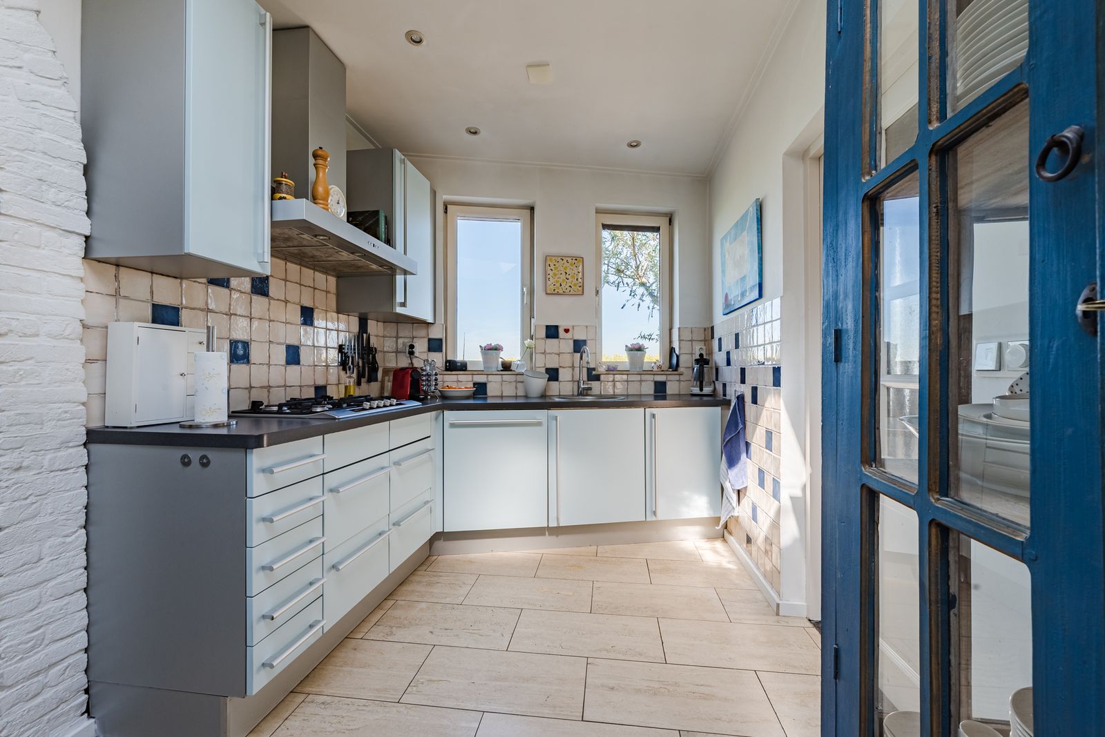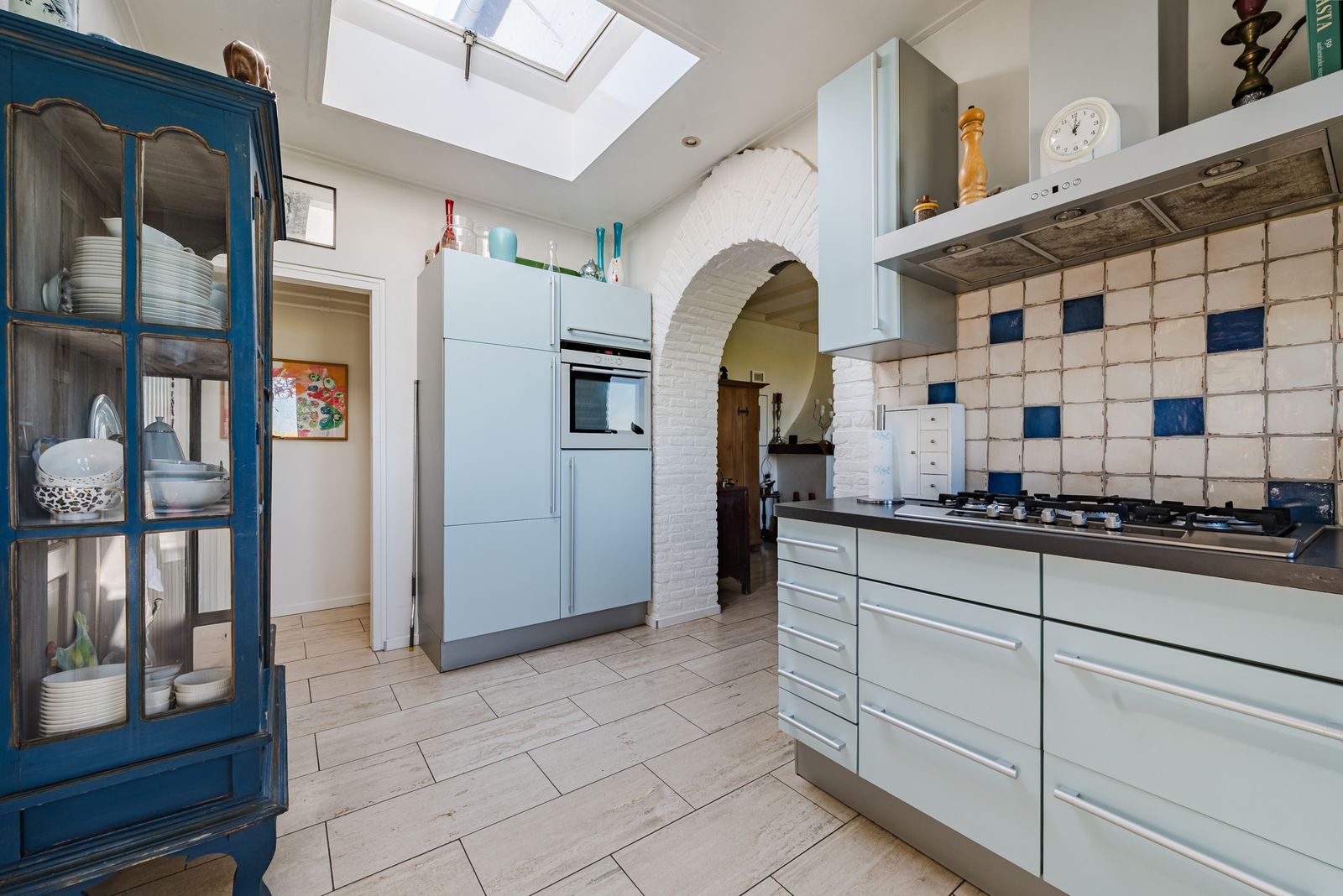 De halfopen keuken bevindt zich links en afgaand op de steen in de boog tussen woonkamer en keuken met daarop ‘anno 1984’ gaan we ervan uit dat dit gedeelte in die periode is aangebouwd. Hier liggen ook de complete badkamer en de (aparte) wc. Via een hal met buitendeur is een ruime bijkeuken bereikbaar, die dienst kan doen als was-, fietsen- en rommelhok.