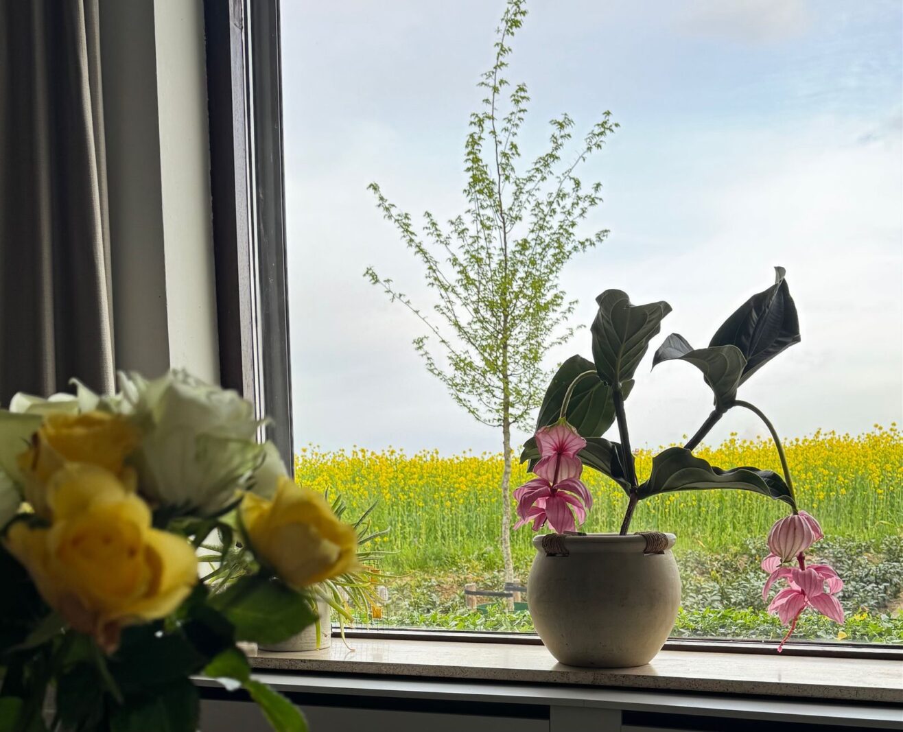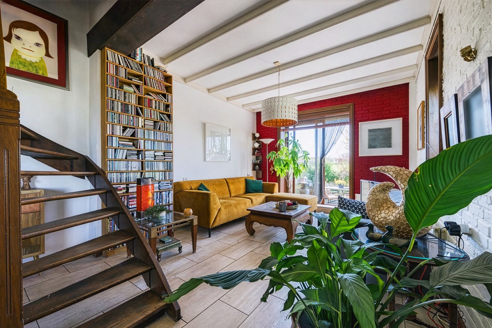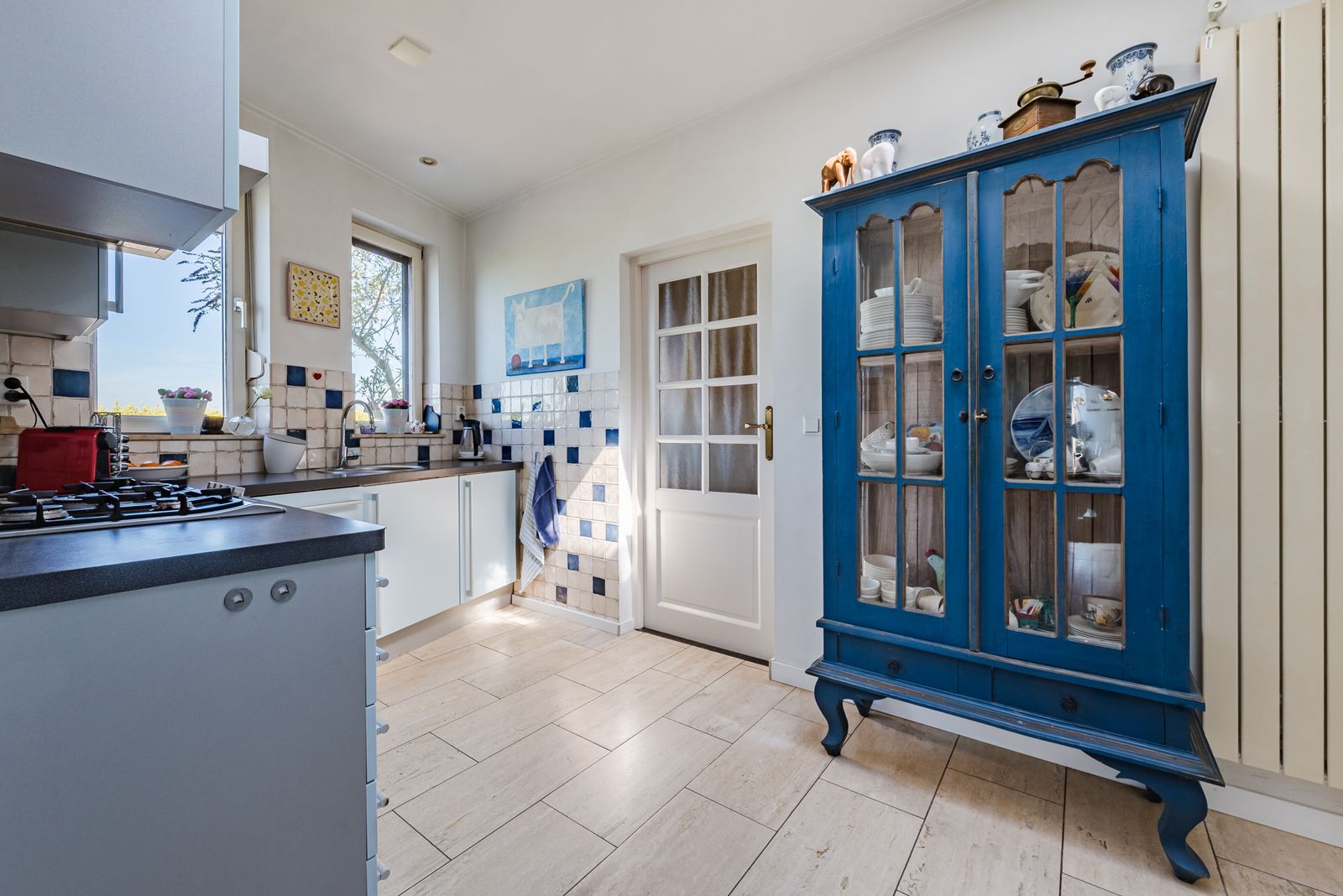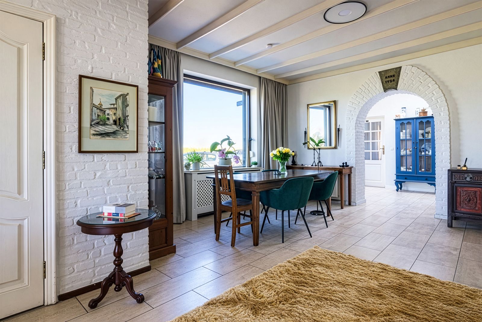 Het grote raam in de woonkamer is een levend schilderij. Op dit moment staan de gele bloemetjes van het koolzaad er te wuiven; links lopen koeien vredig te grazen in de wei. Het is een genot om te zien hoe blij ze zijn als ze na de winter weer naar buiten mogen.