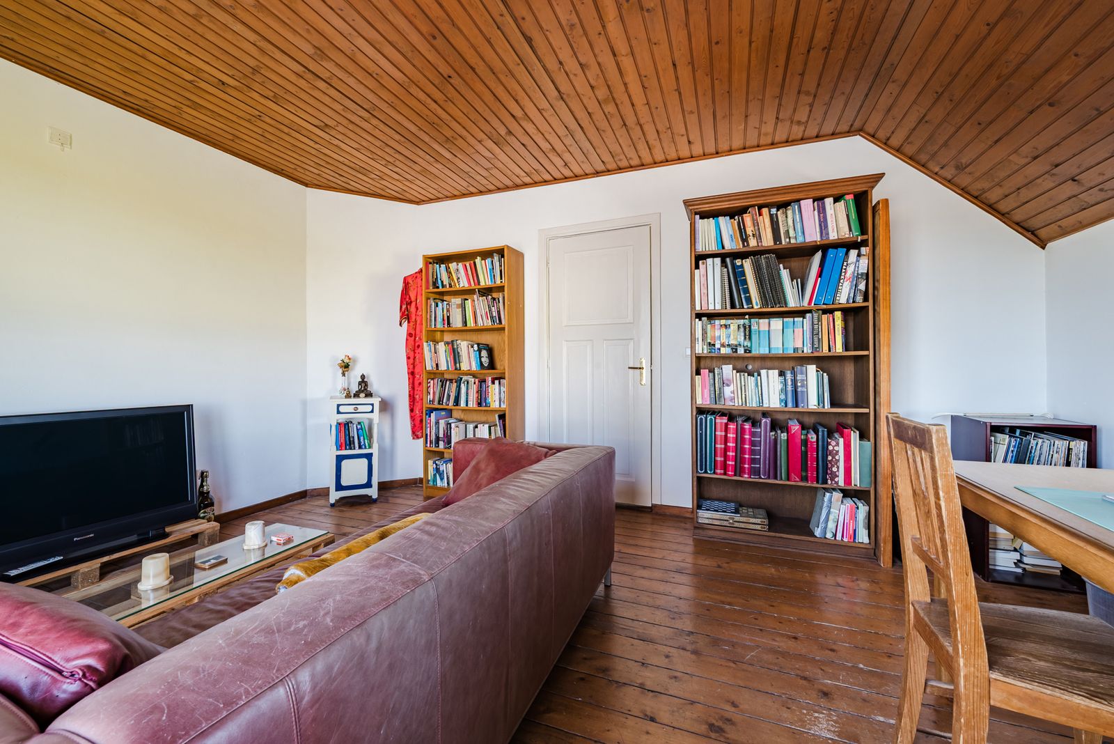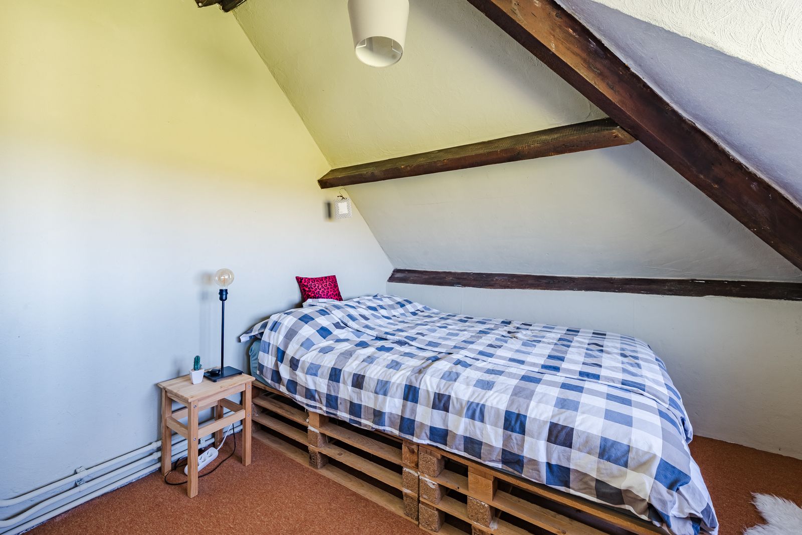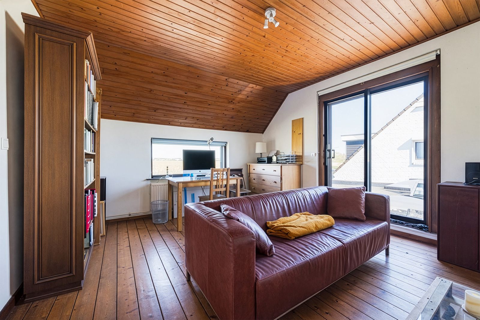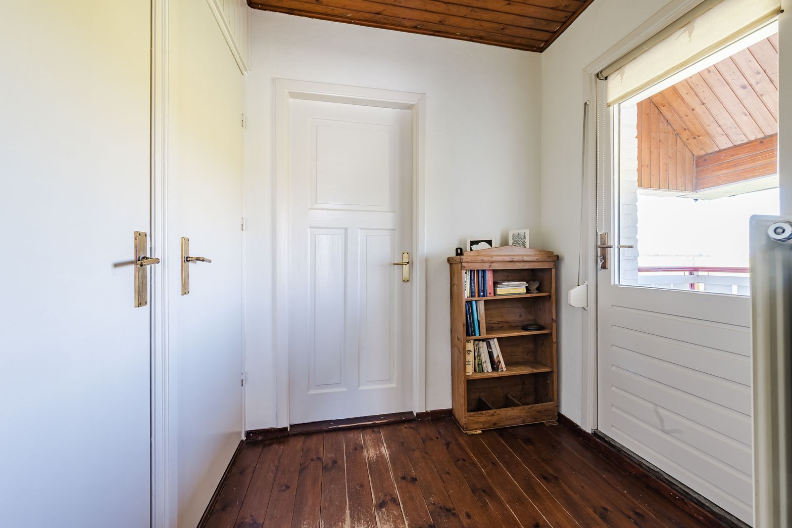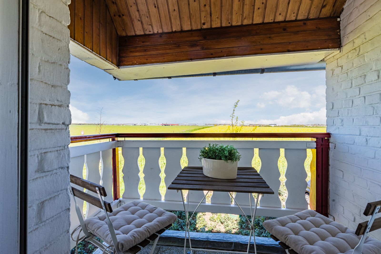 Via een authentieke houten gedraaide trap in de woonkamer beland je op de overloop, die grenst aan twee ruime slaapkamers en tevens toegang biedt tot een heuse loggia: een overdekt balkonnetje met uitzicht op adembenemende zonsondergangen. Een schuifpui in een van de kamers geeft toegang tot het platte dak van de aanbouw waarvan een creatieve geest een fraai dakterras zou kunnen maken.