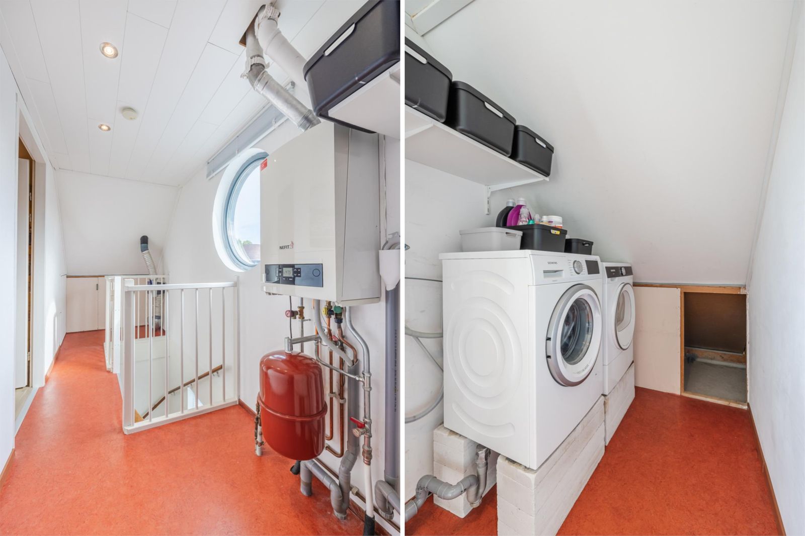 Op zolder bevindt zich een aparte technische ruimte met CV-installatie met aansluiting voor wasmachine en droger. Hier bevindt zich tevens een ruime slaap-/hobbykamer met een kleine extra vliering. Op de achterzijde van het dak zijn 22 zonnepanelen aanwezig die huis en tuin volledig kunnen voorzien van de elektra behoefte.