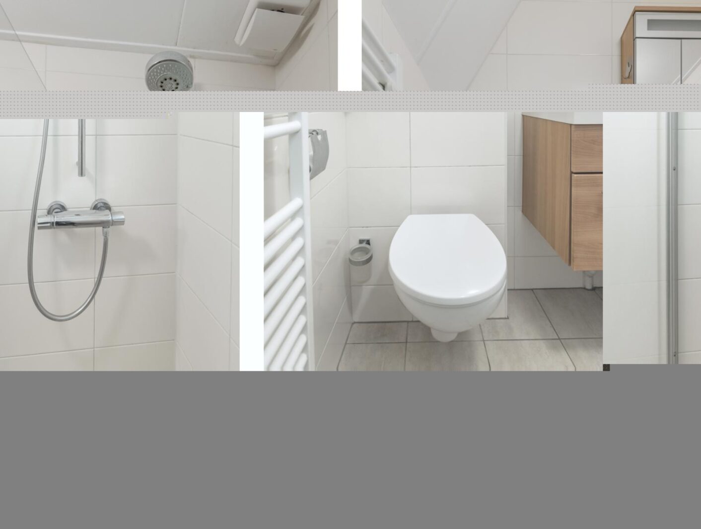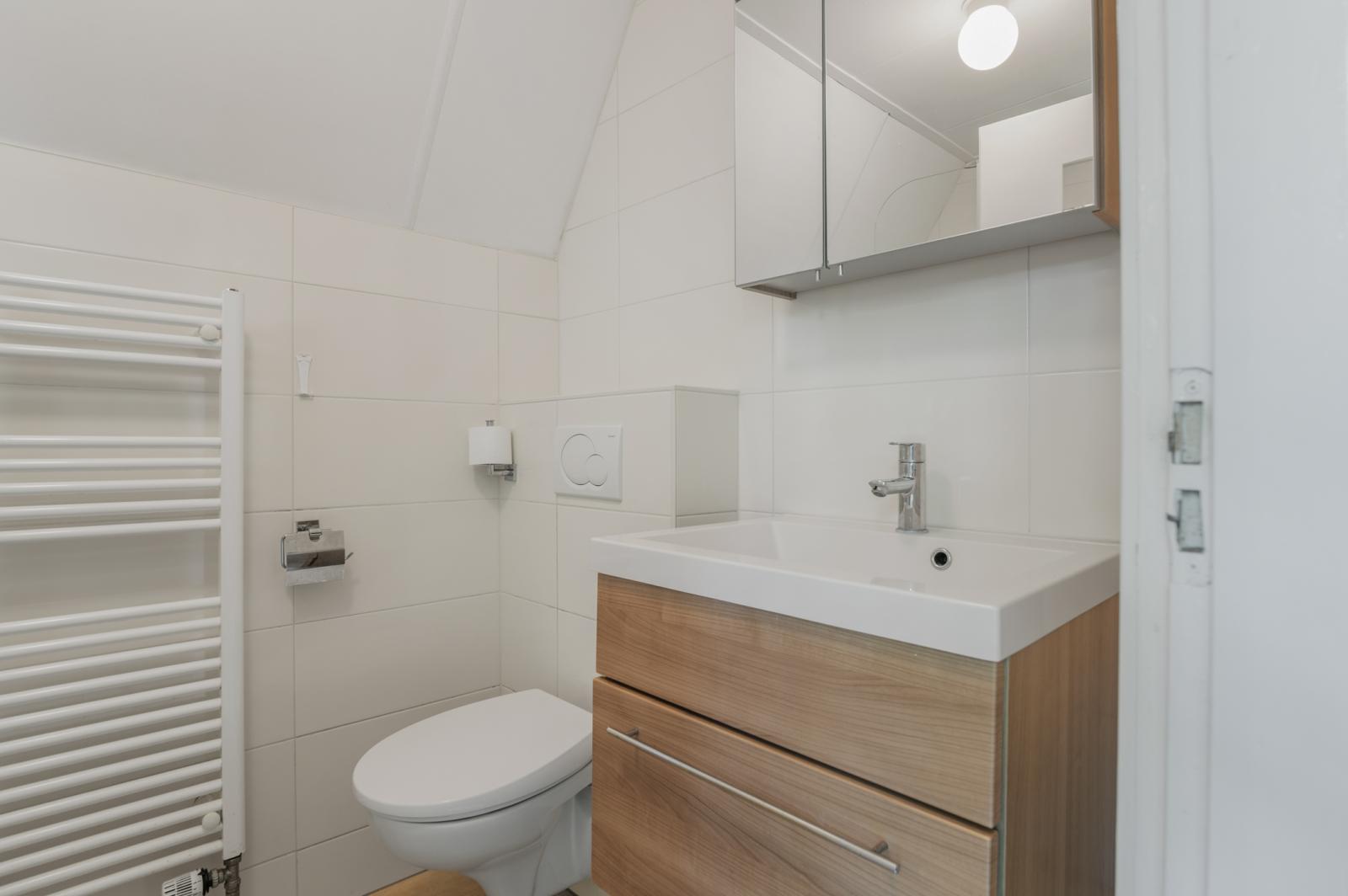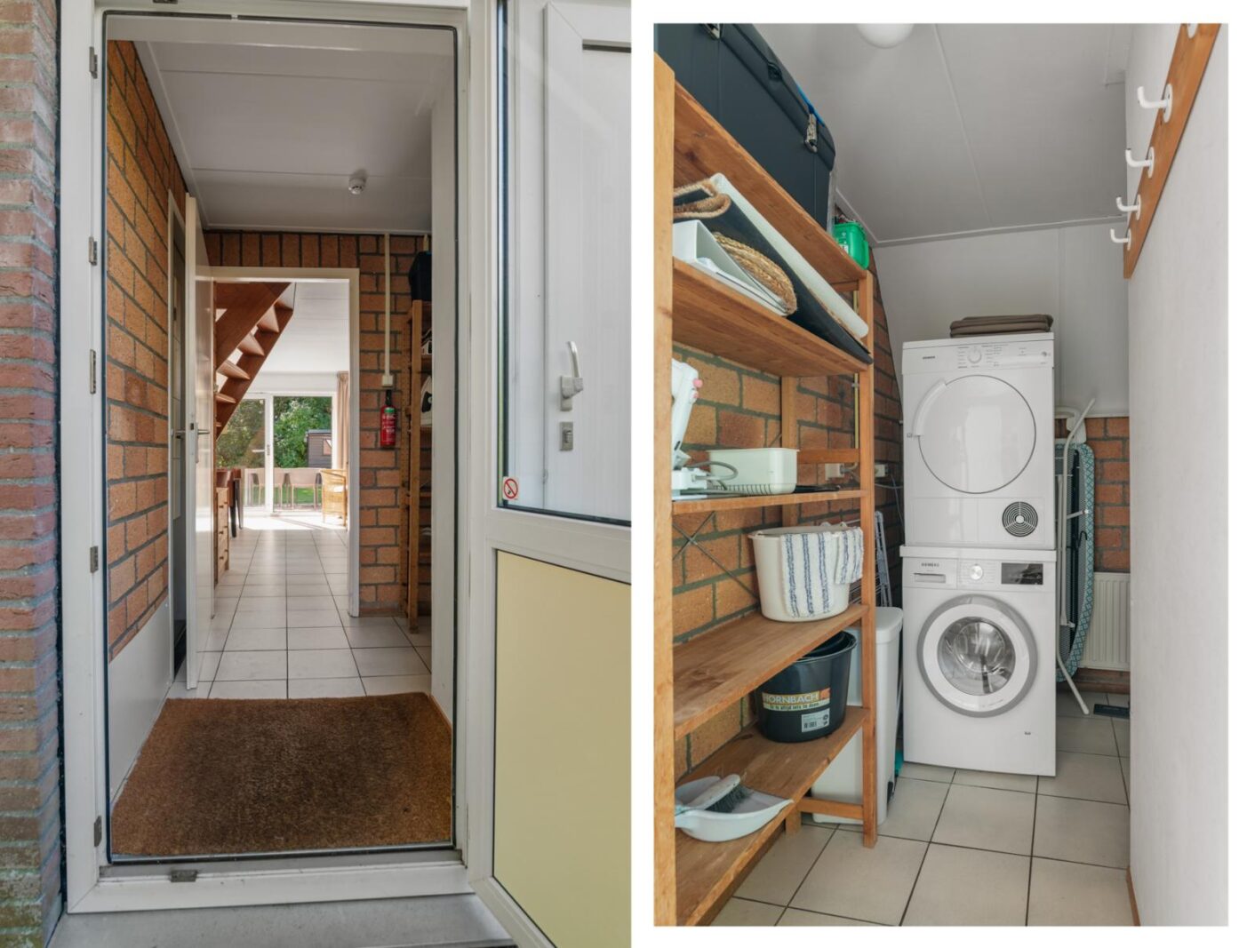 Je komt de woning binnen en komt dan in een ruime hal met aansluitend de bijkeuken. Hier vind je de was- en droogmachine (blijven achter), de cv-ketel en extra bergruimte. Ook de badkamer bevindt zich hier, voorzien van een douchehoek, wastafel en toilet.