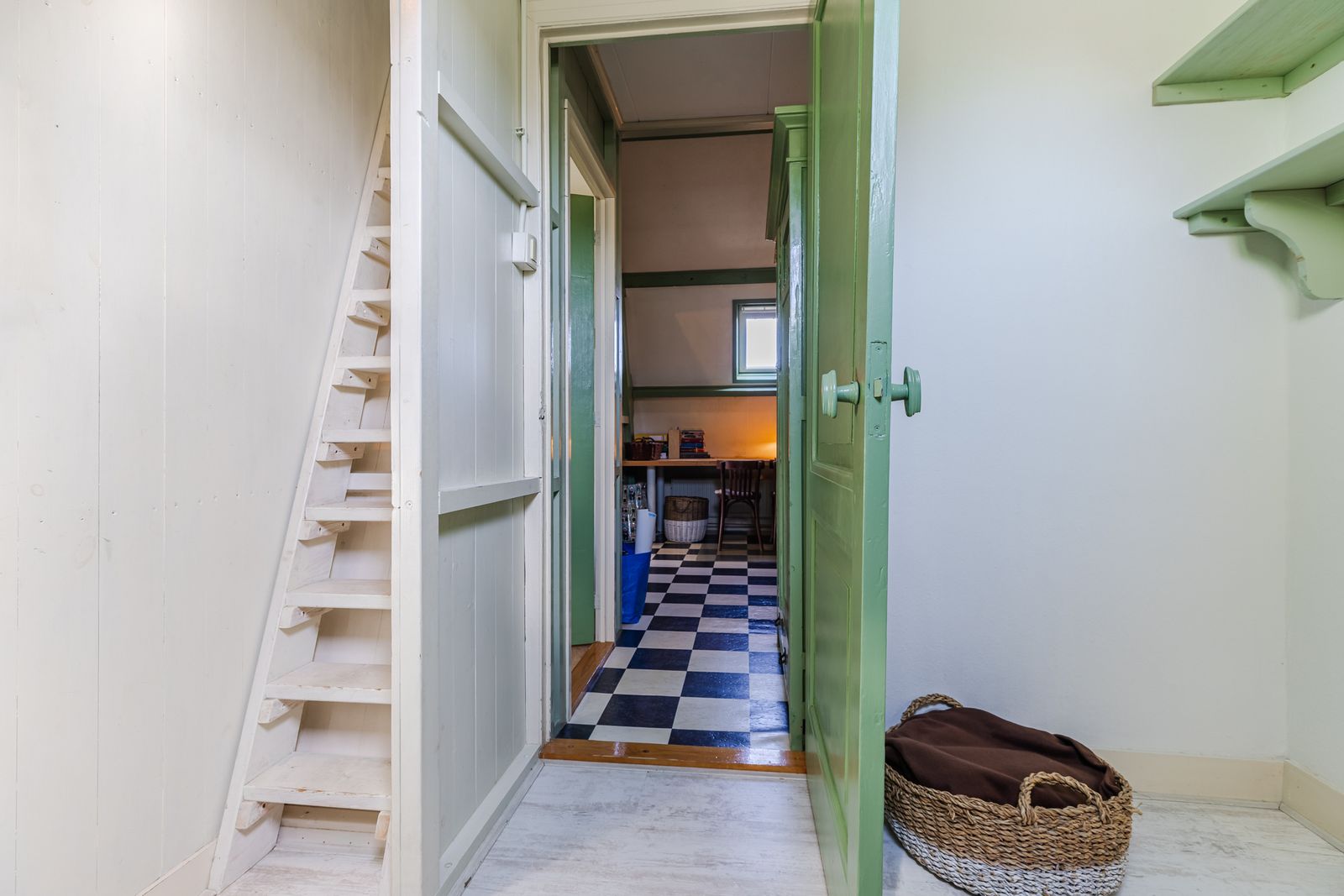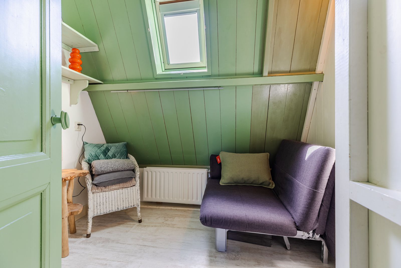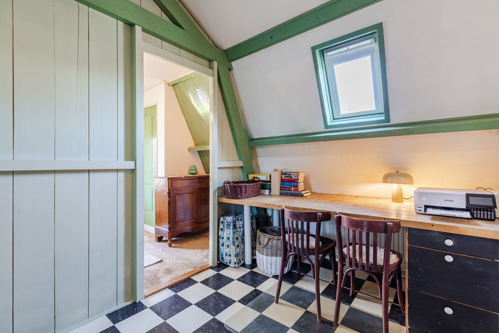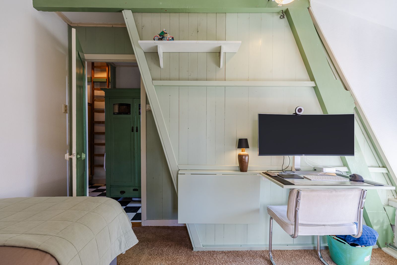 De overloop beschikt over een vaste werkplek en geeft toegang tot drie veelzijdige kamers. De houten dakconstructie is zichtbaar gelaten, wat bijdraagt aan de authentieke uitstraling. Via een losse trap bereik je de vliering, ideaal als extra bergruimte.