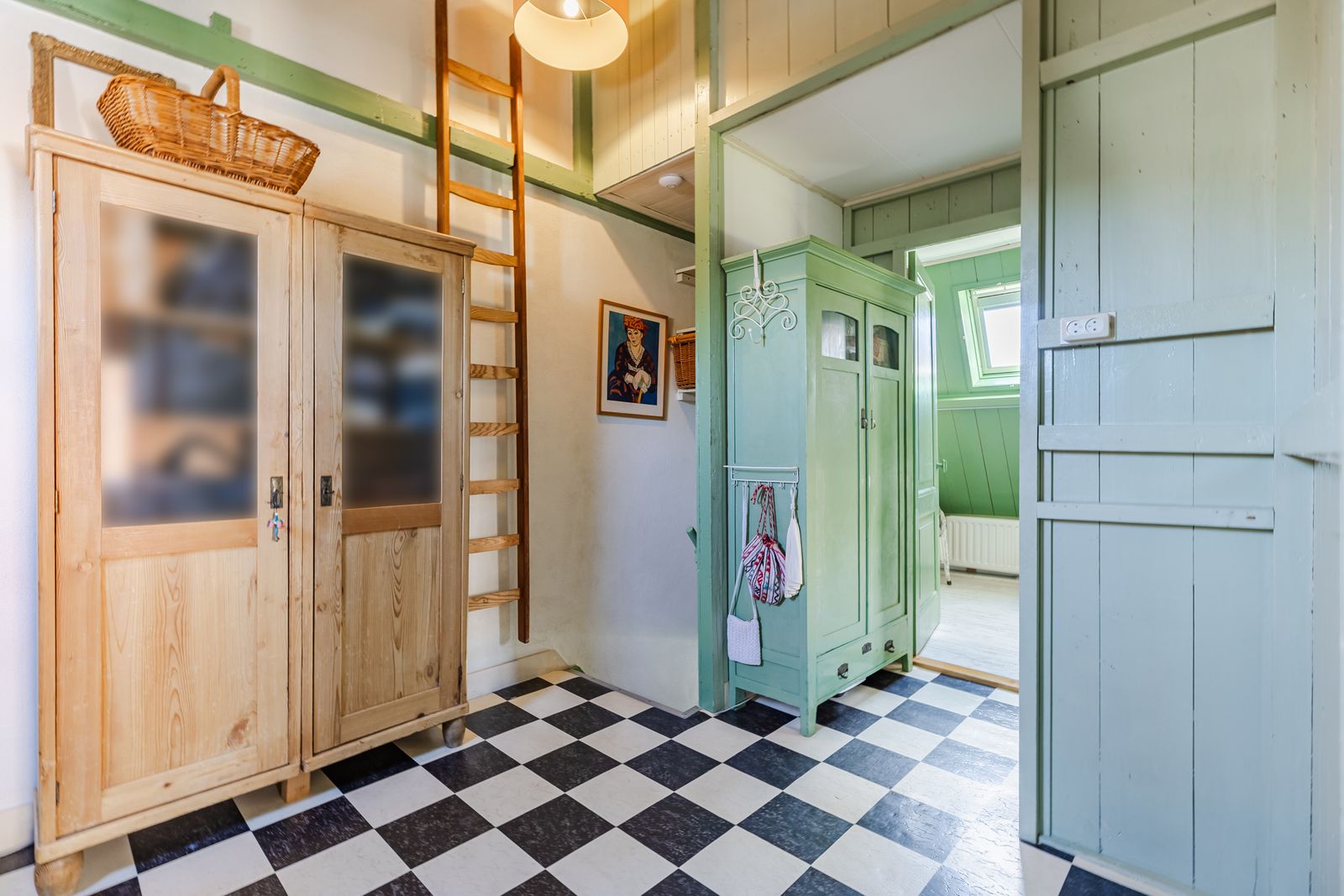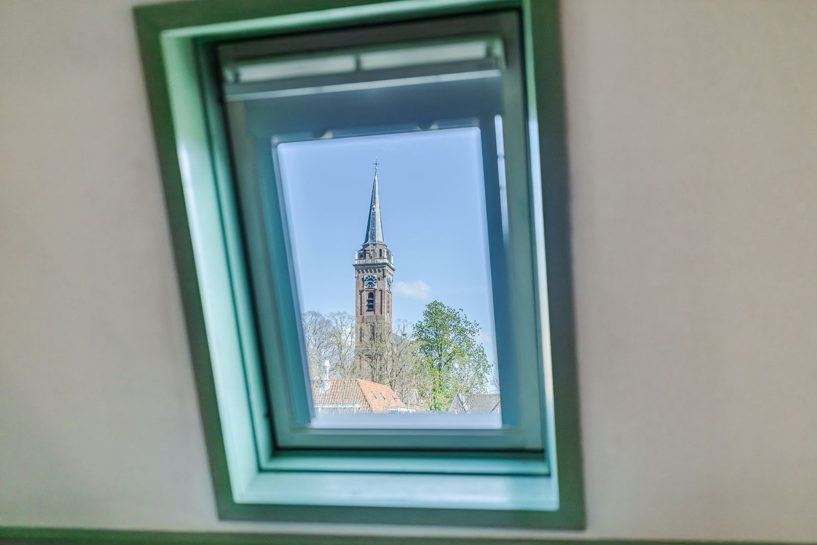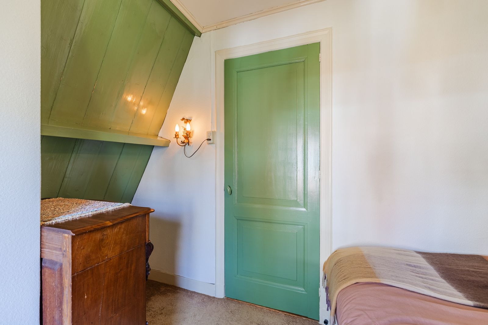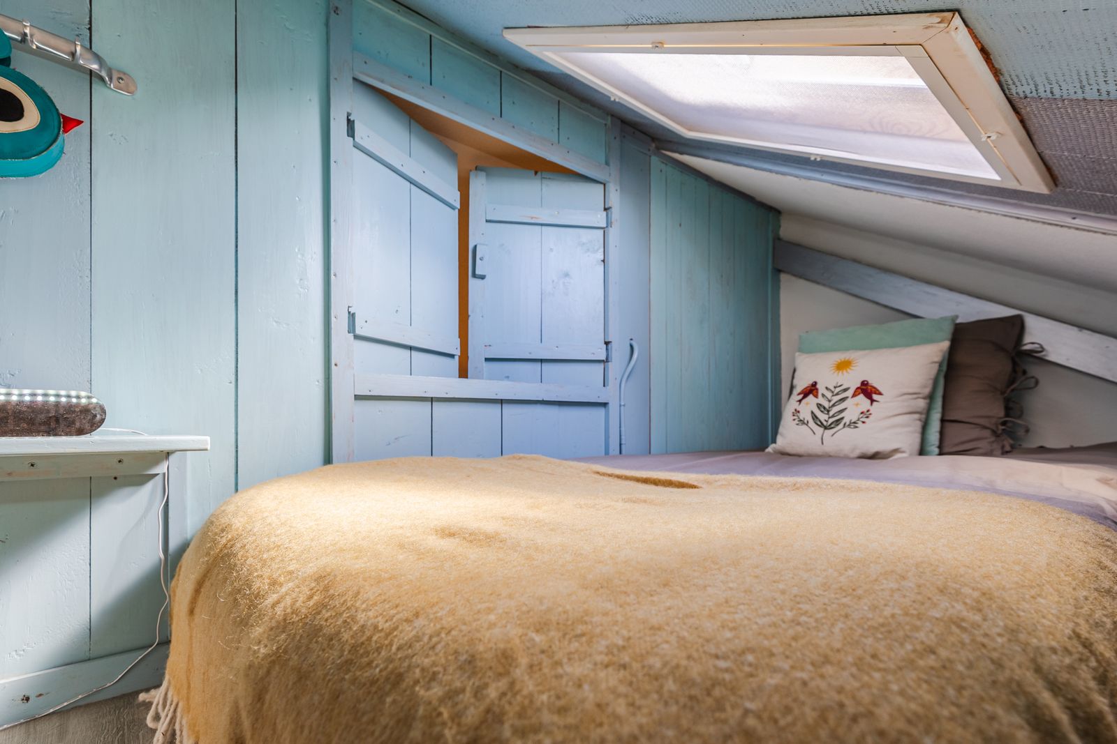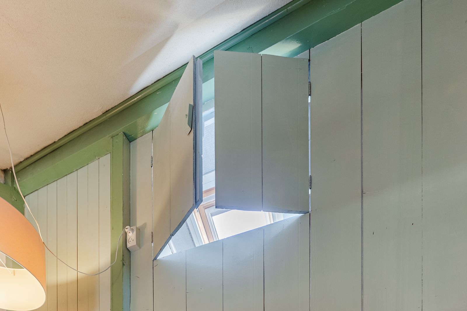 De overloop beschikt over een vaste werkplek en geeft toegang tot drie veelzijdige kamers. De houten dakconstructie is zichtbaar gelaten, wat bijdraagt aan de authentieke uitstraling. Via een losse trap bereik je de vliering, ideaal als extra bergruimte.
