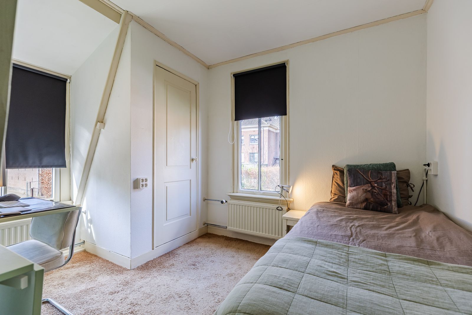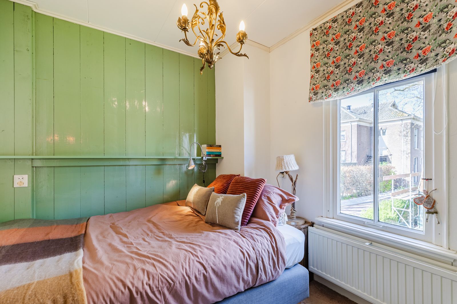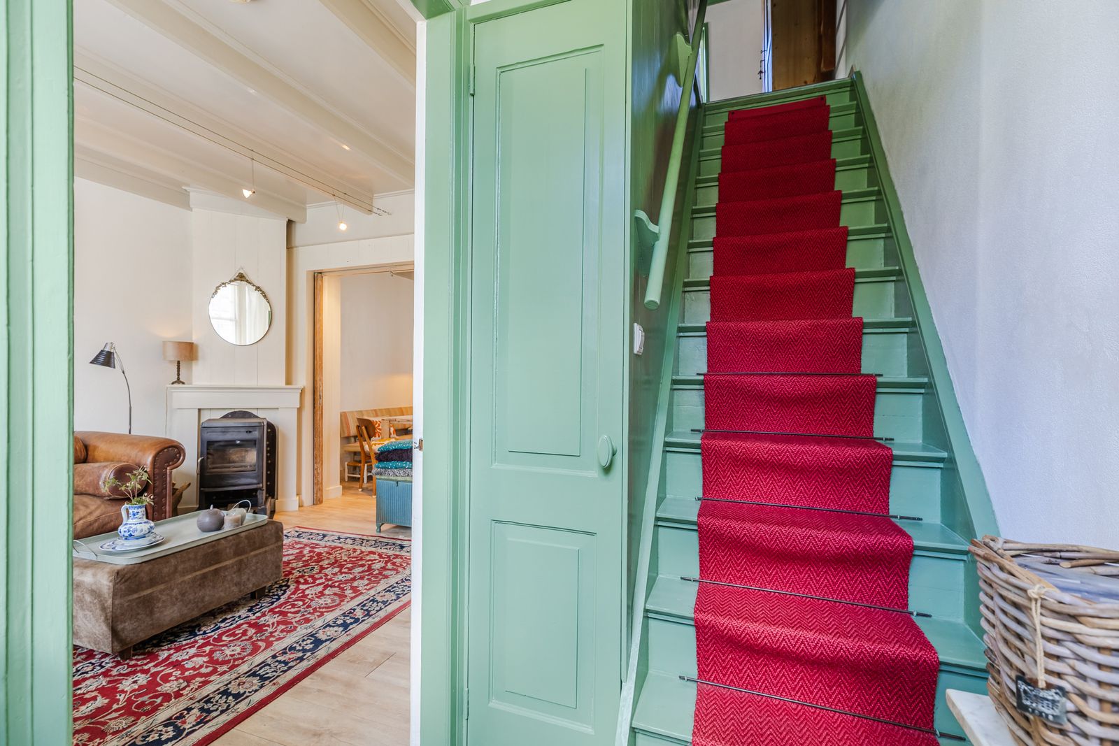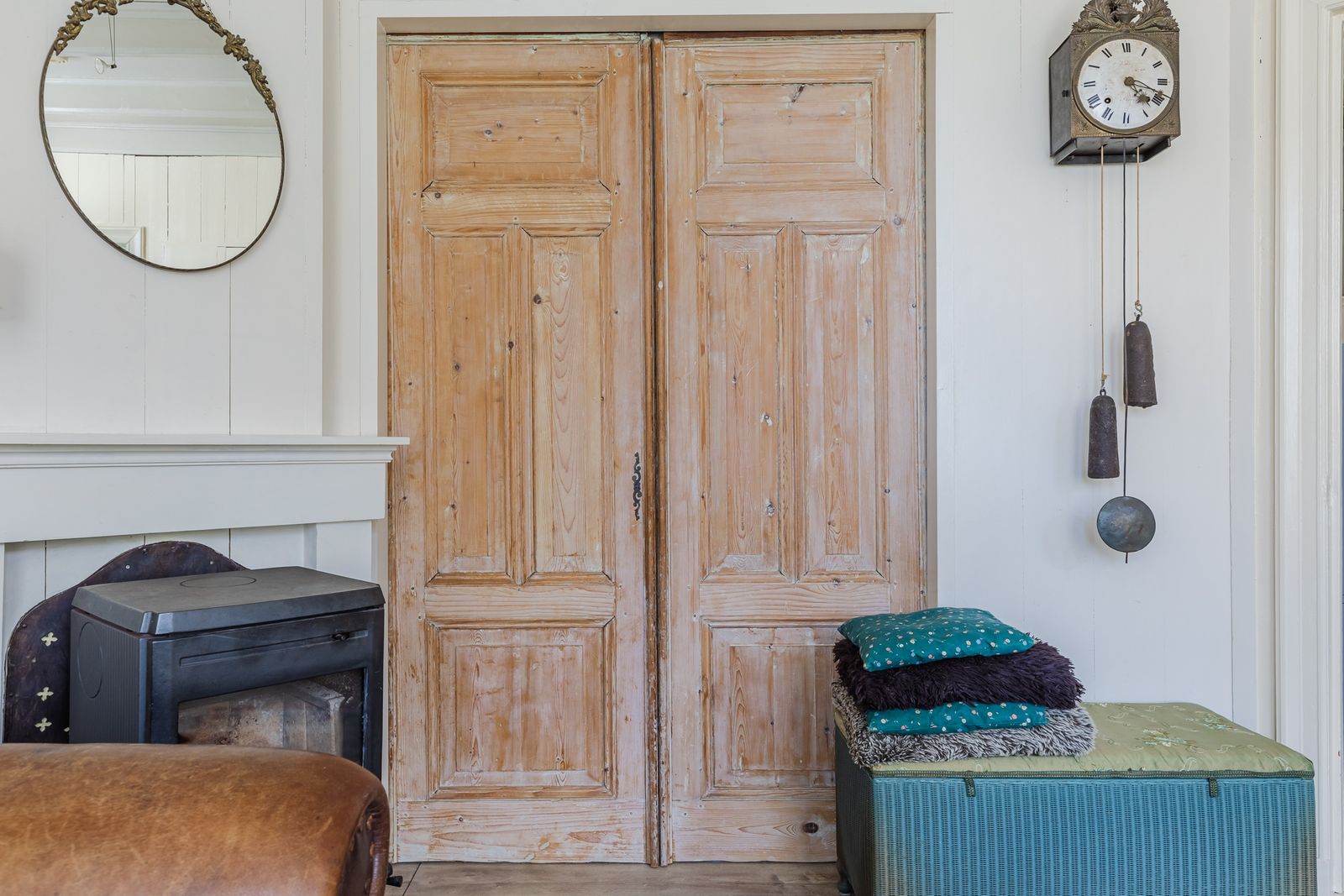 De overloop beschikt over een vaste werkplek en geeft toegang tot drie veelzijdige kamers. De houten dakconstructie is zichtbaar gelaten, wat bijdraagt aan de authentieke uitstraling. Via een losse trap bereik je de vliering, ideaal als extra bergruimte.